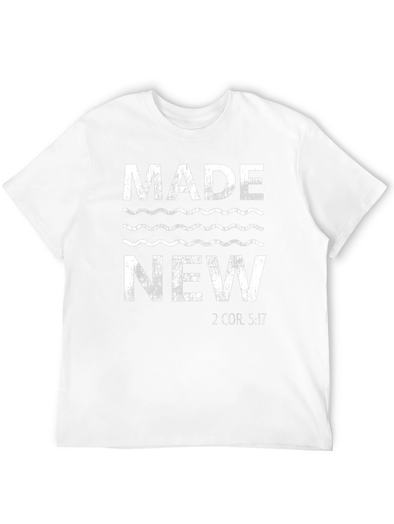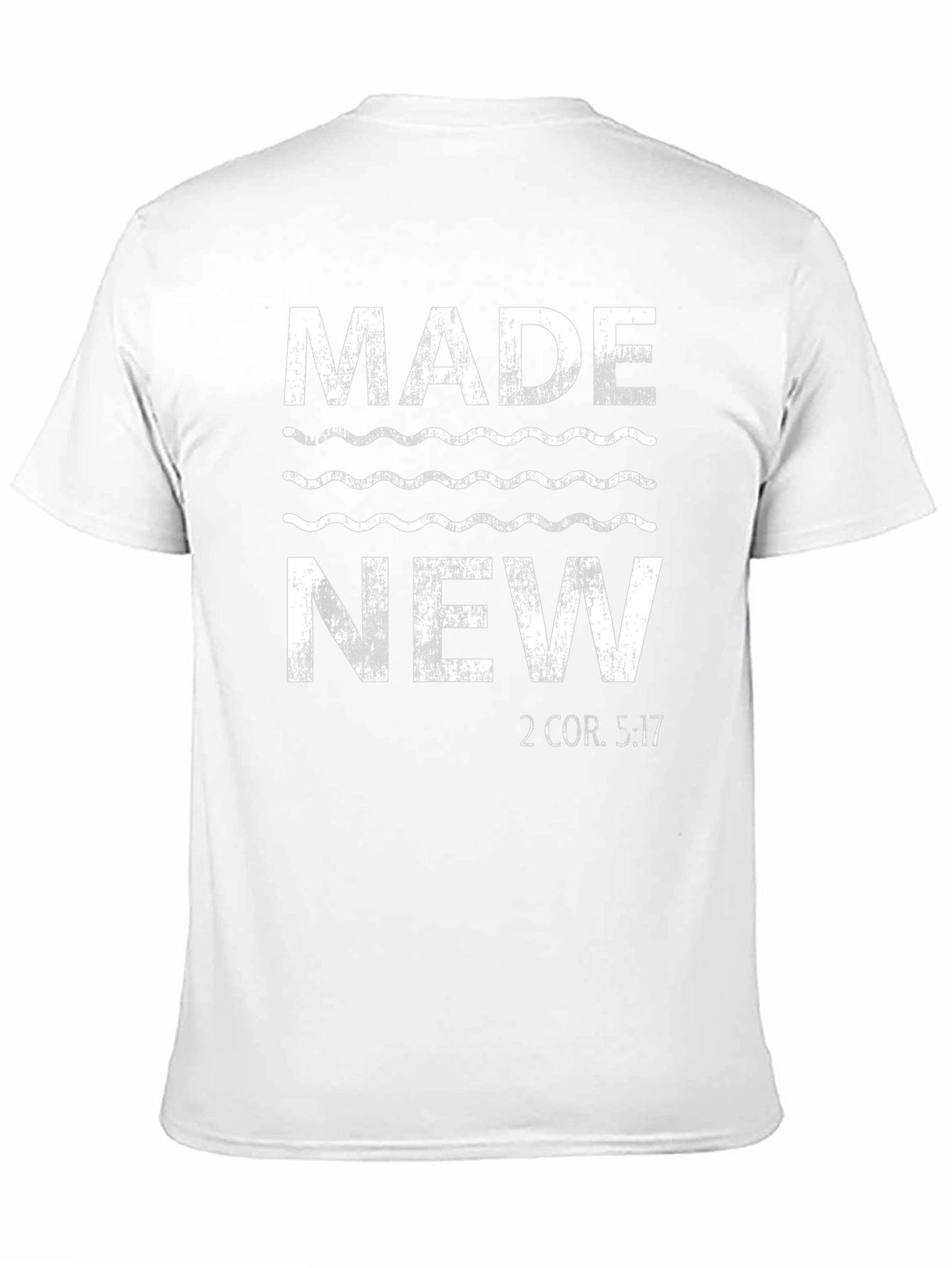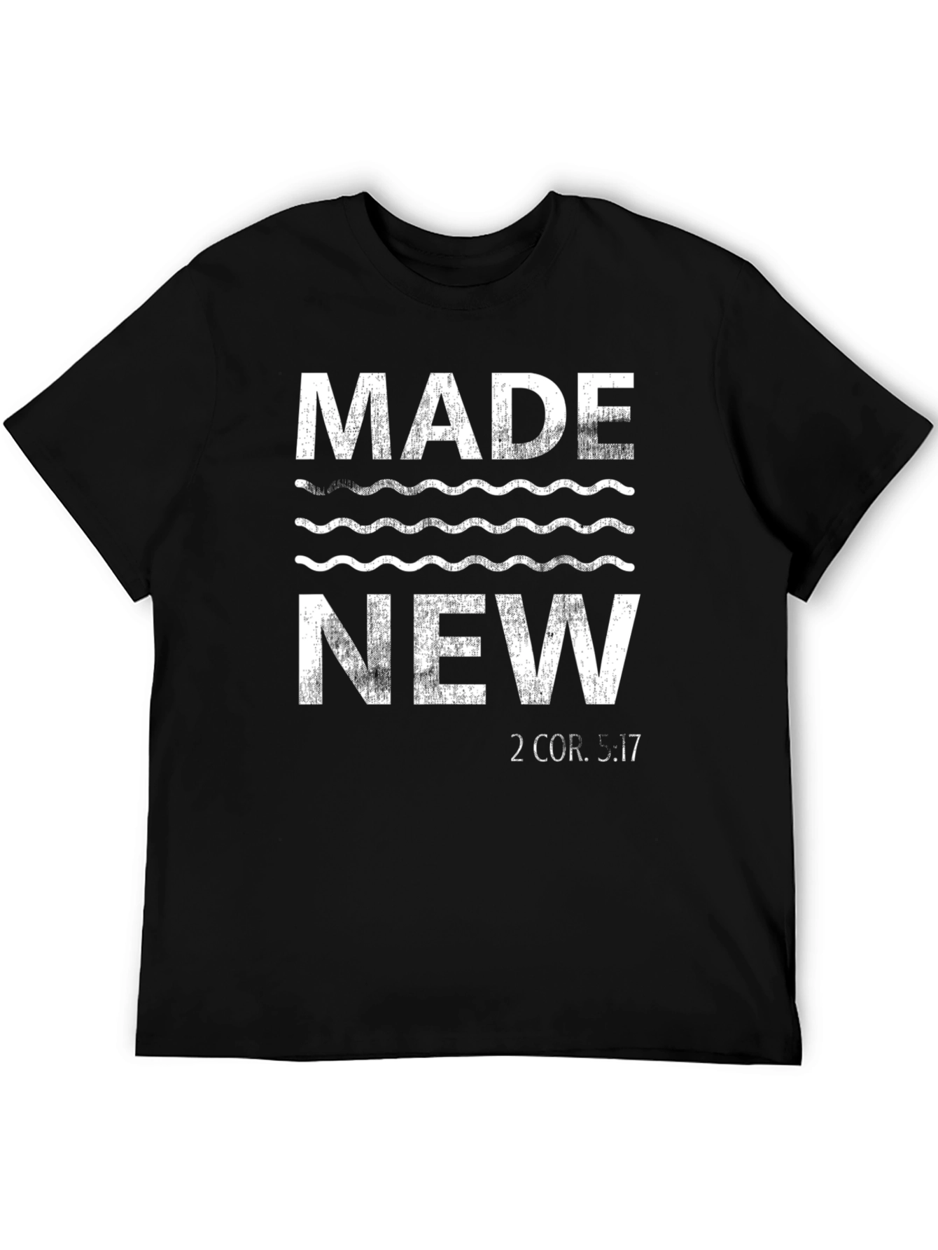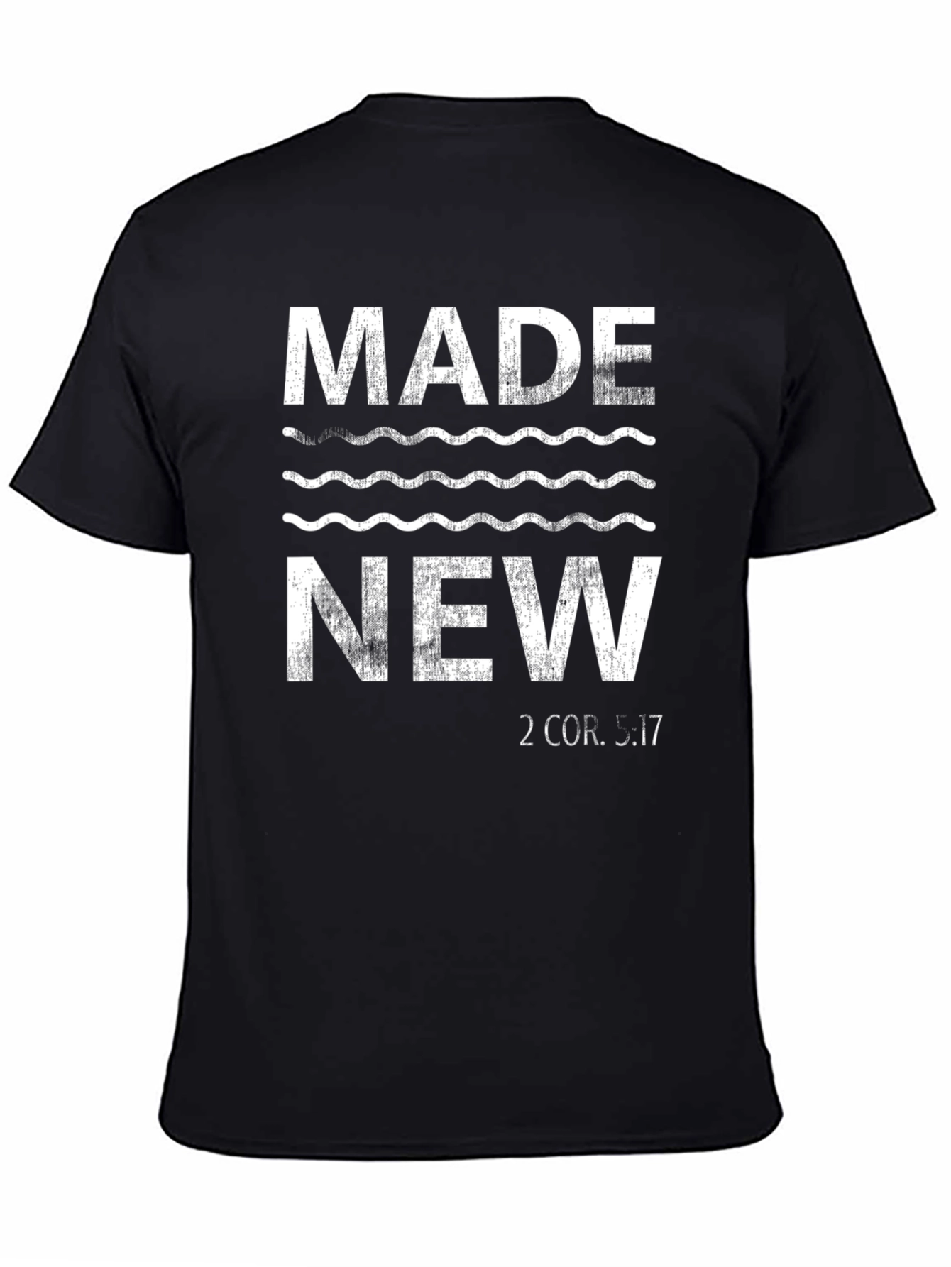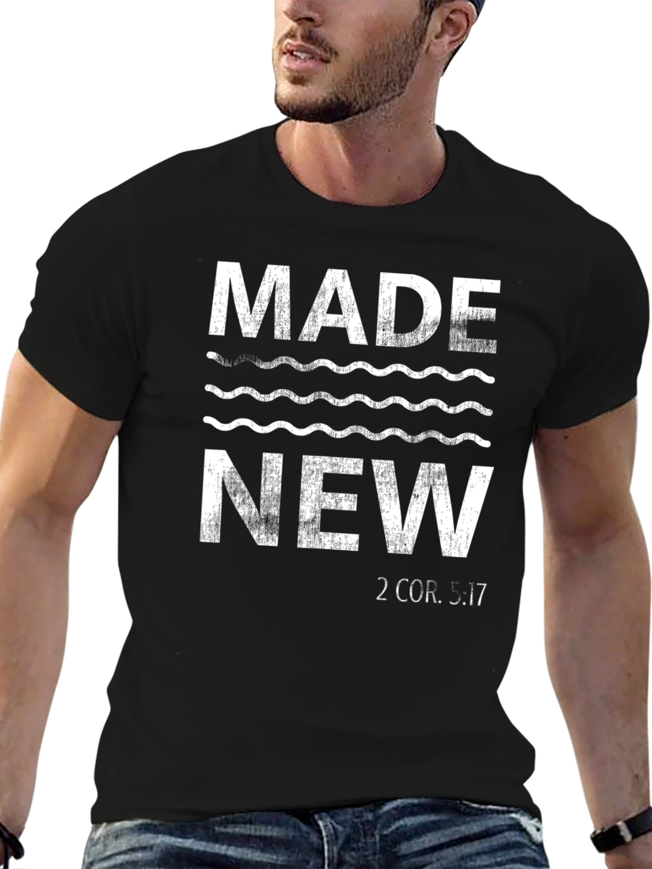This black t-shirt features the phrase 'MADE NEW' in a distressed, vintage-style white font. Three wavy lines separate the words, adding a subtle design element. Below, '2 COR. 5:17' is printed, referencing a verse from the Bible. The shirt appears to be made from a soft and comfortable fabric, perfect for everyday wear. Ideal for expressing faith and sparking conversations, this t-shirt is a stylish way to share a meaningful message. Wear it casually with jeans or dress it up with a blazer for a versatile look. A great gift for those who appreciate faith-based apparel.