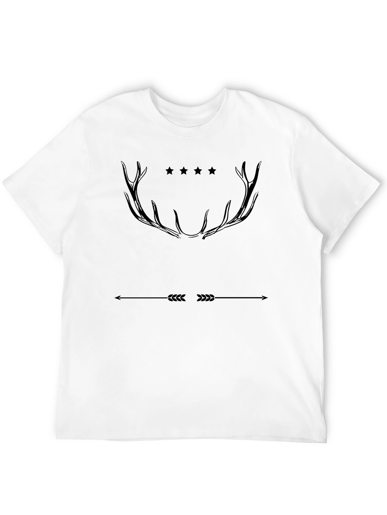 Show off your unique style with this striking men's black t-shirt. The shirt features a bold graphic design consisting of antler-like branches and four stars above. Below the antler graphic is a stylized arrow design, adding a touch of rustic charm. Made from a soft, comfortable fabric, this tee is perfect for everyday wear. Whether you're heading out for a casual day with friends or want to add a touch of personality to your wardrobe, this t-shirt is a great choice. Its versatile design makes it easy to pair with jeans, shorts, or even layer under a jacket.