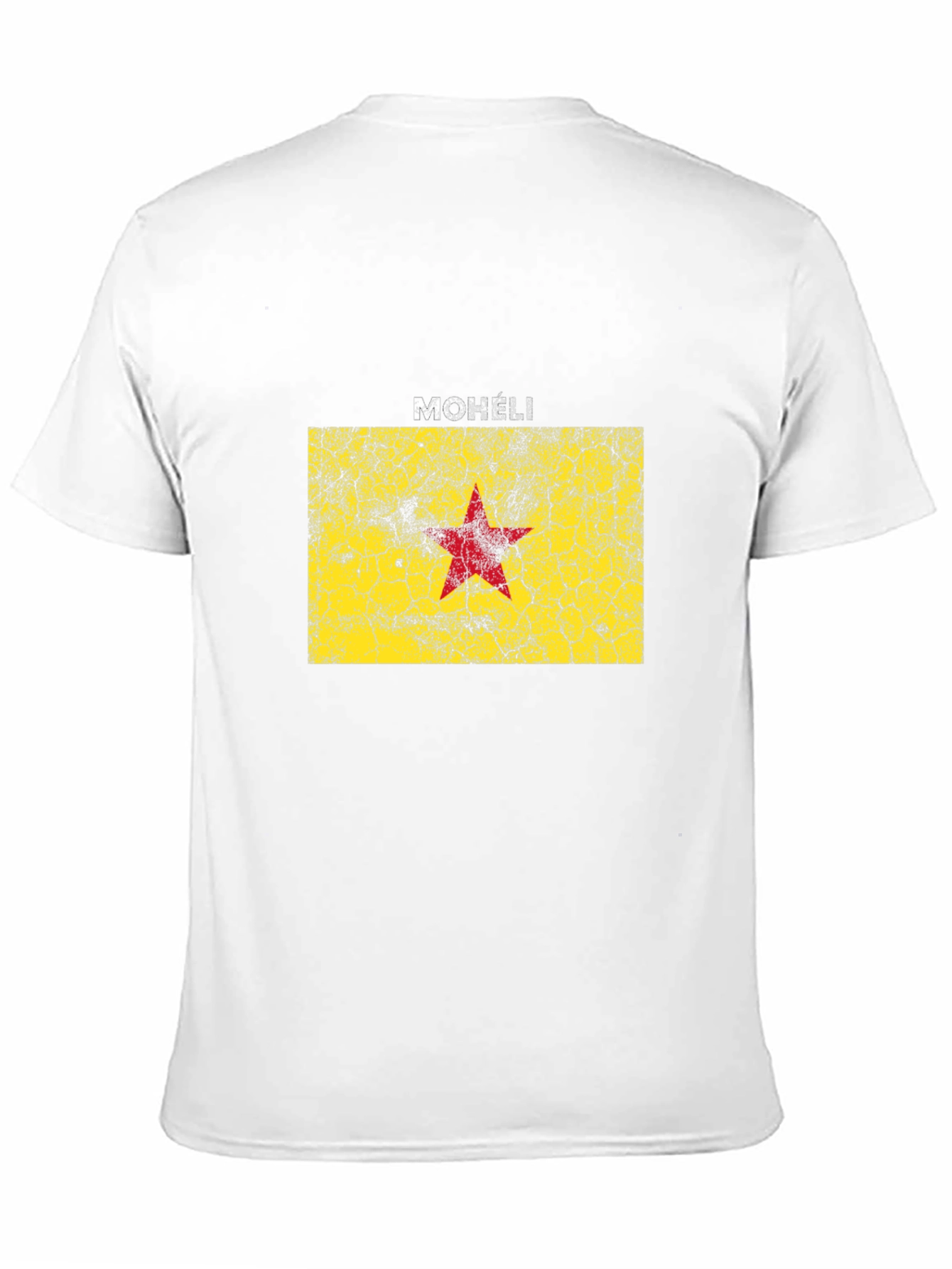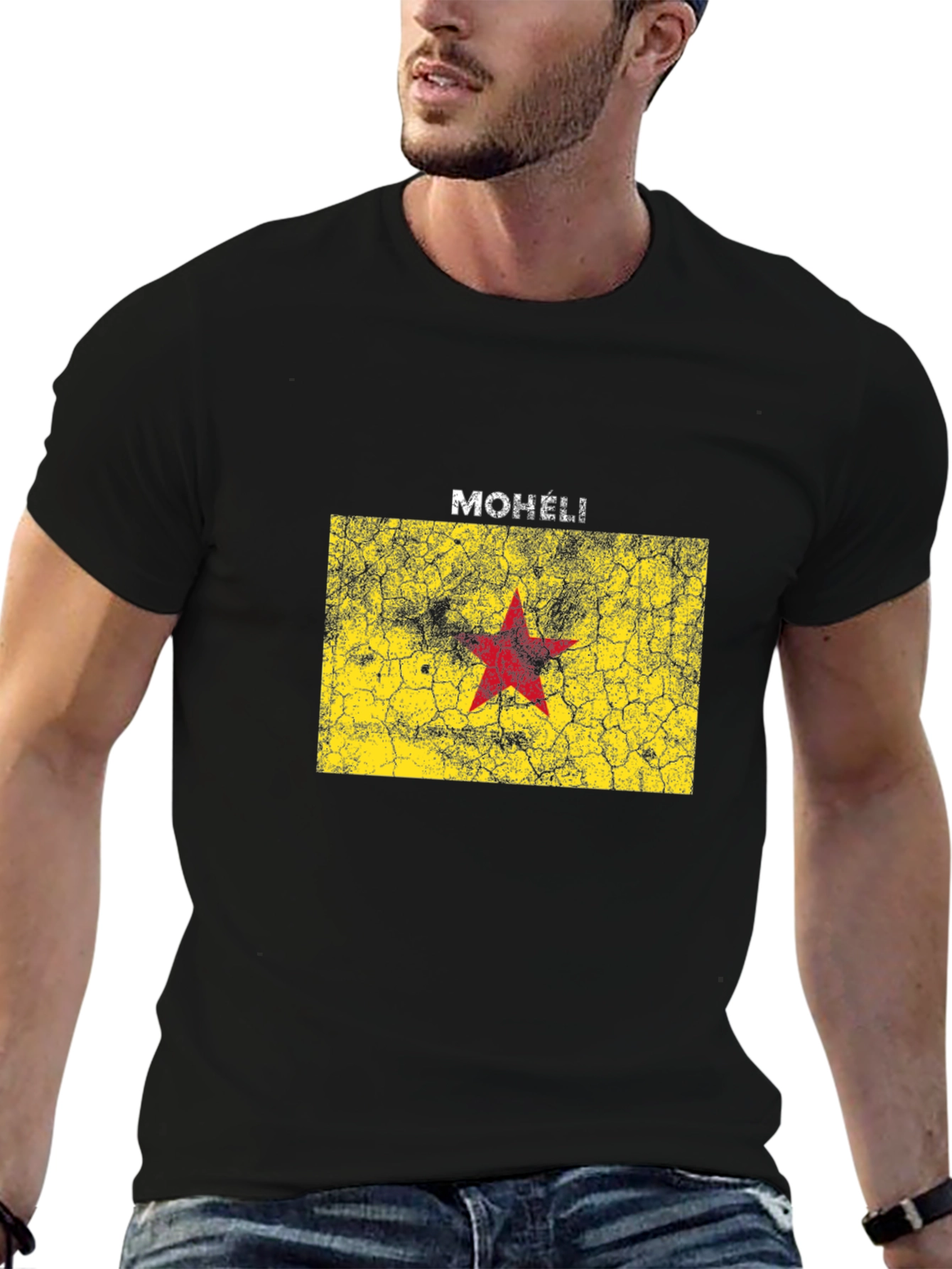Show your love for Moheli with this unique graphic tee. The shirt features a distressed-style Moheli flag design, complete with a yellow backdrop and a bold red star. The design gives it a vintage, worn-in feel. Made from comfortable, breathable fabric, this t-shirt is perfect for everyday wear, travel, or casual outings. The black color provides a stylish contrast to the vibrant flag design. This tee makes a great gift for anyone who loves Moheli or enjoys unique and eye-catching graphic shirts. Wear your pride!