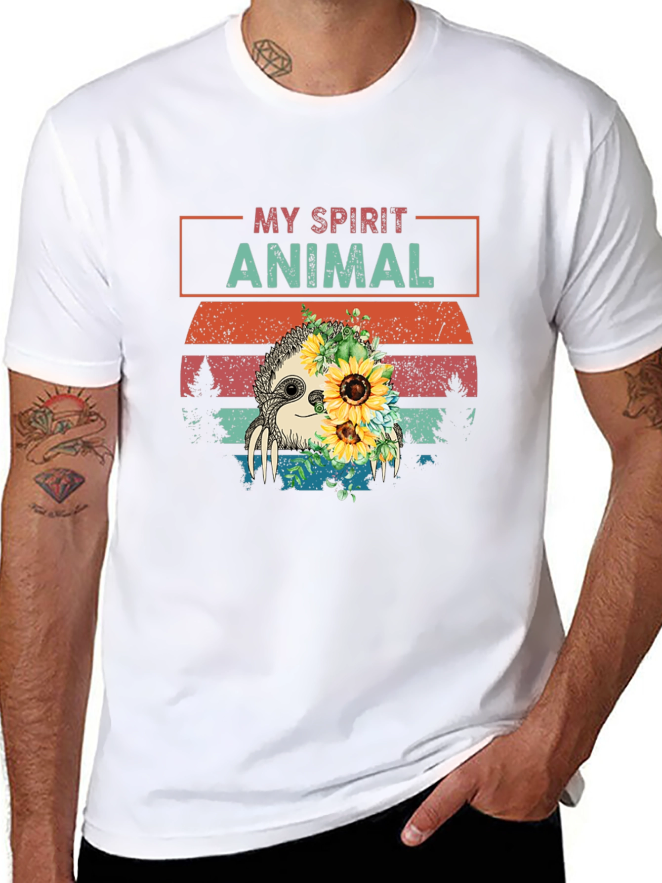 Embrace your chill side with this unique black t-shirt featuring a whimsical 'My Spirit Animal' sloth graphic. The design incorporates vibrant sunflowers and a retro sunset backdrop, creating a nature-inspired aesthetic. Made from a comfortable, breathable fabric, this tee is perfect for casual wear, lounging at home, or expressing your laid-back personality. The eye-catching design is sure to spark conversations and bring a touch of whimsy to your everyday style. Ideal for sloth lovers, nature enthusiasts, or anyone who appreciates a touch of quirky charm. Get yours today and show off your inner sloth!