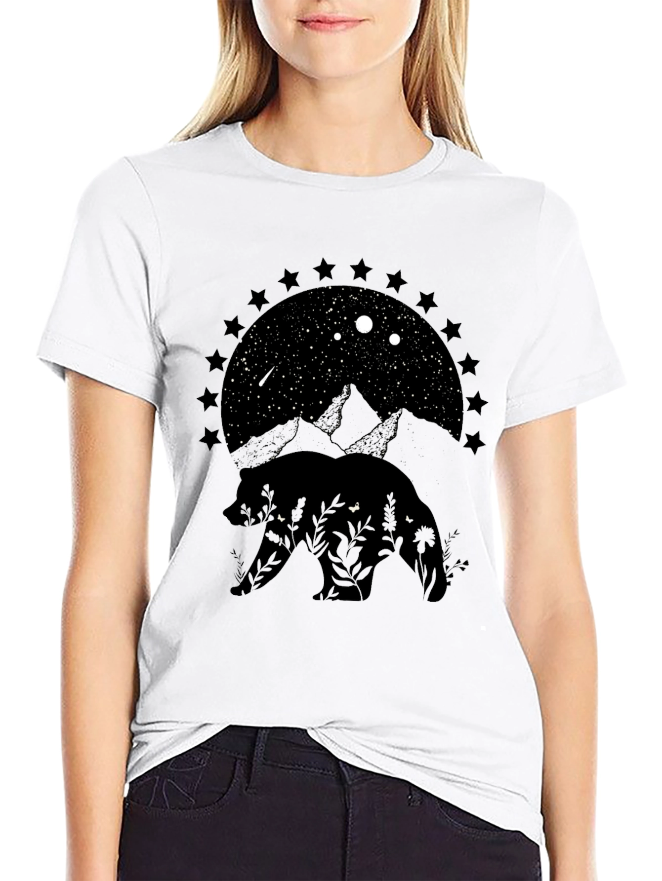 Embrace the call of the wild with this striking black graphic tee. The design features a majestic bear silhouette filled with floral patterns, set beneath a celestial mountain scene complete with stars and a meteor shower. A ring of stars outlines the top, adding a touch of whimsy. Made from comfortable fabric, this shirt is perfect for nature lovers, outdoor enthusiasts, or anyone who appreciates unique artistic designs. Wear it on your next hiking adventure, to a casual hangout, or simply as a stylish statement piece. Make a statement and showcase your love for nature!