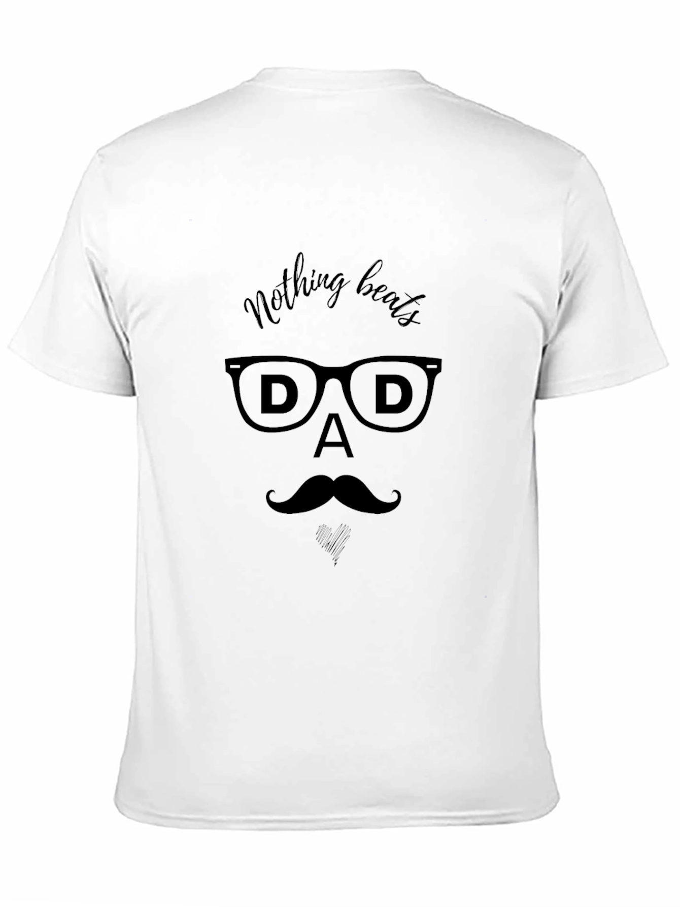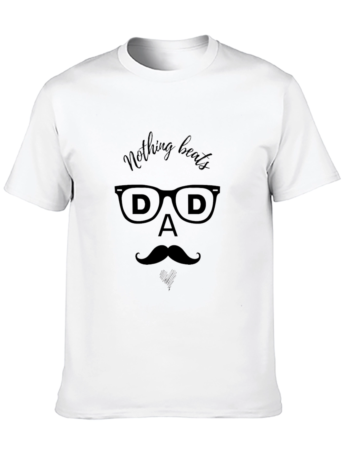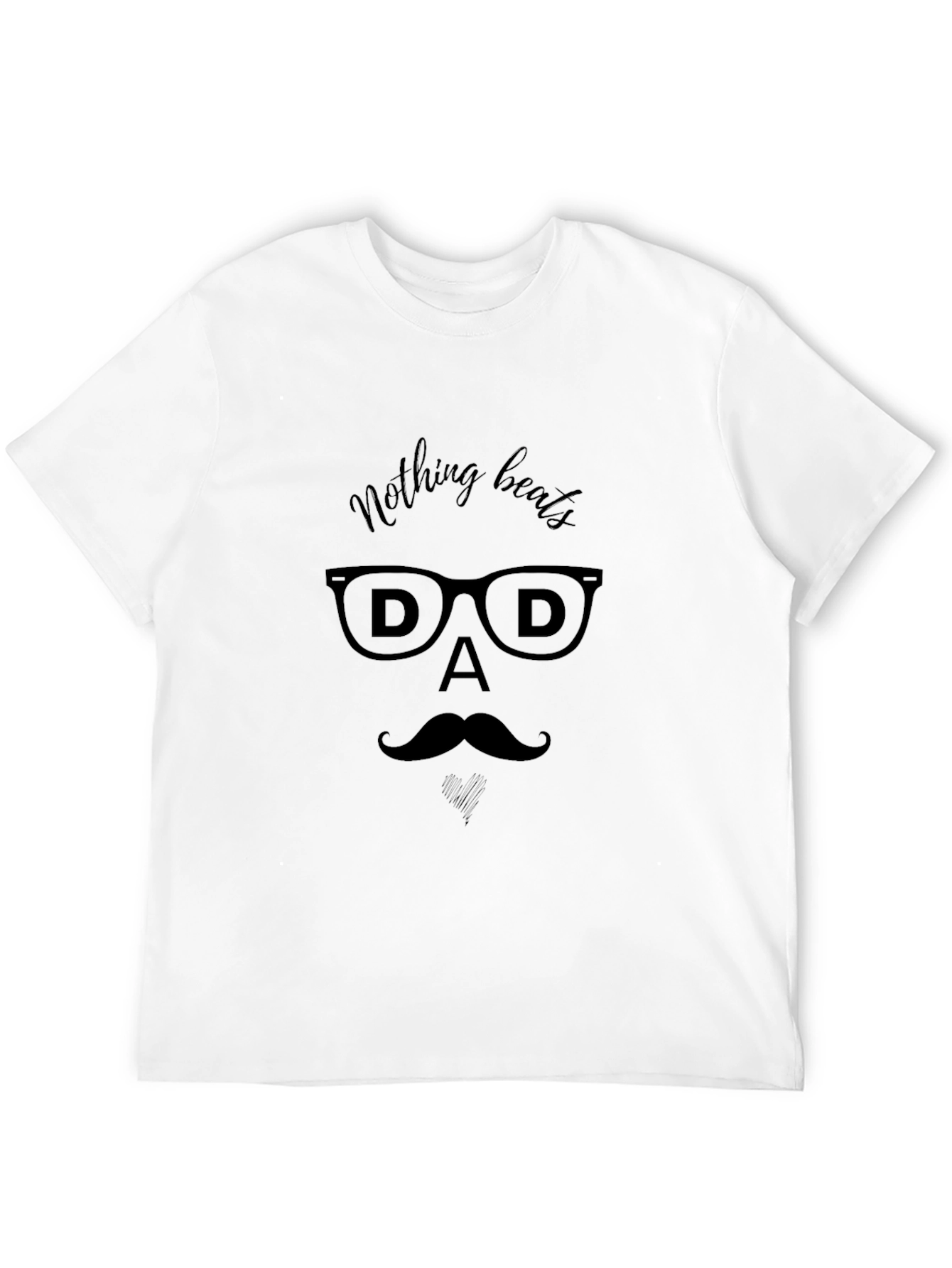 Show your love for Dad with this stylish black t-shirt. The shirt features a playful graphic design that creates a face using the words "DAD" for the eyes, a mustache, and "Nothing Beats" above. Made from comfortable, breathable fabric, this t-shirt is perfect for everyday wear. It's a great way for dad to show off his pride or makes a thoughtful Father's Day gift, birthday present, or just a special way to say "I love you." Easy to care for and designed for lasting wear, this t-shirt will quickly become a favorite in any dad's wardrobe.