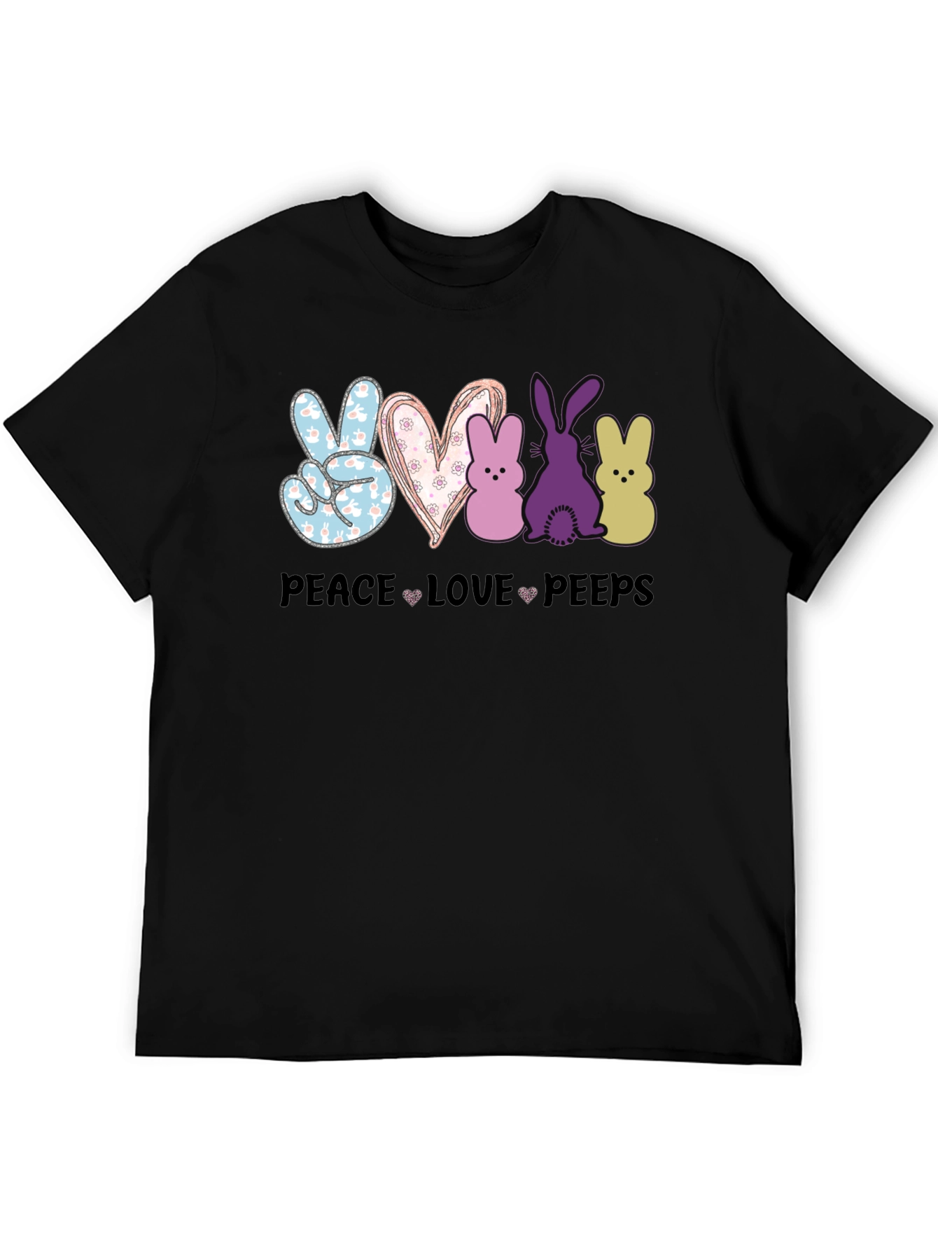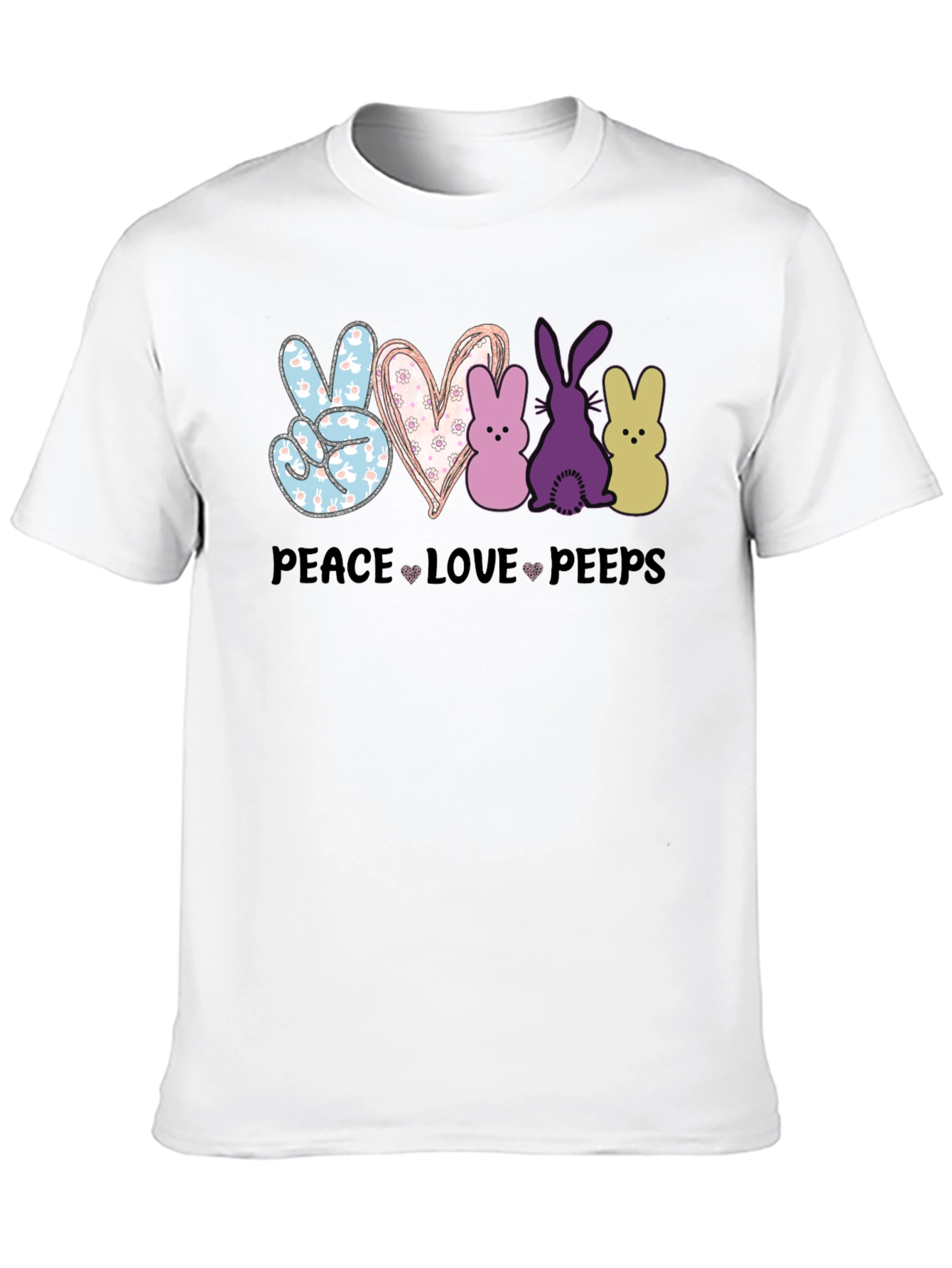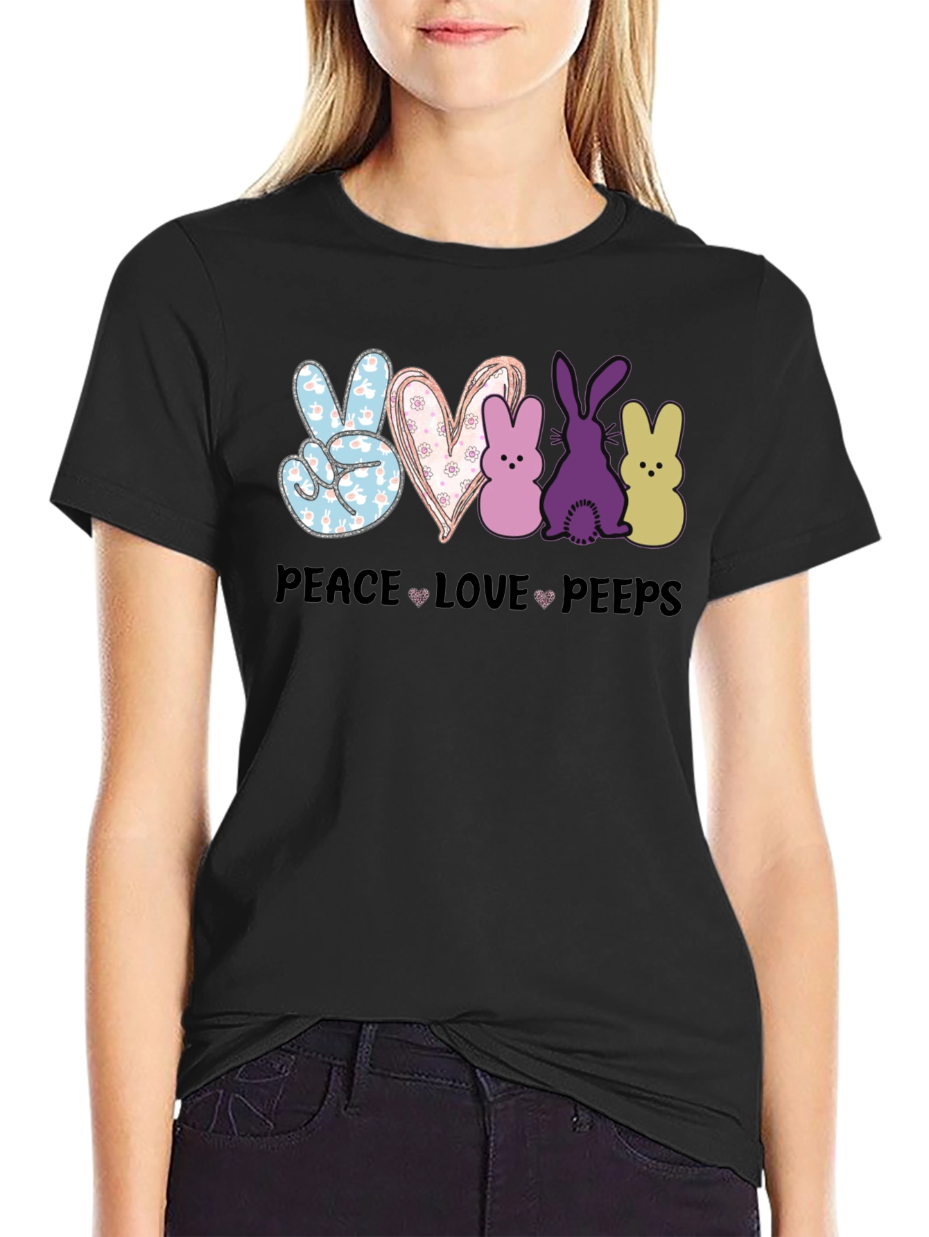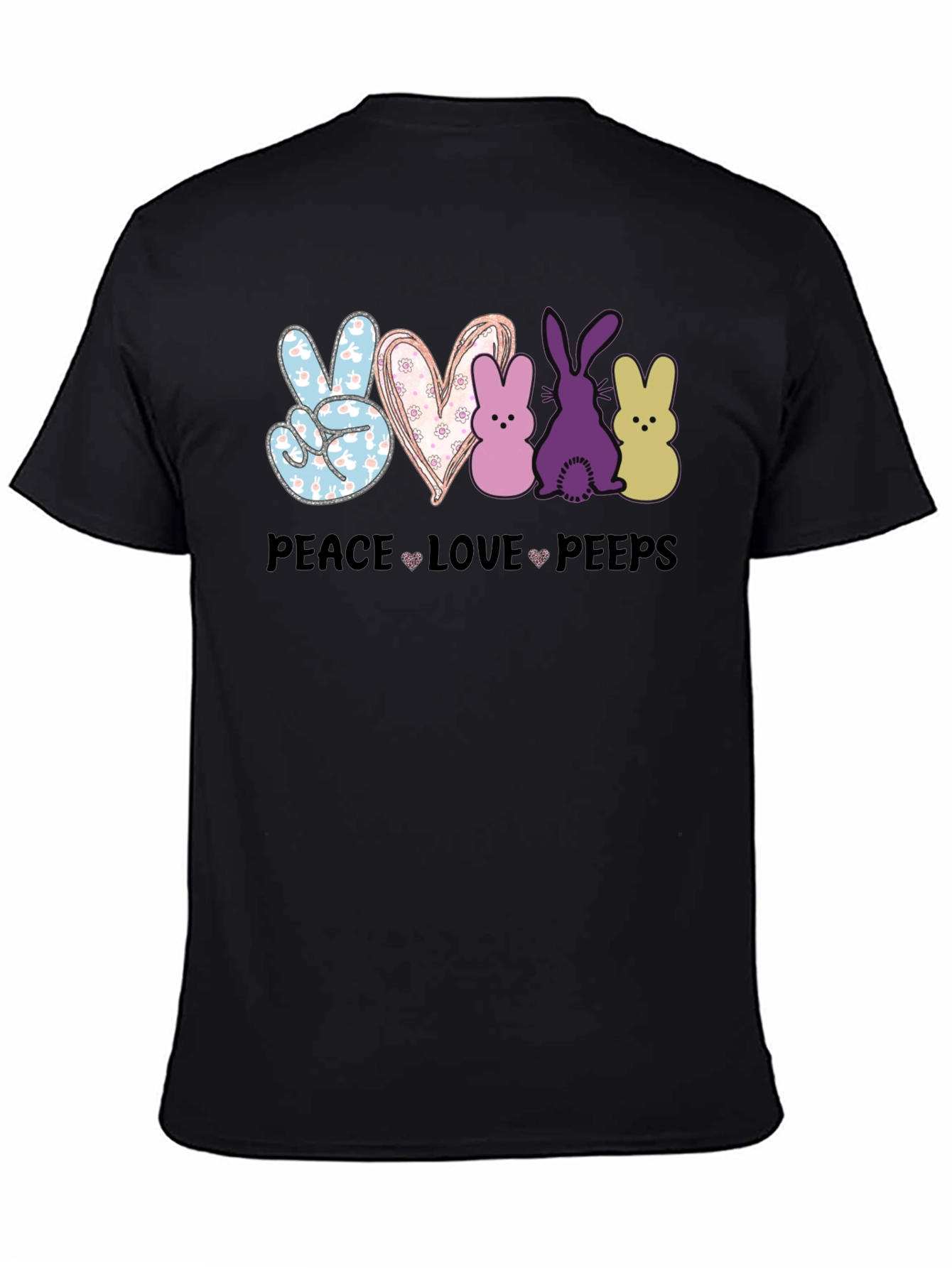 Spread positive vibes with this fun and festive "Peace Love Peeps" t-shirt! This tee features a unique graphic design with a peace sign, heart, and adorable Peeps marshmallow bunnies. The playful design is perfect for Easter celebrations or anyone who loves cute and quirky apparel. Made from soft, comfortable fabric, this shirt is ideal for everyday wear. Show off your love for peace, love, and everyone's favorite marshmallow treat with this eye-catching t-shirt. Perfect for casual outings, parties, or simply lounging around. A must-have for any Peeps enthusiast!