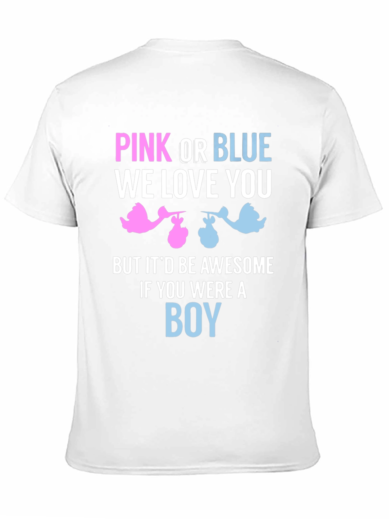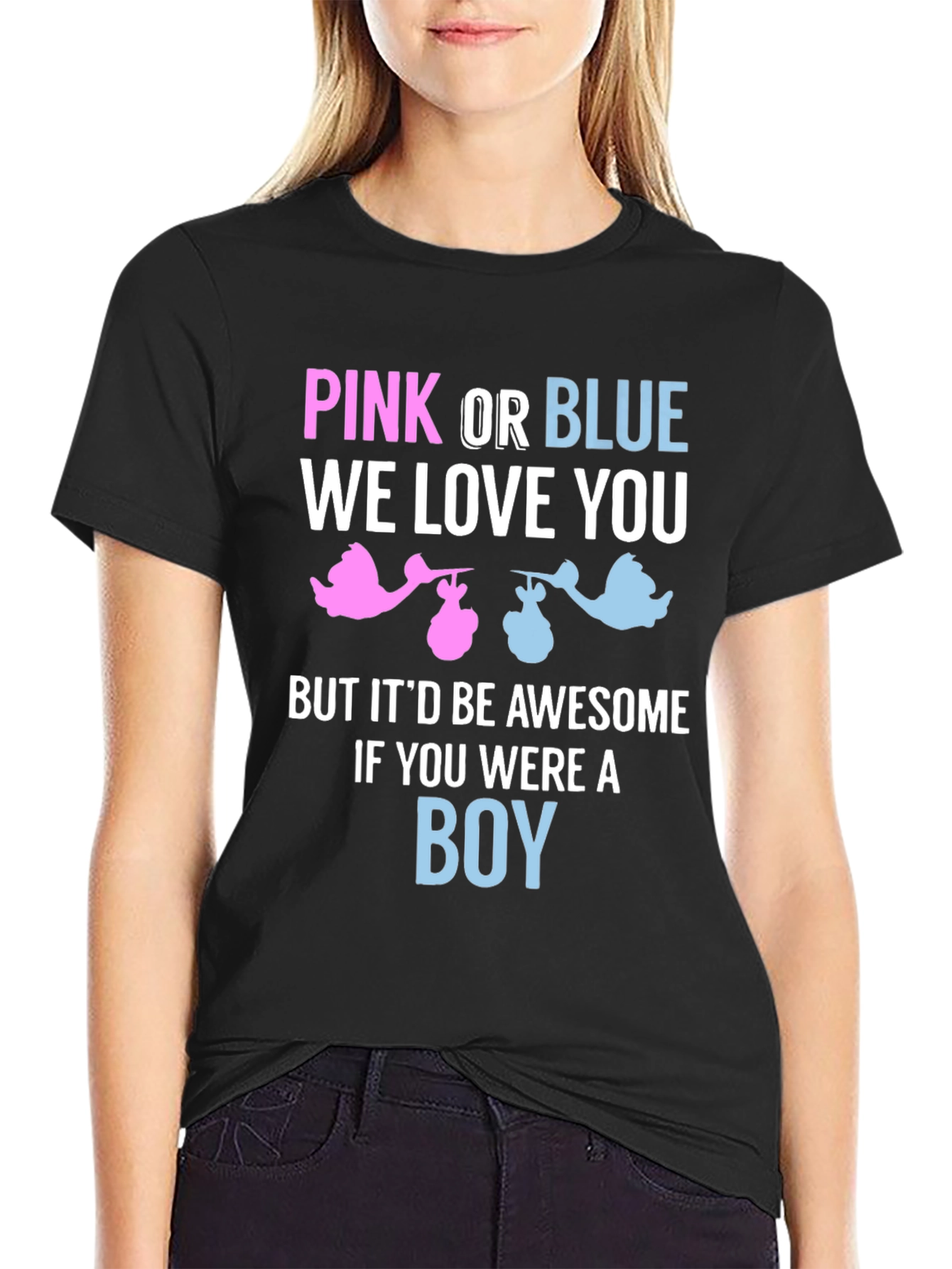 Celebrate your baby gender reveal with this fun and playful black t-shirt. Featuring a design that reads "PINK OR BLUE WE LOVE YOU BUT IT'D BE AWESOME IF YOU WERE A BOY," this tee is perfect for parents eagerly awaiting the arrival of their little one. The design includes cute stork graphics carrying baby bundles, adding a touch of whimsy. Made from a soft, comfortable fabric, this shirt is ideal for wearing to the reveal party or as a casual, everyday option. Show your excitement and make a statement with this unique gender reveal t-shirt.