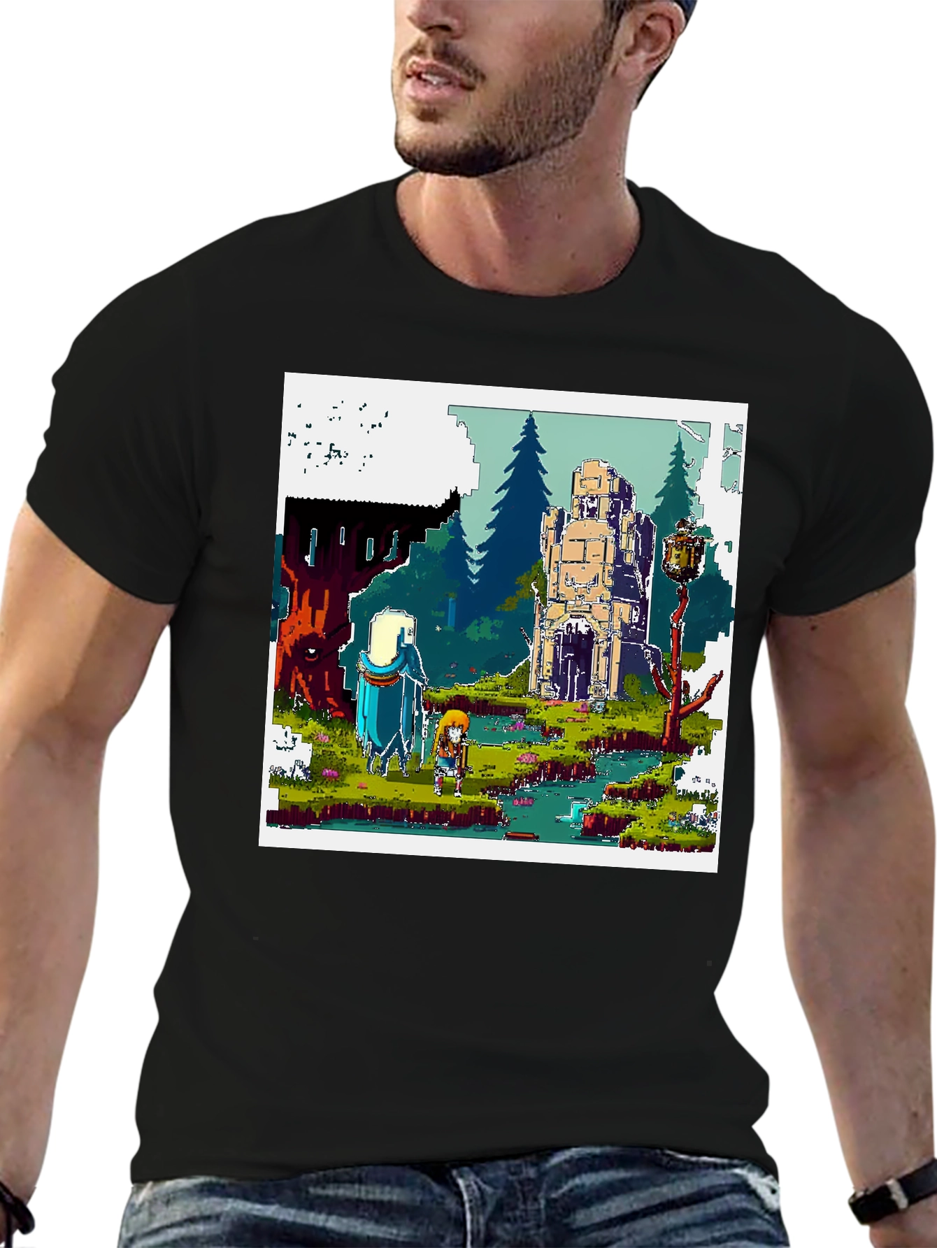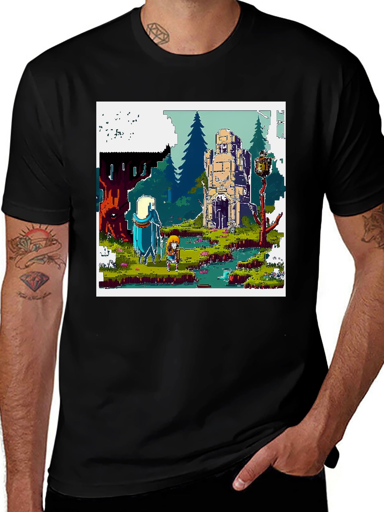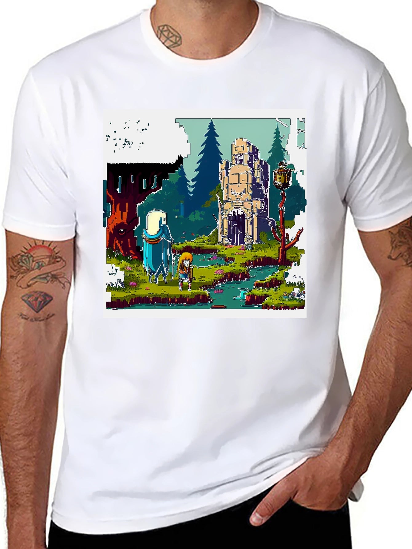Embark on a pixelated journey with this unique t-shirt! Featuring a vibrant, retro-style scene reminiscent of classic adventure games, this tee is perfect for gamers and art lovers alike. The design showcases two characters exploring a fantastical landscape with forests, ruins, and a flowing river, all rendered in charming pixel art. Made from comfortable, breathable fabric, this shirt is ideal for casual wear, gaming sessions, or showcasing your love for vintage gaming culture. Stand out from the crowd and level up your wardrobe with this eye-catching and conversation-starting tee. Get yours today and let the adventure begin!