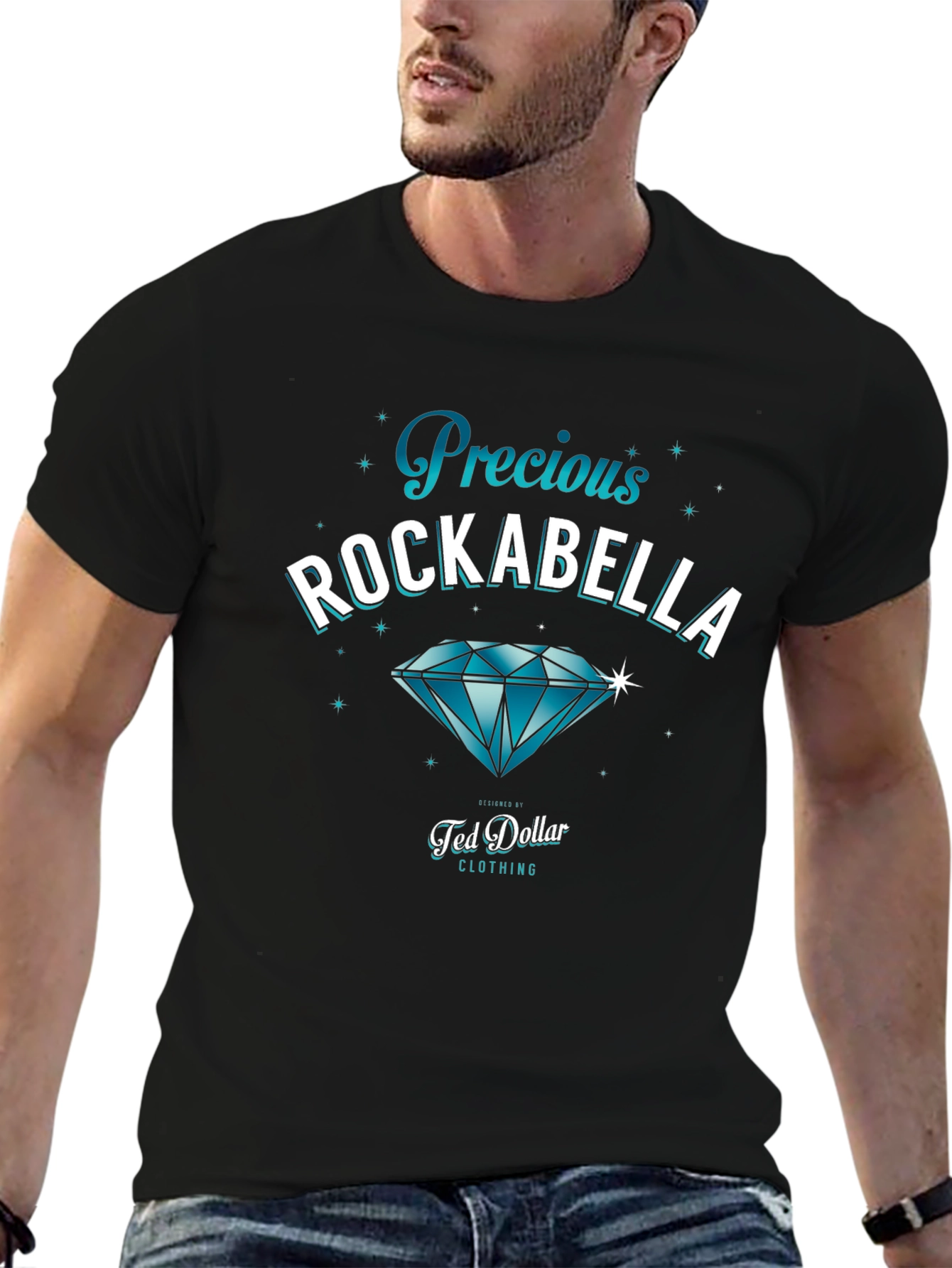Elevate your style with this eye-catching graphic tee from Ted Dollar Clothing. The black shirt features a vibrant and stylish design, showcasing "Precious Rockabella" text above a sparkling blue diamond graphic. Ideal for casual wear, this tee offers both comfort and a bold statement. The design elements give off a retro, rockabilly vibe. It's perfect for concerts, casual outings, or simply expressing your unique style. Dress it up or down, this tee is sure to turn heads. Grab yours now and let your style shine!