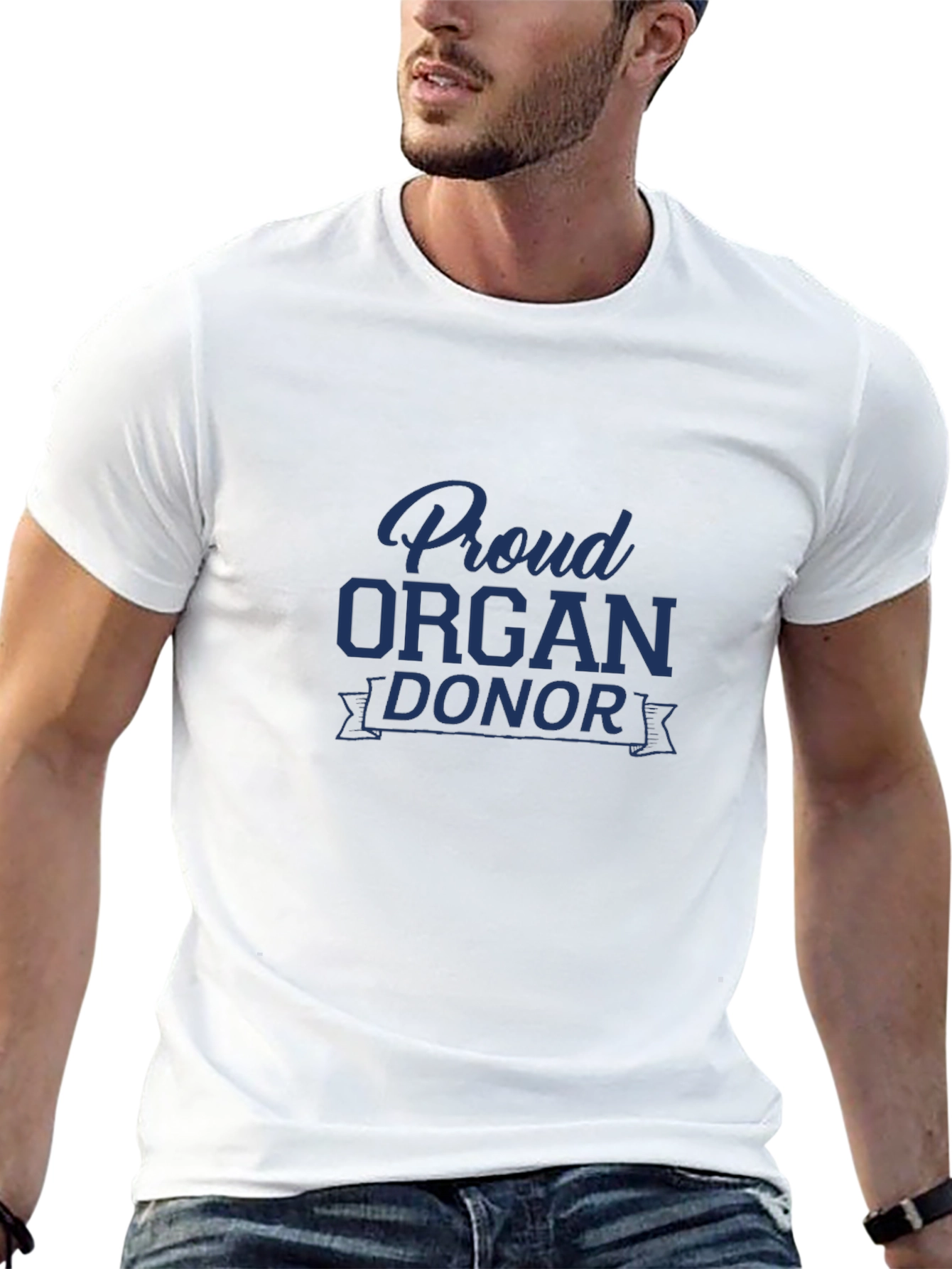 Show your commitment with this classic black t-shirt. This comfortable tee features a striking "Proud Organ Donor" graphic in blue, making a powerful statement. The design is stylish and clear, ensuring visibility. Crafted from what appears to be a soft and breathable fabric, this shirt is ideal for everyday wear, awareness events, or simply showing your support for organ donation. A great conversation starter and a meaningful addition to any wardrobe.