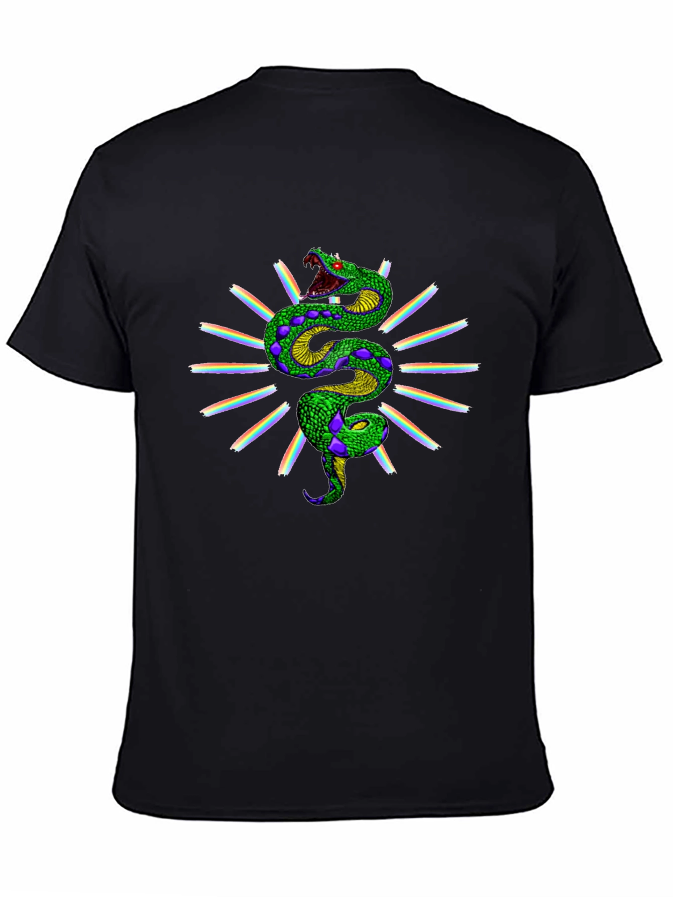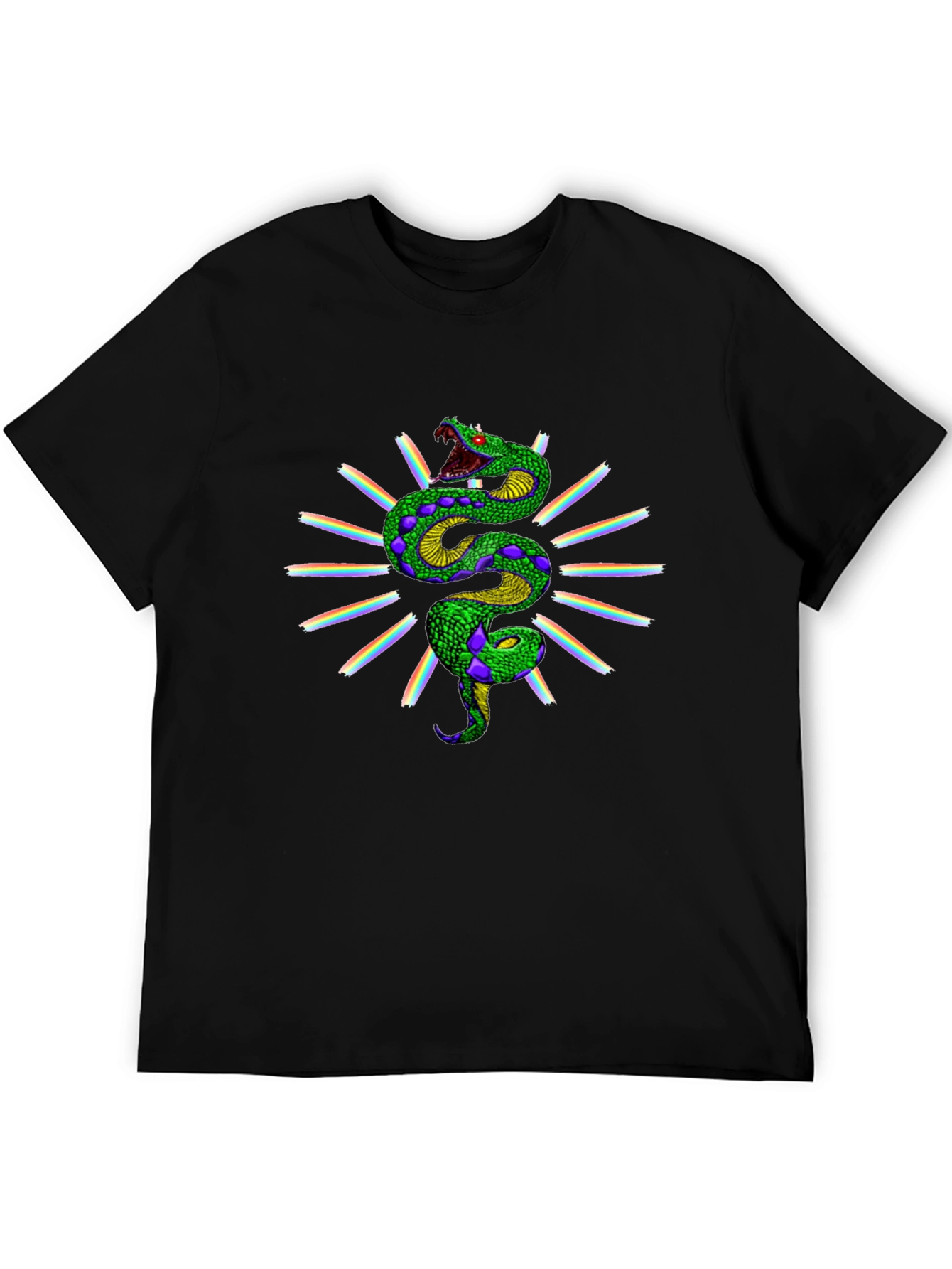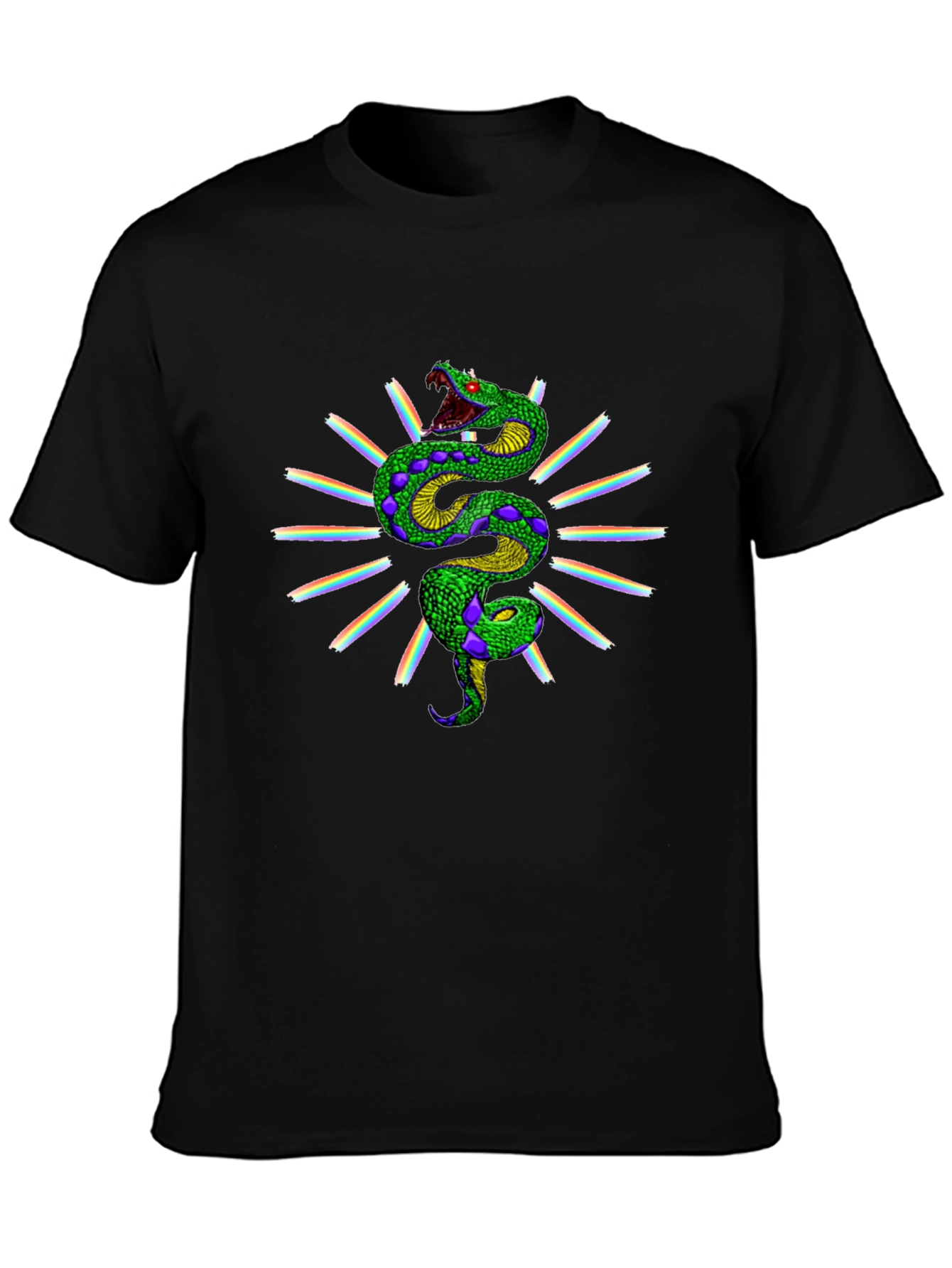 This eye-catching black t-shirt features a vibrant and detailed snake graphic. The snake is coiled and colored in shades of green and purple with rainbow colored lines emanating from behind it. This striking design is printed on a comfortable, everyday wear t-shirt. The short sleeves and classic fit make it a versatile addition to any wardrobe. Wear it casually with jeans, or dress it up with a blazer for a bold statement. Show off your unique style with this stand-out piece.