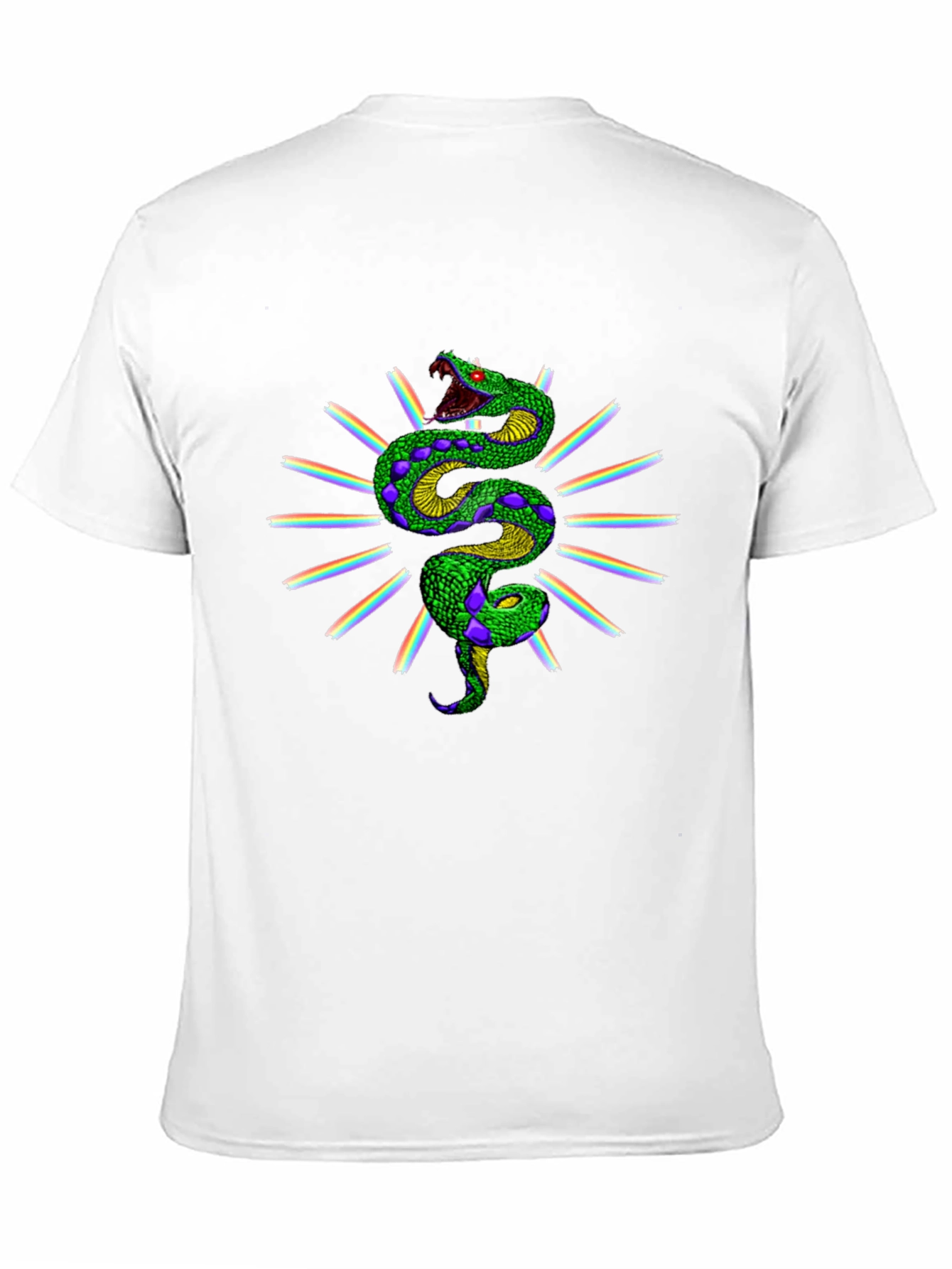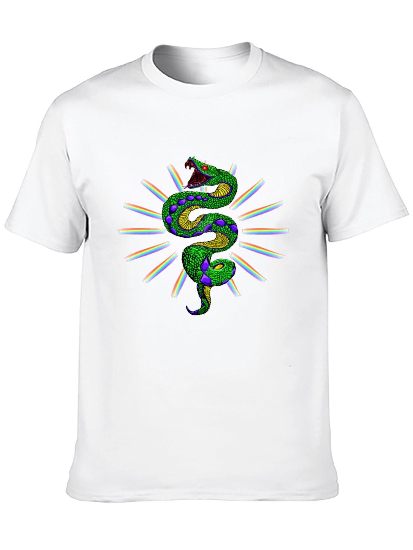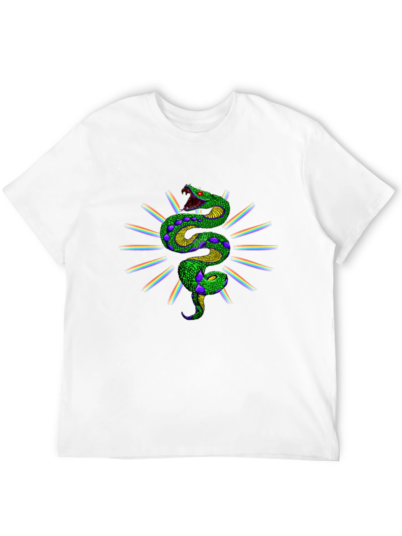 This eye-catching black t-shirt features a vibrant and detailed snake graphic. The snake is coiled and colored in shades of green and purple with rainbow colored lines emanating from behind it. This striking design is printed on a comfortable, everyday wear t-shirt. The short sleeves and classic fit make it a versatile addition to any wardrobe. Wear it casually with jeans, or dress it up with a blazer for a bold statement. Show off your unique style with this stand-out piece.