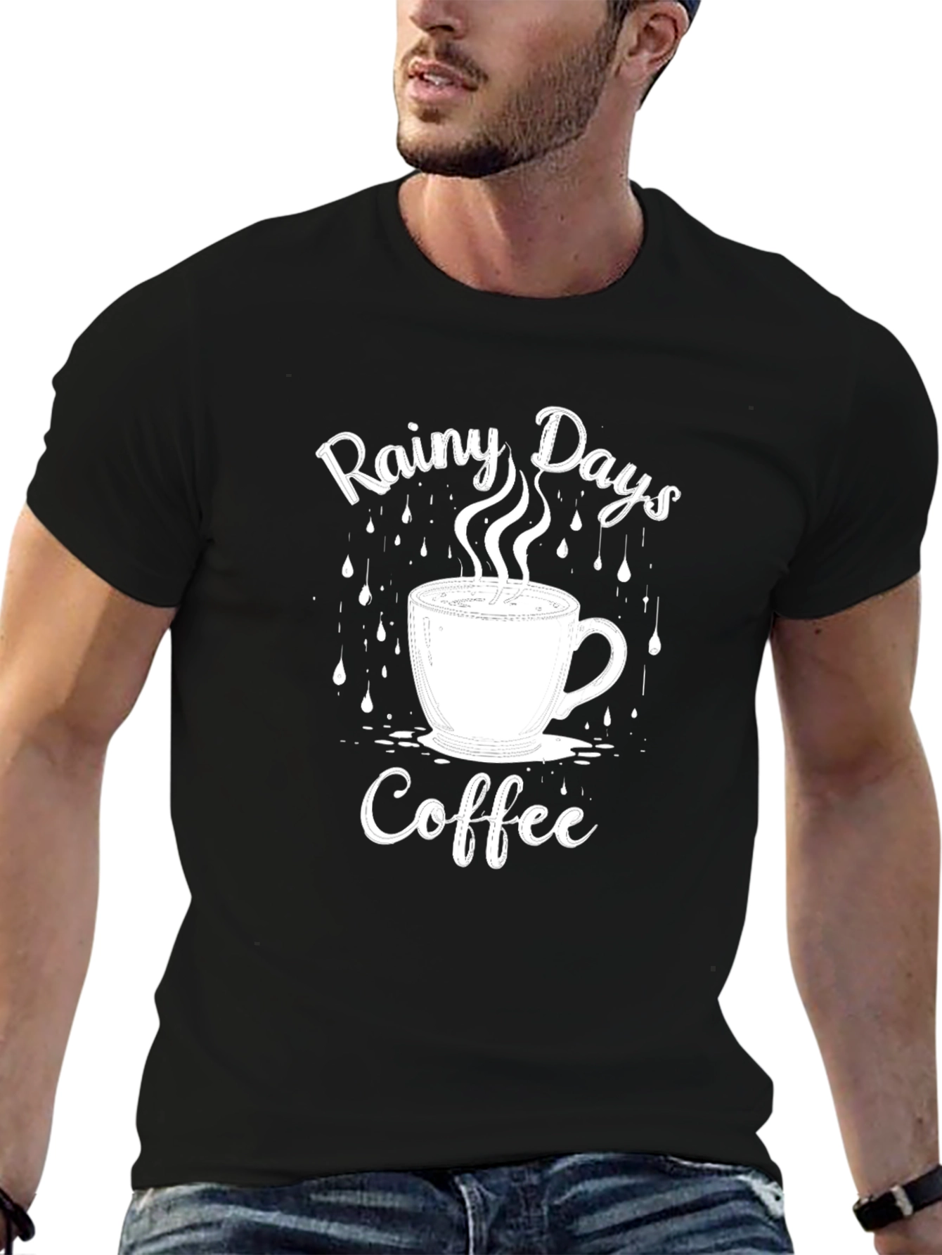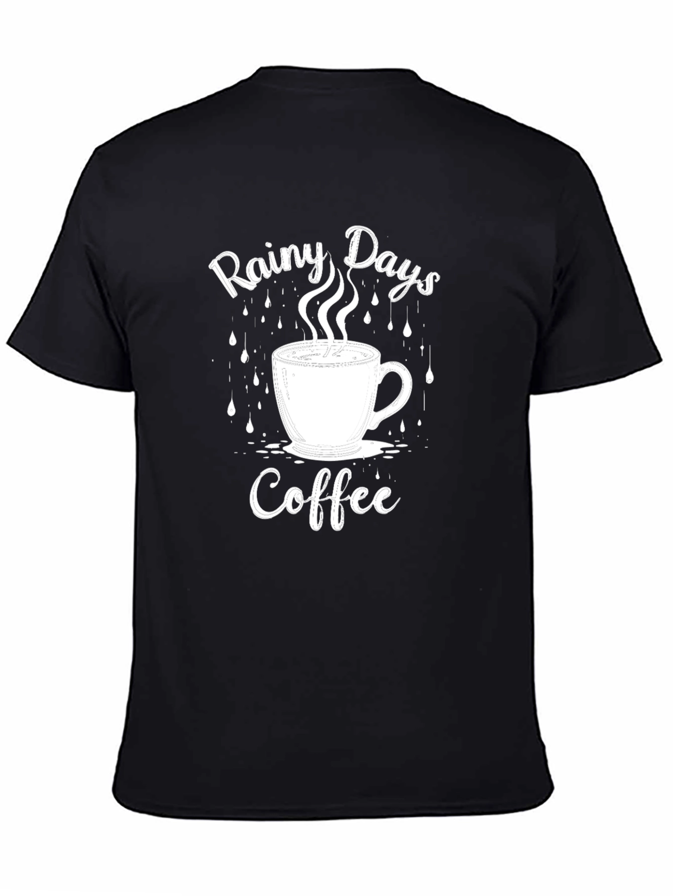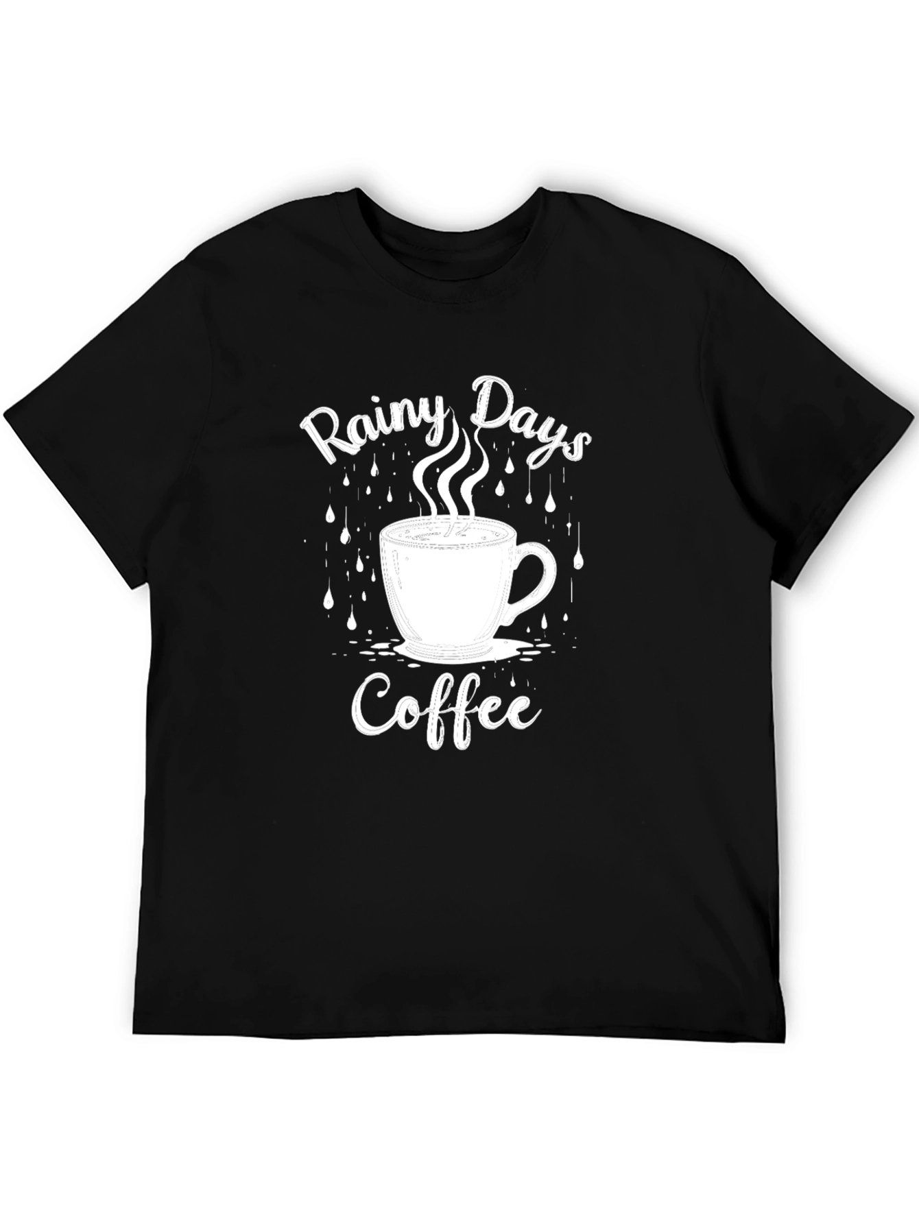 Embrace cozy vibes with this black graphic tee featuring a stylish design of a steaming coffee cup. Above the cup, the words "Rainy Days" arch gracefully, while "Coffee" sits below. Delicate droplets enhance the rainy-day theme. Made from soft, breathable fabric, this tee offers all-day comfort. Ideal for coffee lovers, rainy weather enthusiasts, or anyone seeking a touch of comfort in their wardrobe. Perfect for casual outings, lounging at home, or as a thoughtful gift. Add a dash of warmth to your style with this delightful tee.