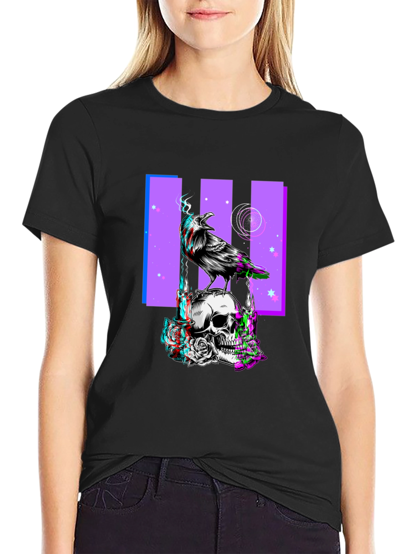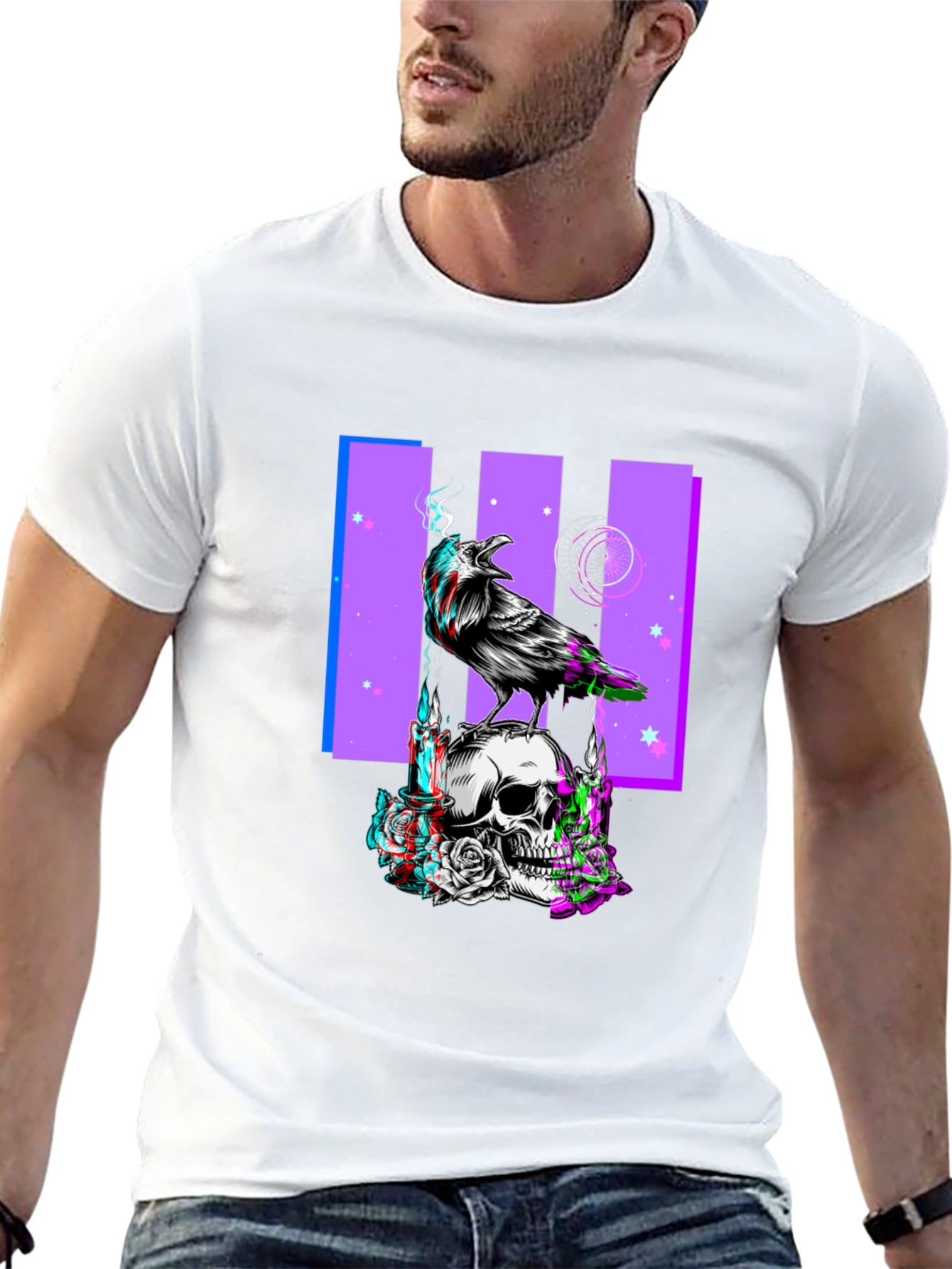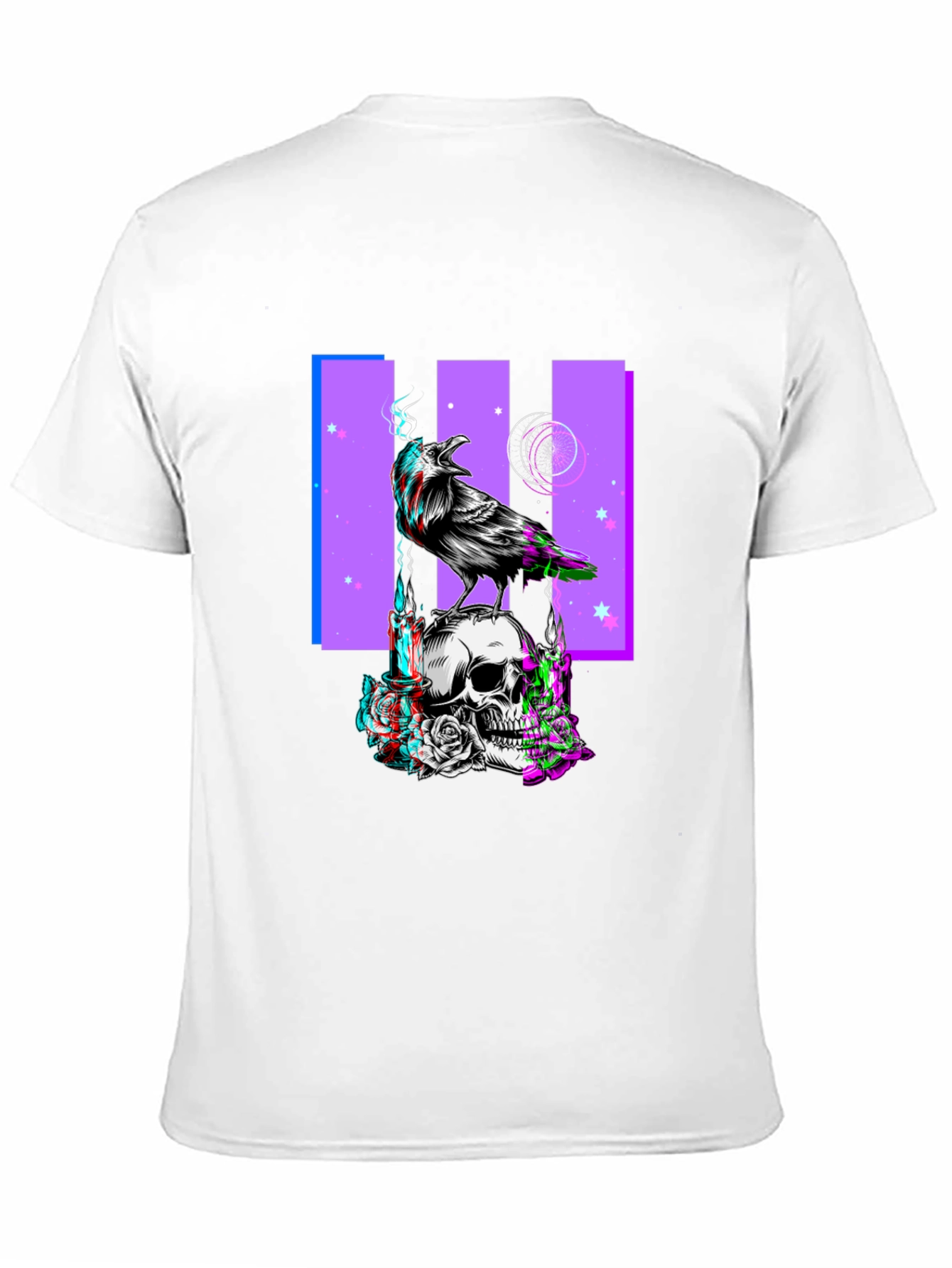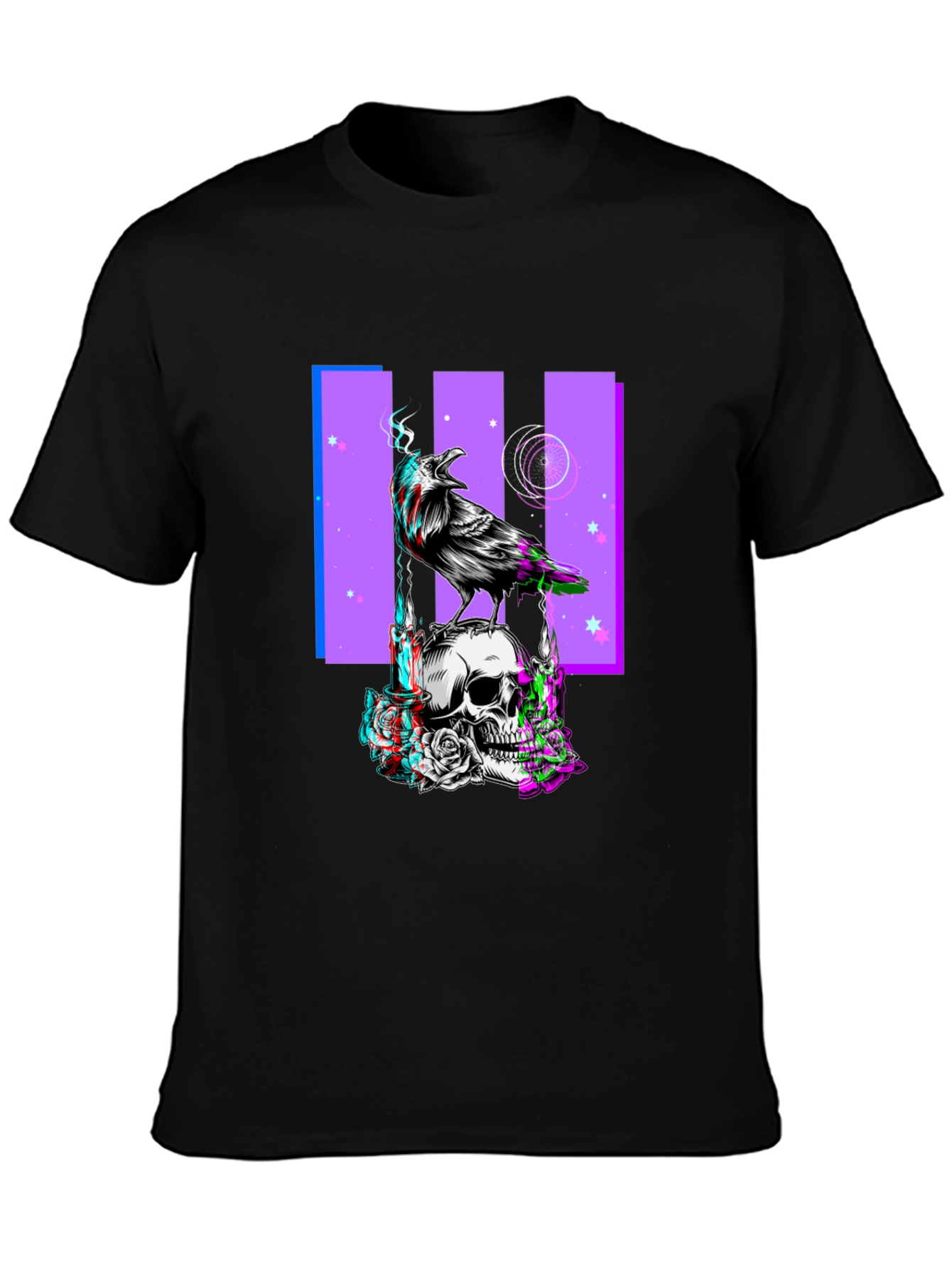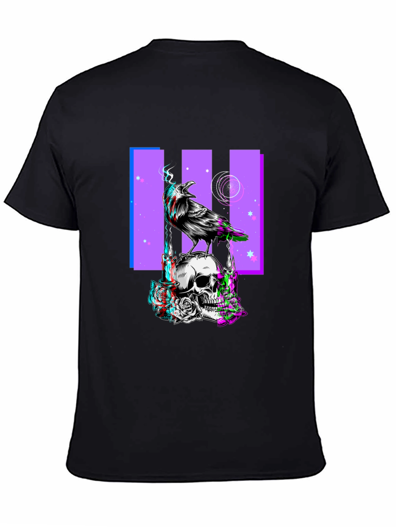 Show off your unique style with this eye-catching black t-shirt. The shirt features a bold graphic print of a raven perched atop a skull, with a purple background design and stars. The design has a unique glitching/3D effect adding a modern and edgy feel. Constructed from a soft-touch fabric, this tee offers all-day comfort and durability. Ideal for casual wear, concerts, or expressing your individuality. Pair it with jeans, shorts, or layer it under a jacket for a versatile look. Make a statement with this one-of-a-kind graphic tee.