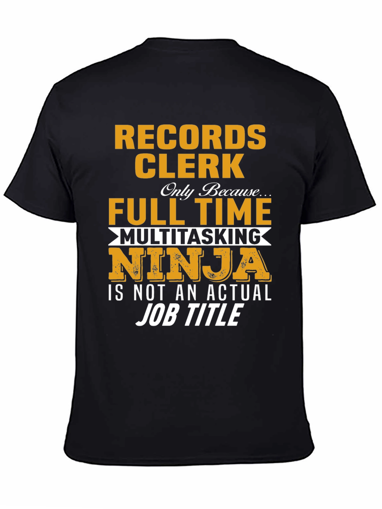 This black t-shirt features a humorous graphic design geared towards records clerks. The text "RECORDS CLERK" is prominently displayed at the top in a bold, orange font, followed by "Only Because... FULL TIME". The design highlights the multitasking nature of the job with the phrase "MULTITASKING NINJA", suggesting humor and a lighthearted take on the profession. Below the text, it cleverly states, "IS NOT AN ACTUAL JOB TITLE." The shirt is perfect for records clerks who want to showcase their sense of humor and dedication to their work. It is made from a comfortable-looking fabric, ideal for everyday wear, and is a fun conversation starter.