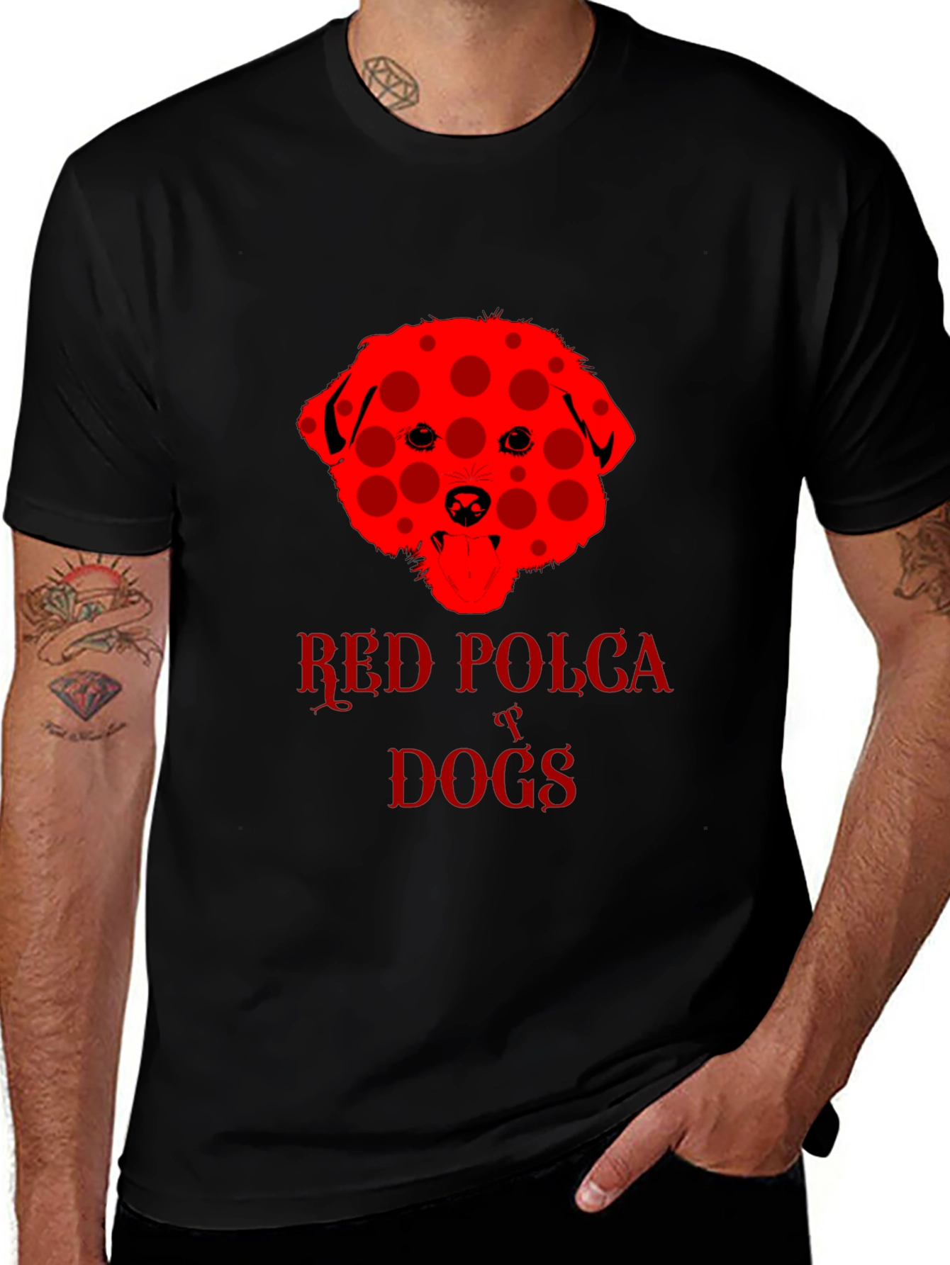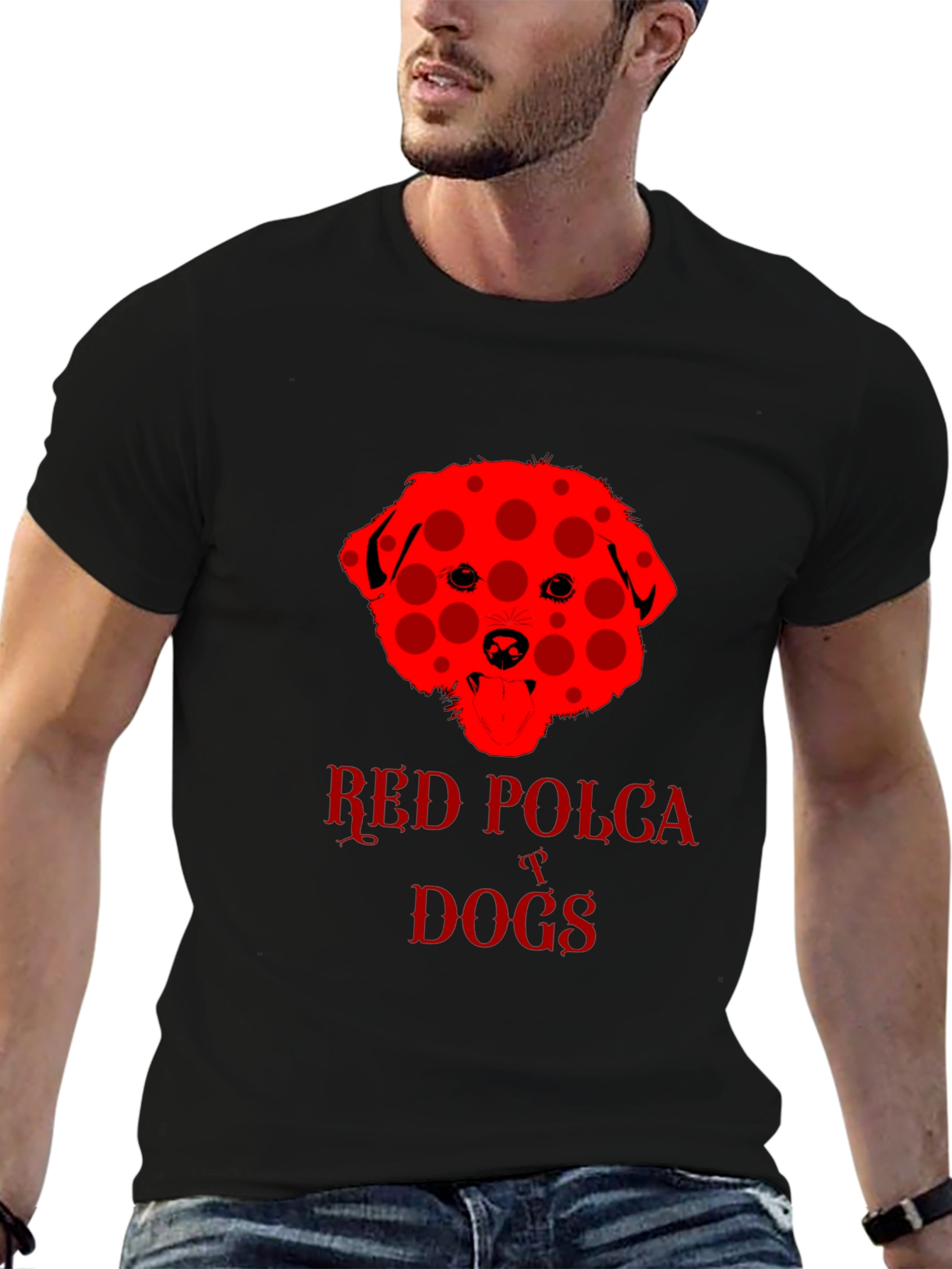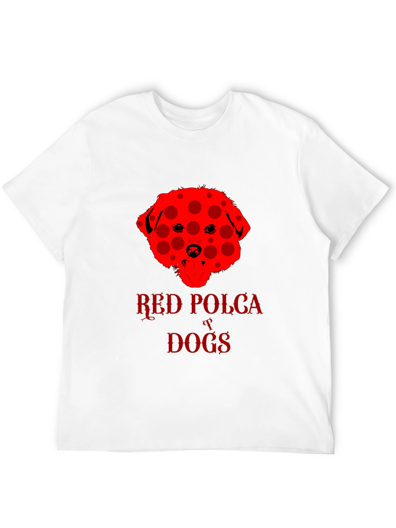Show off your love for dogs with this eye-catching black t-shirt. The shirt features a unique red dog design with a playful polka dot pattern. "Red Polka Dogs" is emblazoned beneath the dog image in a matching red font. The classic crew neck and short sleeves provide a comfortable, casual fit. This tee is perfect for dog lovers and anyone who wants to add a touch of fun to their wardrobe. Wear it to the dog park, casual outings, or just lounging around the house. This shirt is sure to be a conversation starter and a fun way to express your personality.
