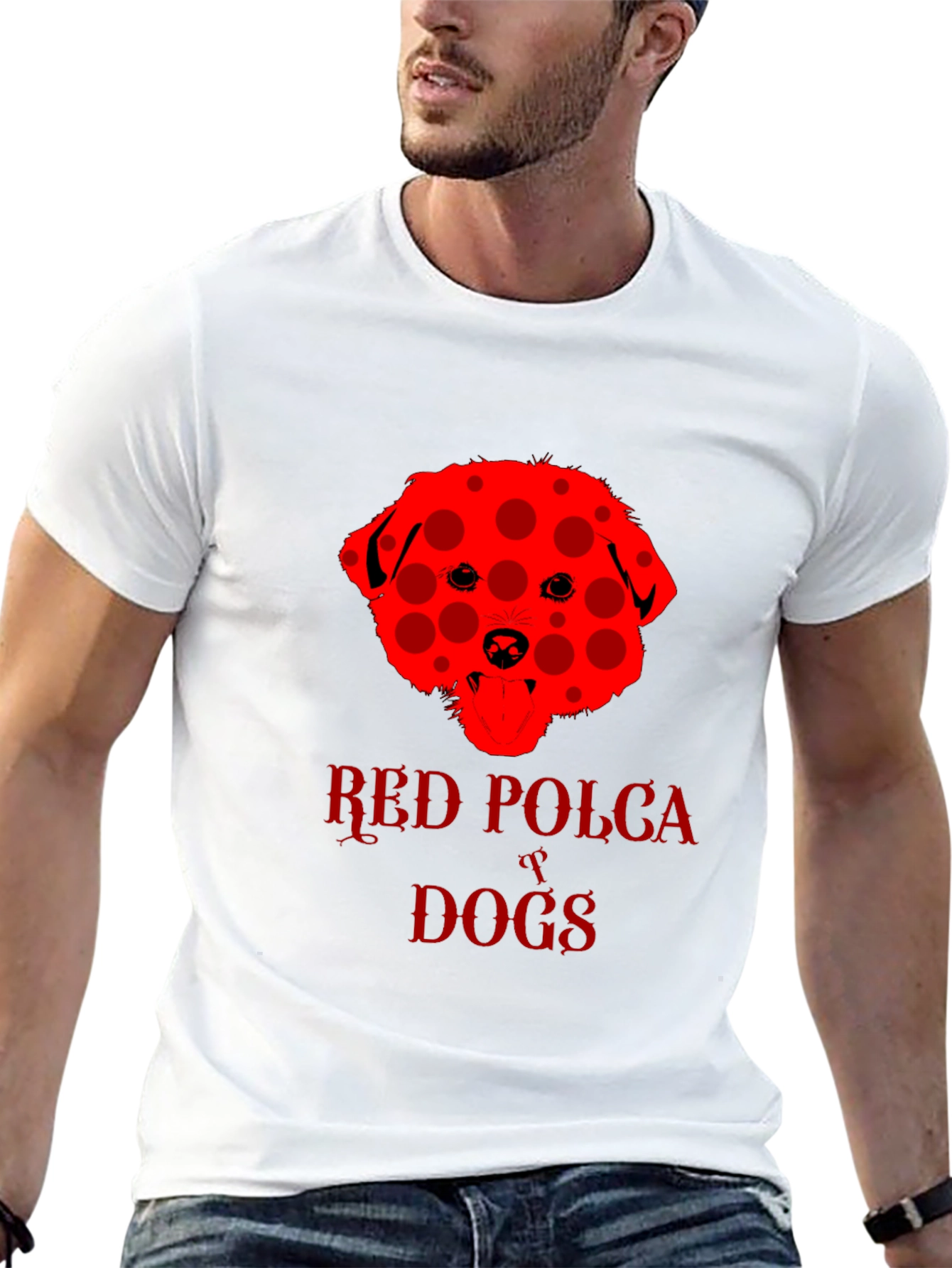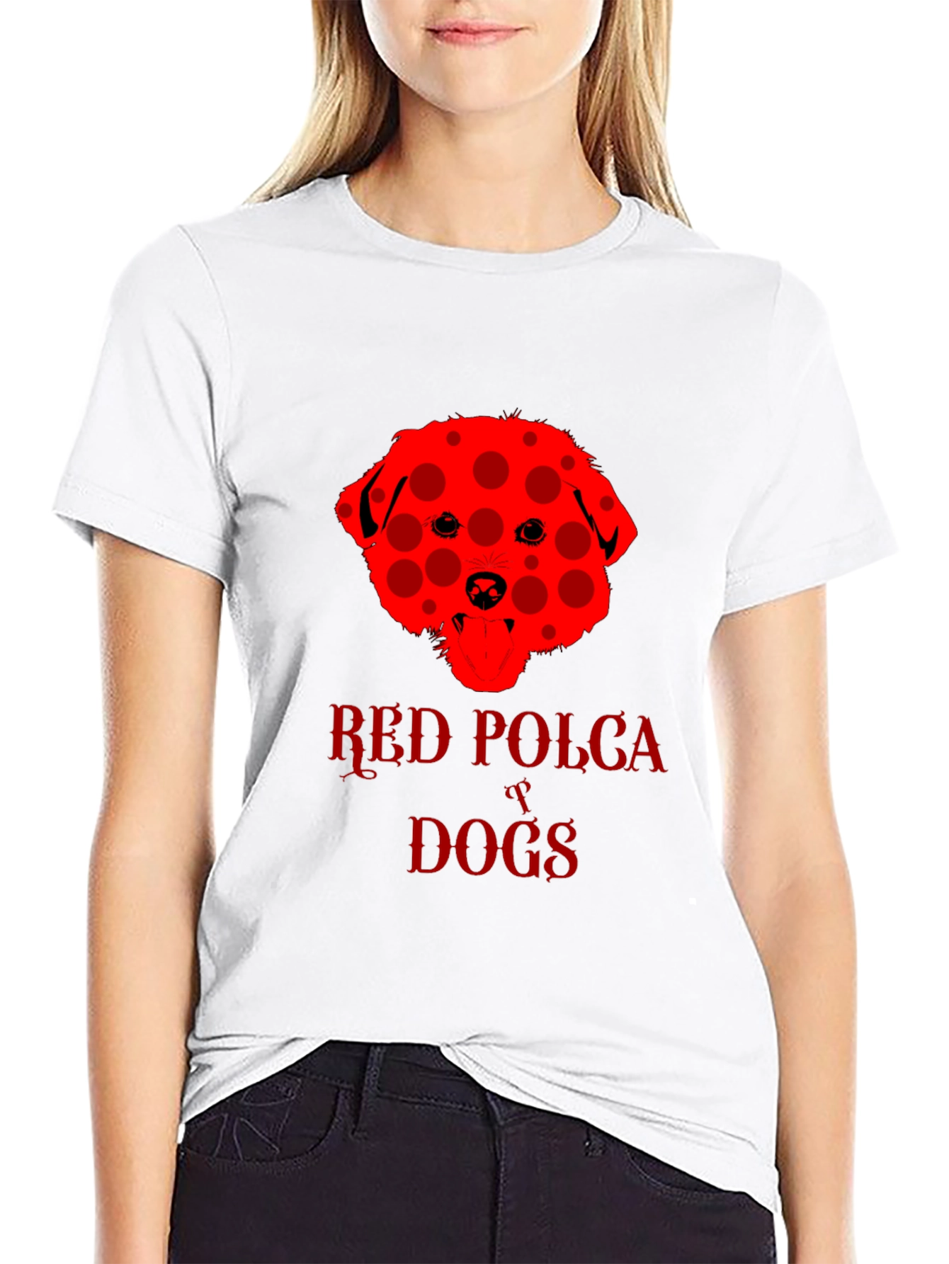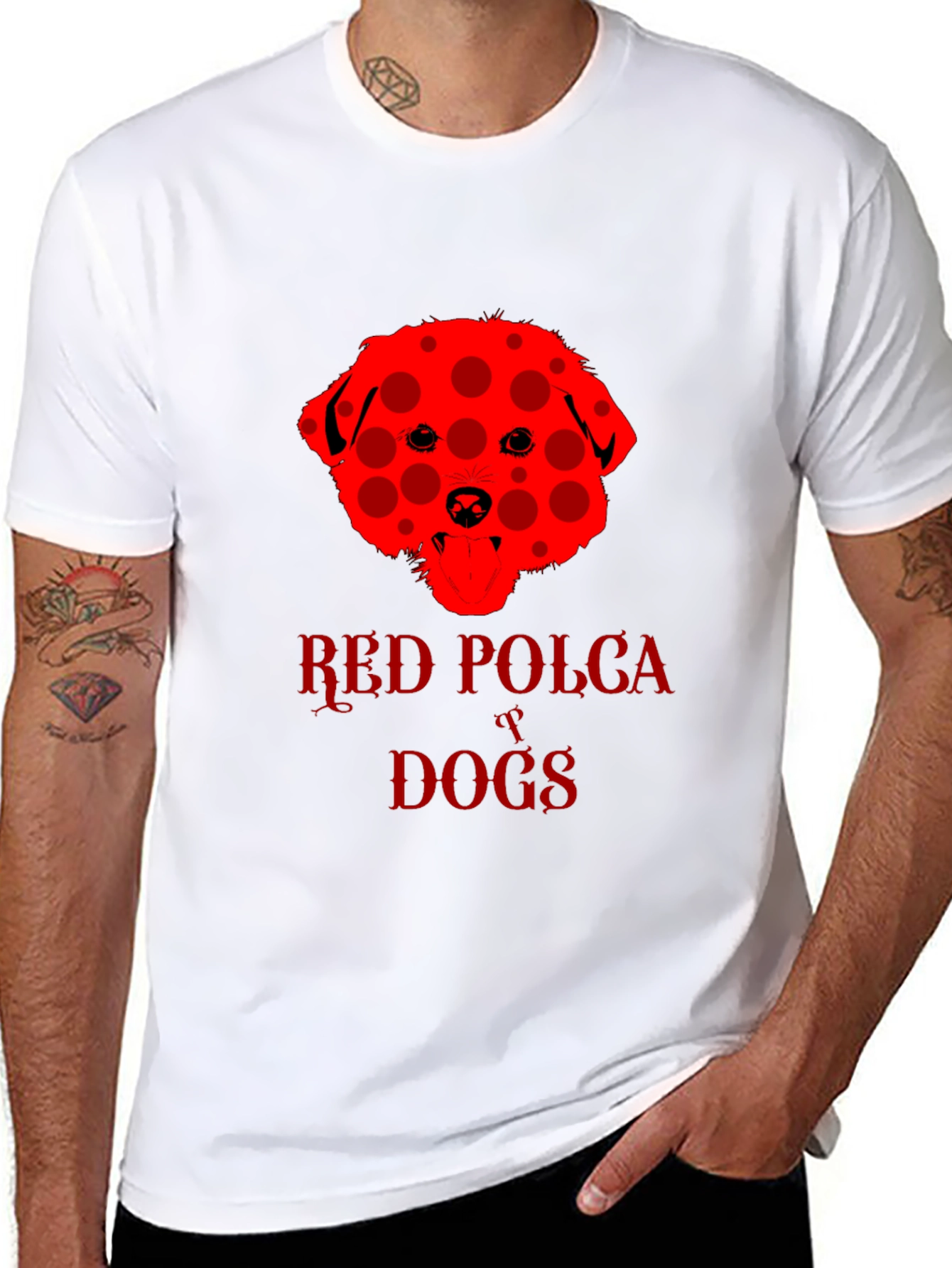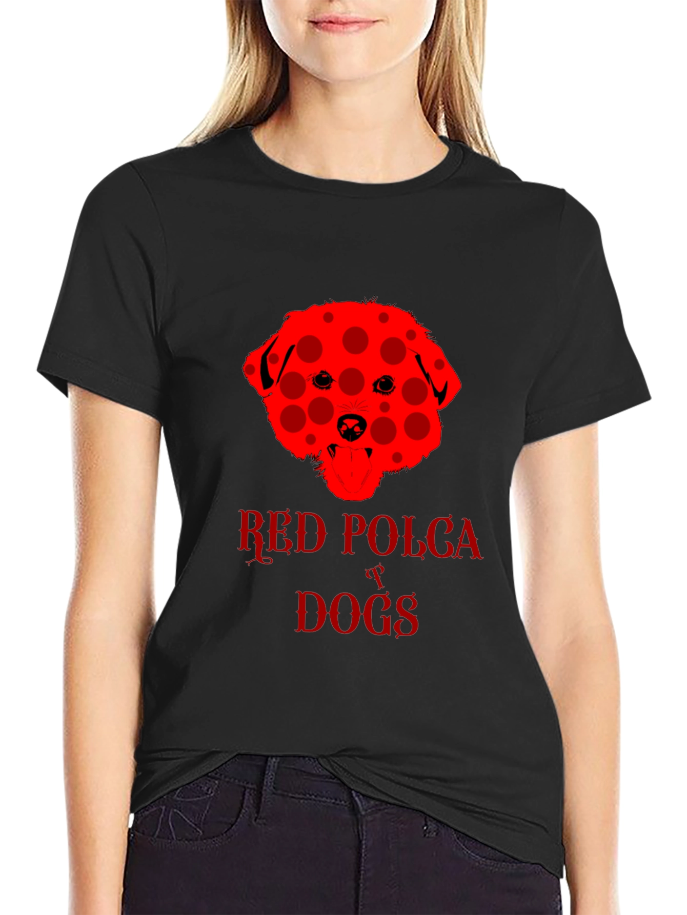 Show off your love for dogs with this eye-catching black t-shirt. The shirt features a unique red dog design with a playful polka dot pattern. "Red Polka Dogs" is emblazoned beneath the dog image in a matching red font. The classic crew neck and short sleeves provide a comfortable, casual fit. This tee is perfect for dog lovers and anyone who wants to add a touch of fun to their wardrobe. Wear it to the dog park, casual outings, or just lounging around the house. This shirt is sure to be a conversation starter and a fun way to express your personality.