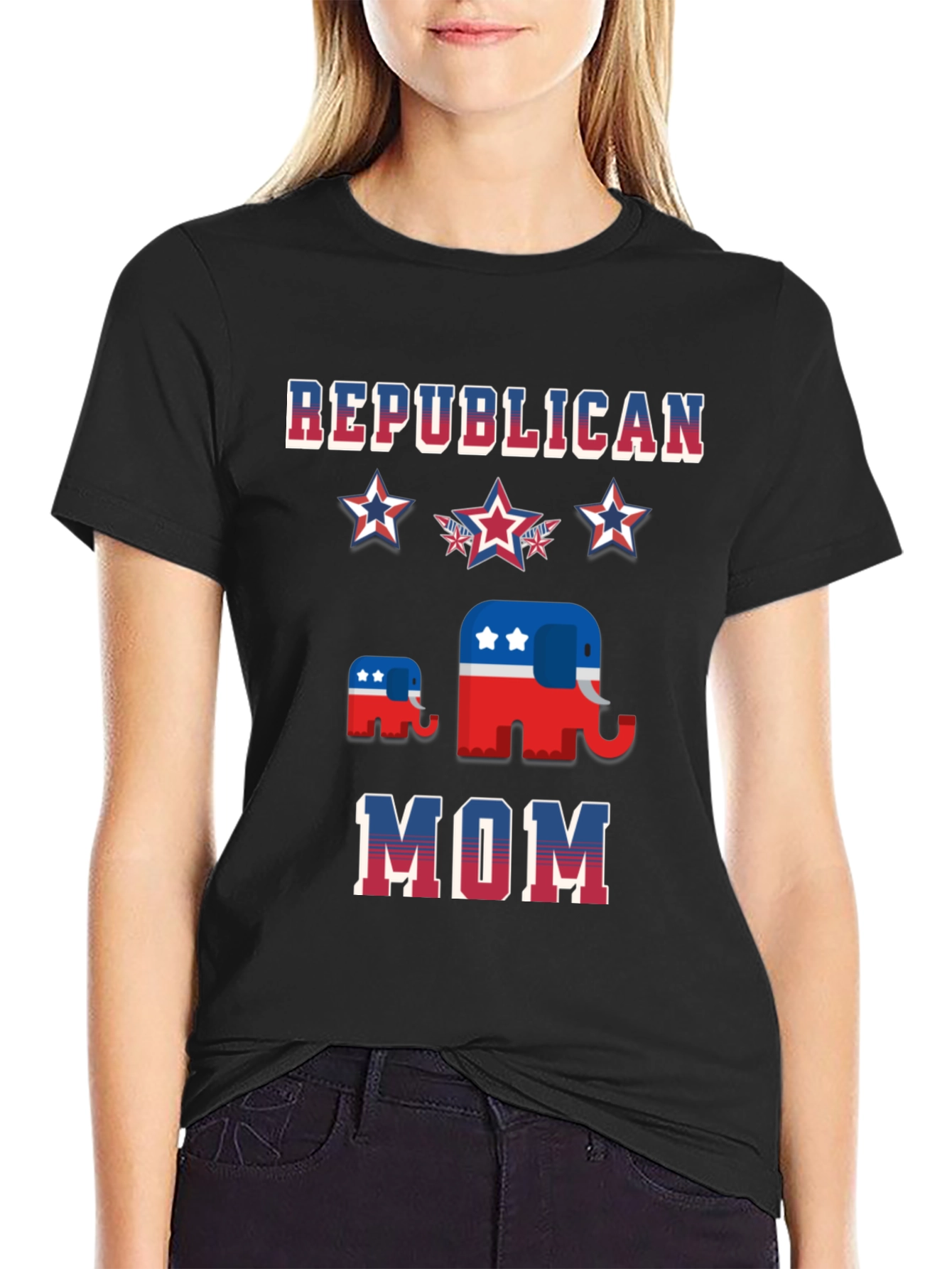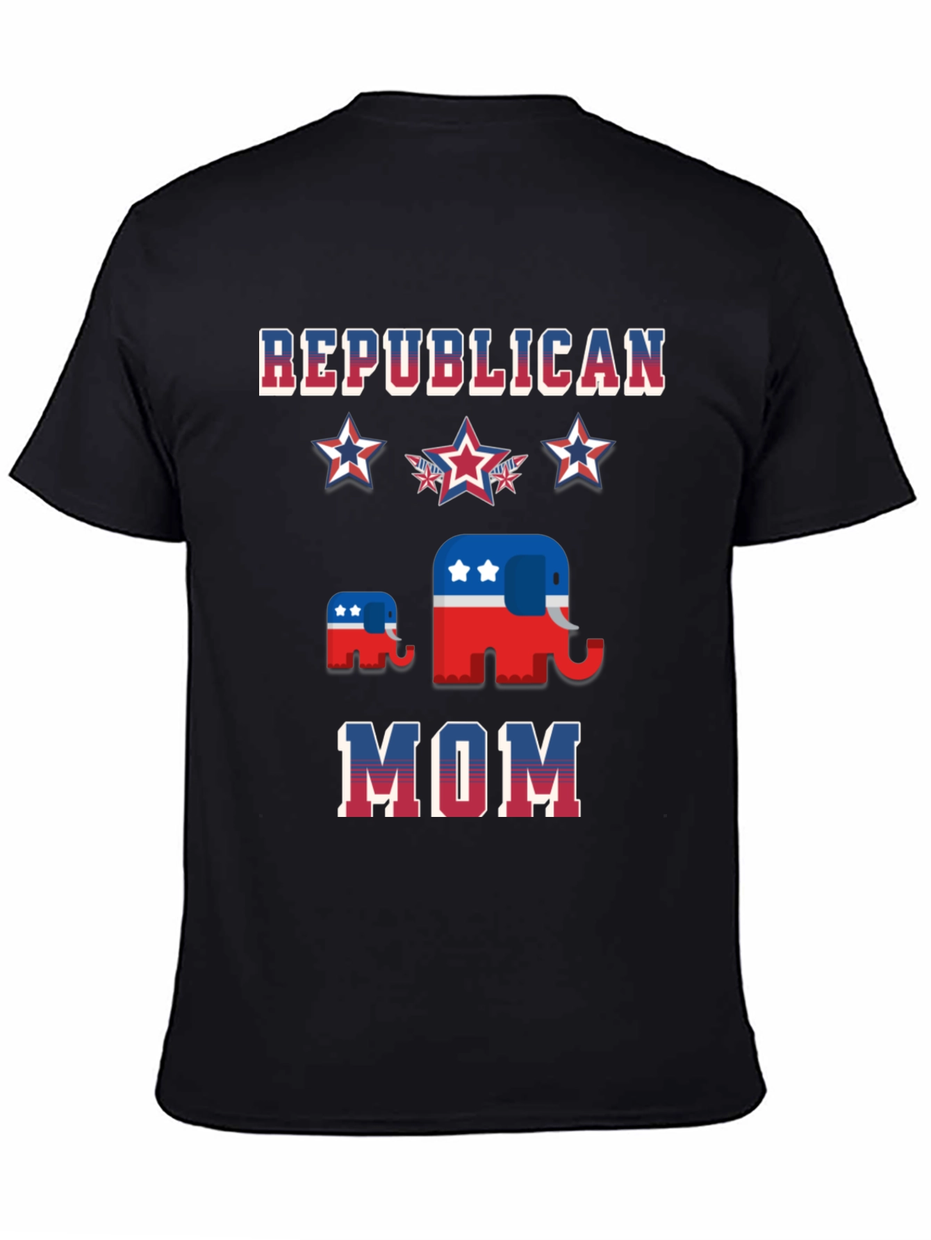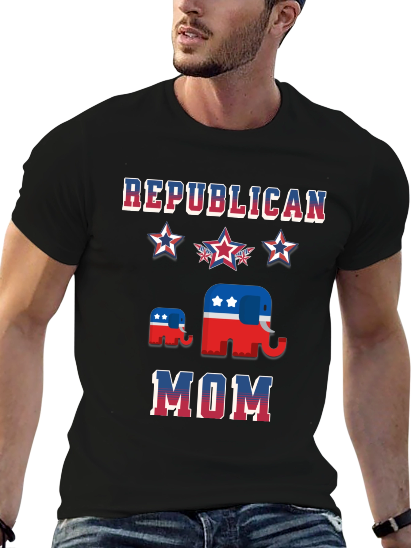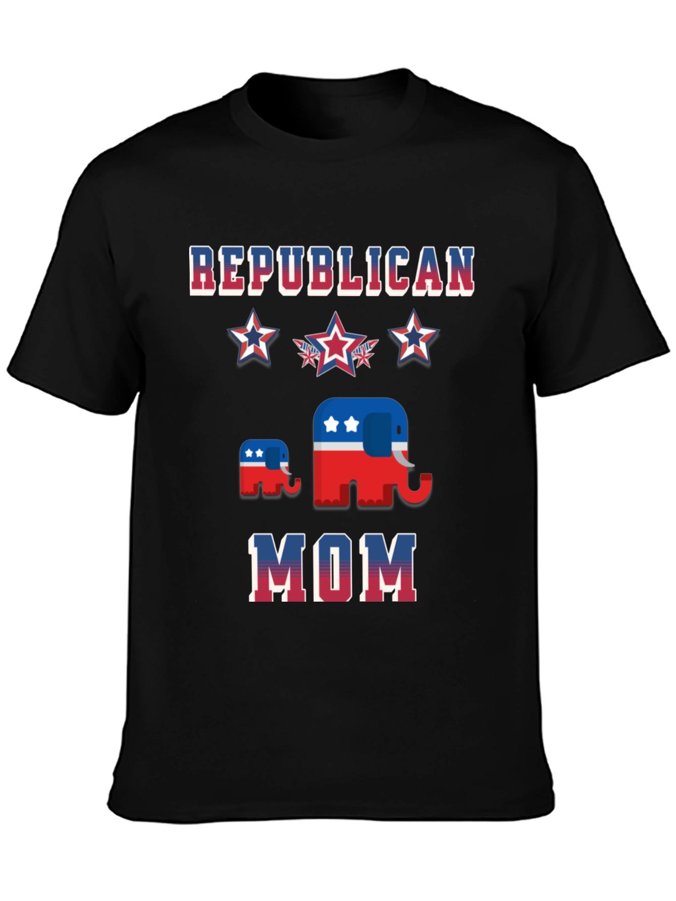 Show off your political pride and maternal love with this Republican Mom T-shirt! This black tee features a bold design with 'REPUBLICAN' printed above patriotic stars and two elephant silhouettes, followed by 'MOM' in a matching font. Perfect for casual wear, political events, or family gatherings. Made with comfortable, breathable fabric for all-day wear. A great way to express your values and role as a Republican mom!