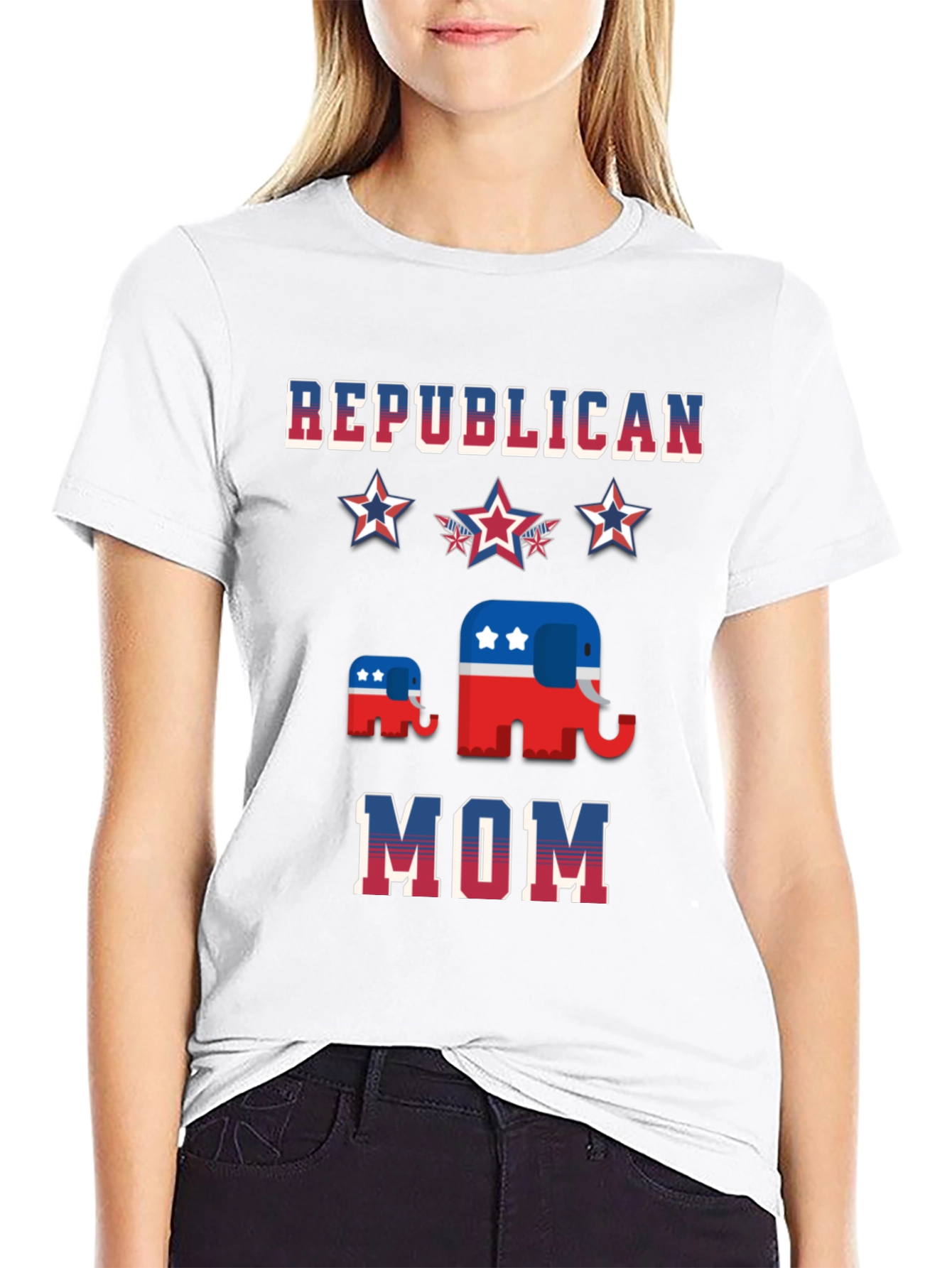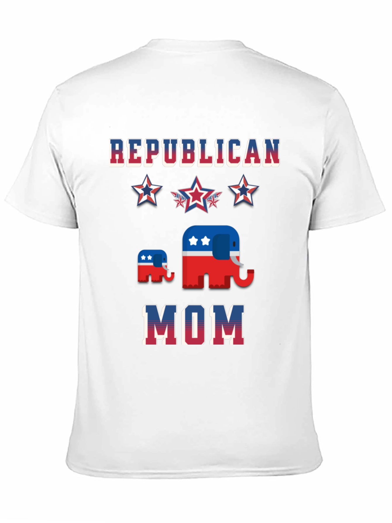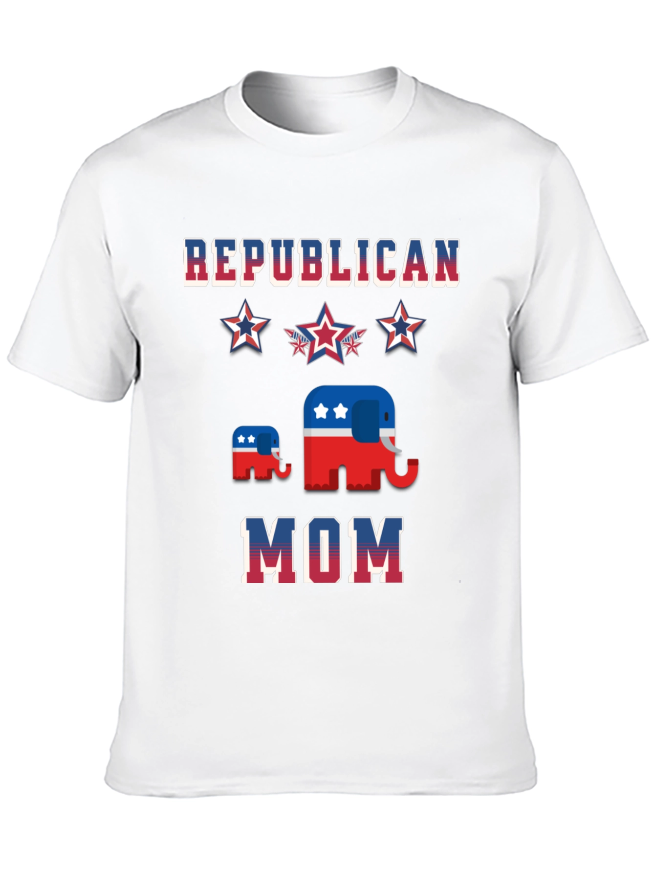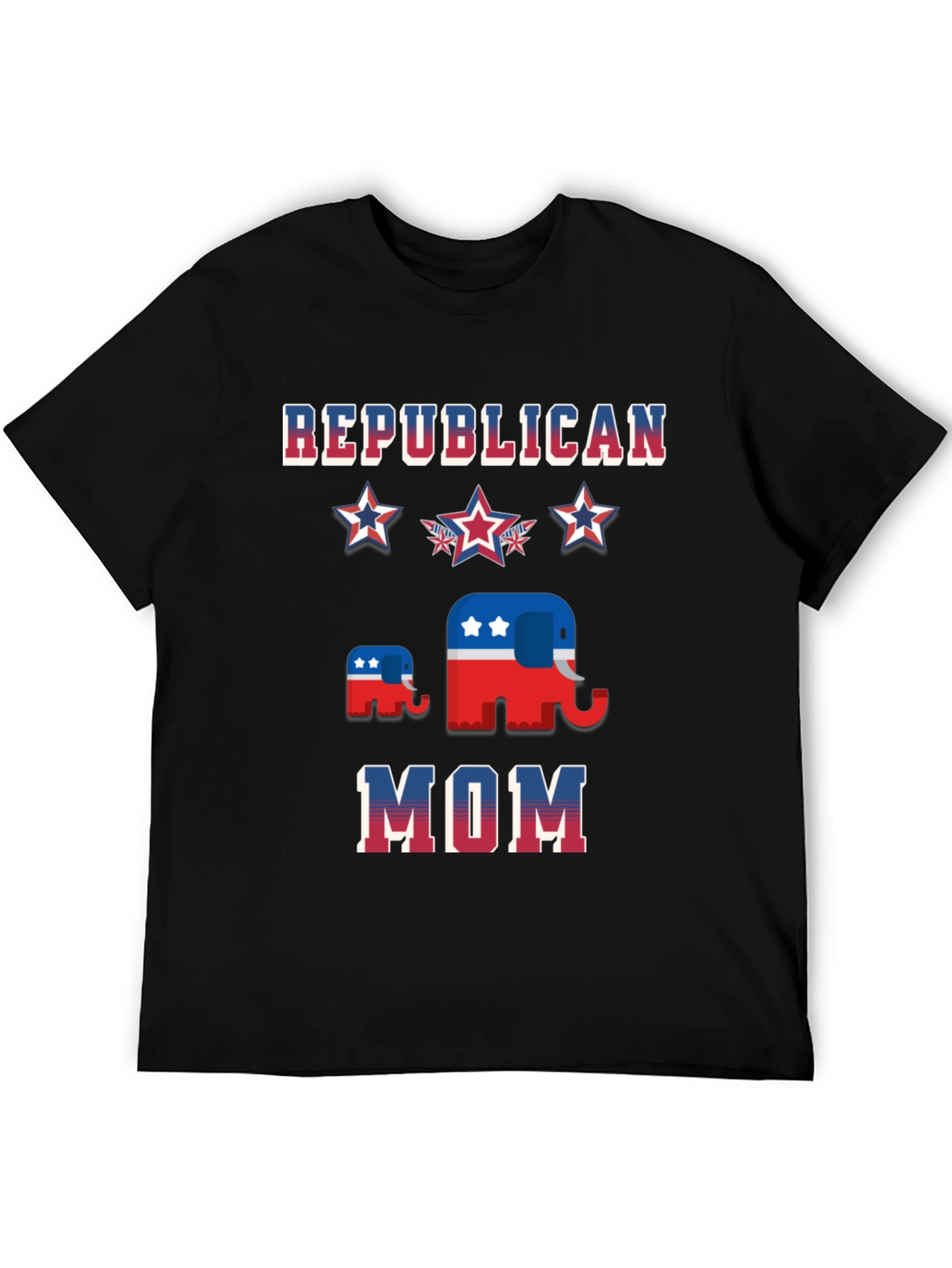 Show off your political pride and maternal love with this Republican Mom T-shirt! This black tee features a bold design with 'REPUBLICAN' printed above patriotic stars and two elephant silhouettes, followed by 'MOM' in a matching font. Perfect for casual wear, political events, or family gatherings. Made with comfortable, breathable fabric for all-day wear. A great way to express your values and role as a Republican mom!