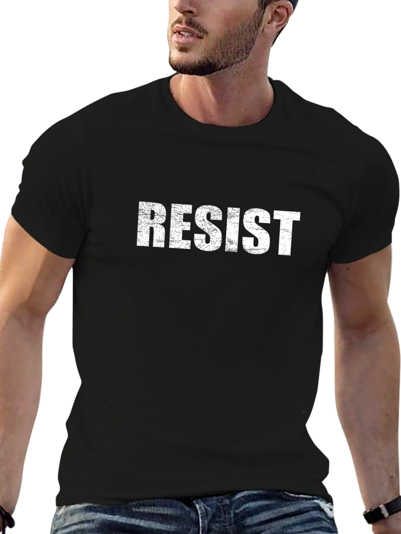 Make a statement with this bold black t-shirt featuring the word "RESIST" in distressed white lettering. Crafted from a comfortable-looking, potentially cotton blend, this short-sleeved tee offers both style and substance. The impactful graphic design is perfect for expressing your views. Wear it to rallies, protests, casual outings, or simply as a daily reminder to stand up for what you believe in. Its simple yet powerful message is sure to turn heads and spark conversations. A must-have for anyone looking to make a statement with their style.