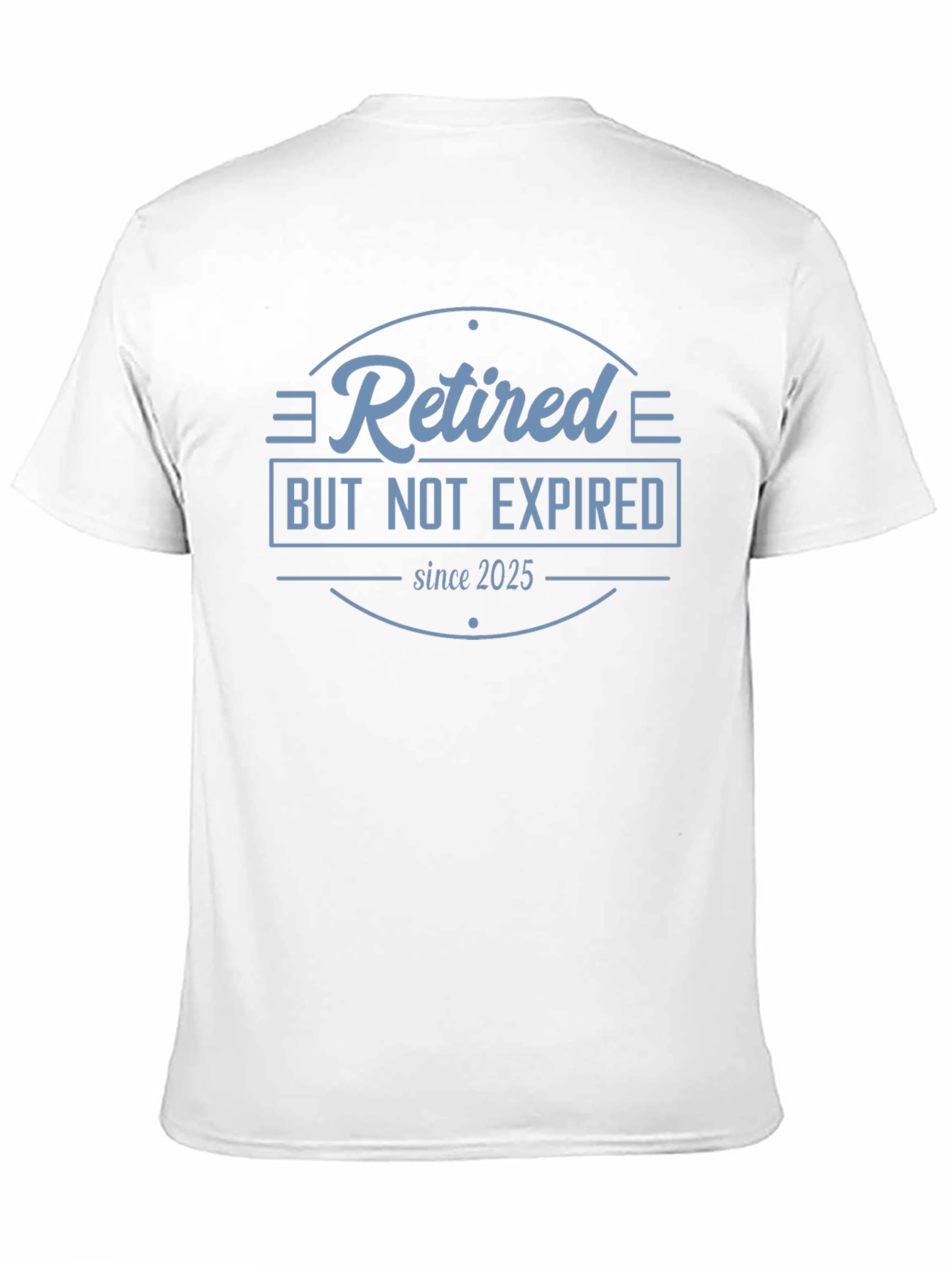 This black t-shirt features a unique and humorous graphic design, perfect for retirees with a sense of humor. The design includes the words "Retired" and "But Not Expired" along with "since 2025" displayed in a stylish, slightly distressed font. The shirt appears to be made of a comfortable, breathable material, ideal for everyday wear. Show off your retirement status with this fun and lighthearted t-shirt, great for casual outings, family gatherings, or simply lounging around the house. It's a great conversation starter and a fun way to embrace retirement. This shirt makes a perfect gift for the recently retired.