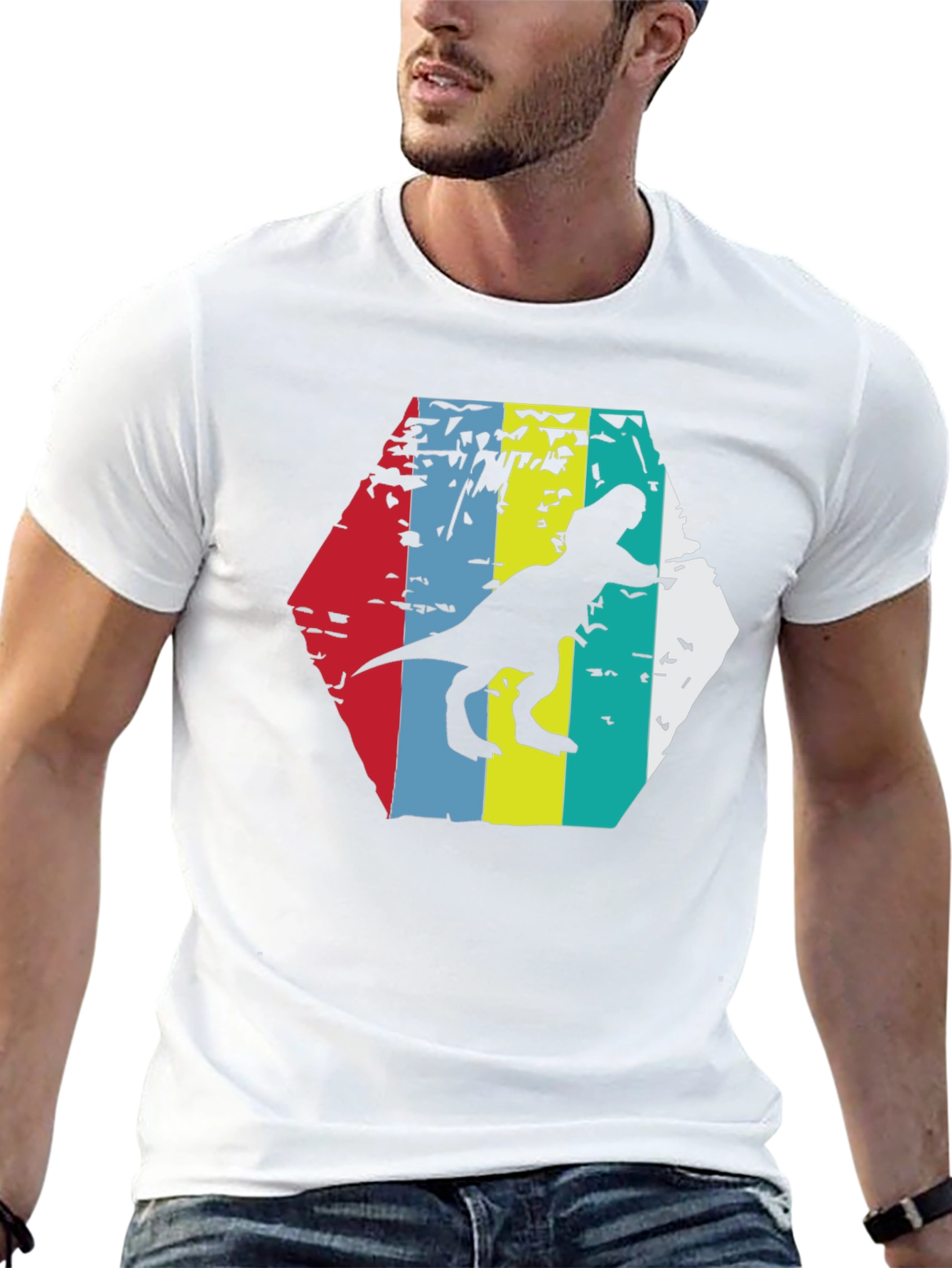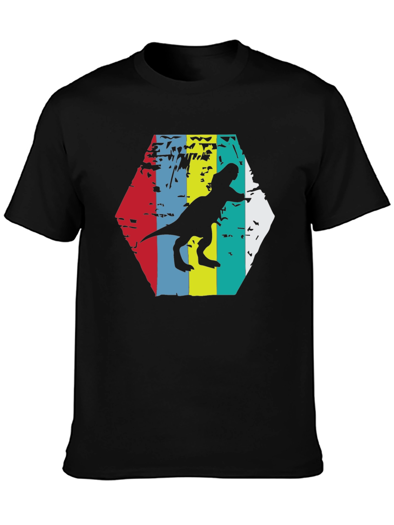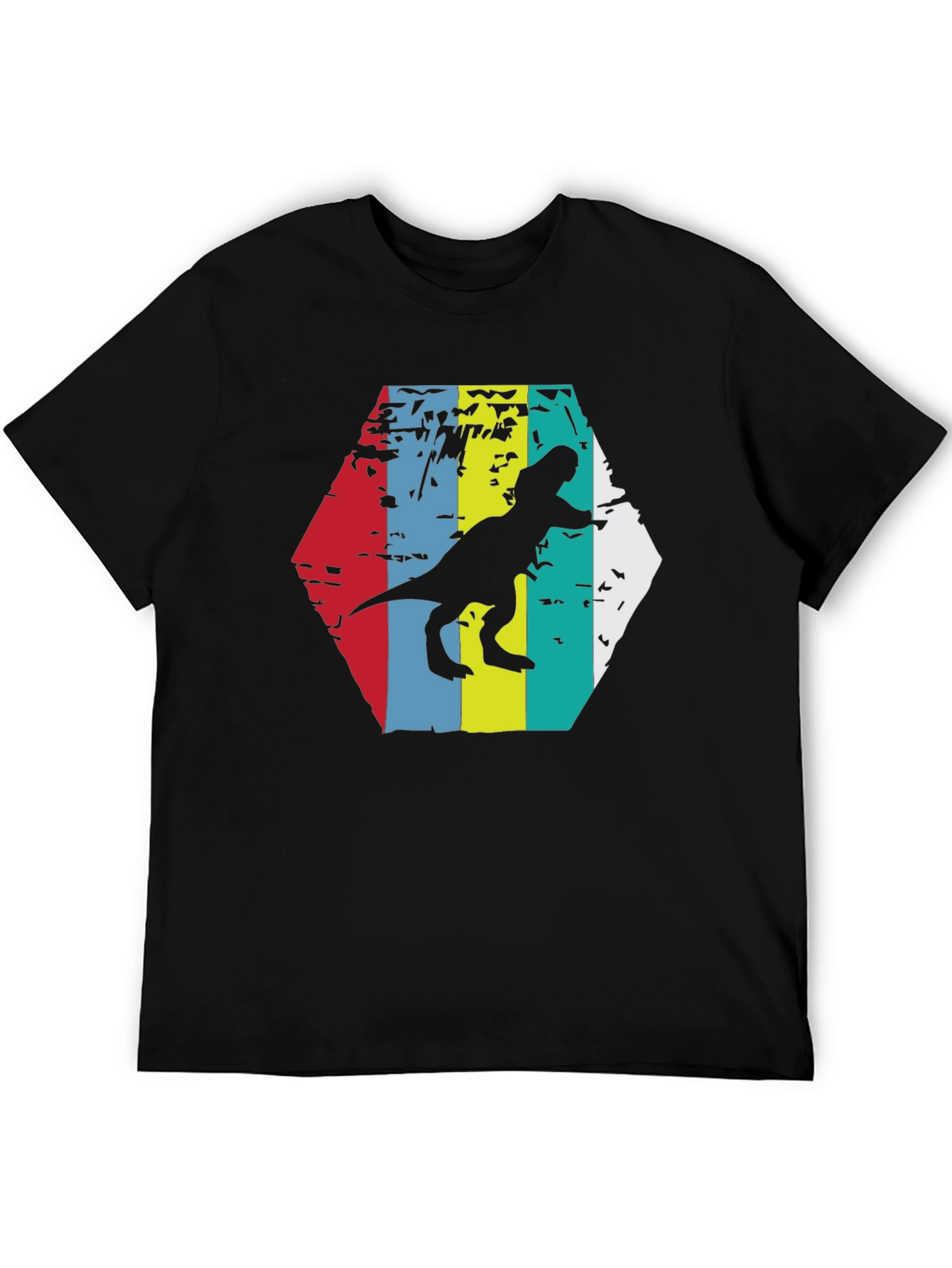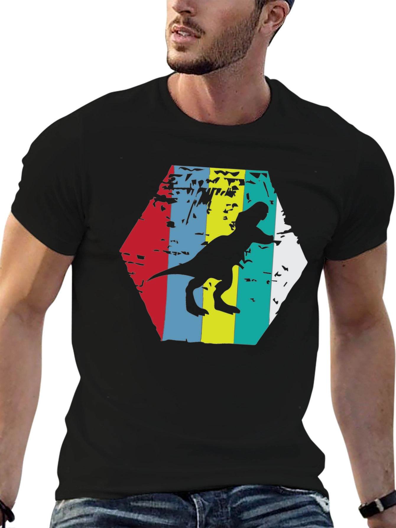 Roam back in time with this eye-catching retro-themed t-shirt. The shirt features a bold, distressed hexagon design in vibrant red, blue, yellow, and teal stripes, framing a striking black dinosaur silhouette. Crafted from a comfortable, likely cotton blend, this tee offers a classic fit suitable for everyday wear. Show off your love for prehistoric creatures with a vintage twist. Perfect for casual outings, dinosaur enthusiasts, or anyone who appreciates a unique and stylish statement piece. Add some Jurassic flair to your wardrobe!