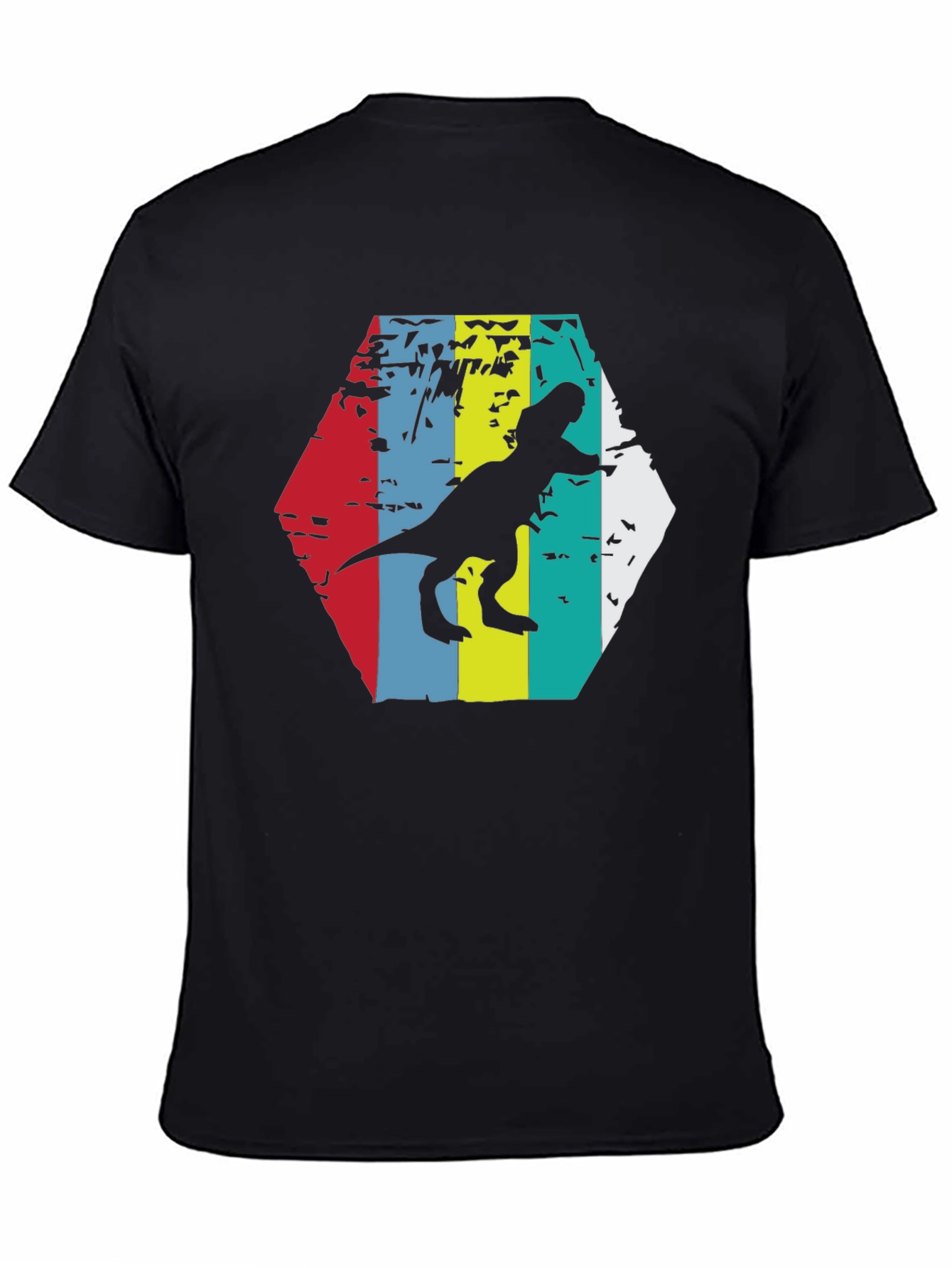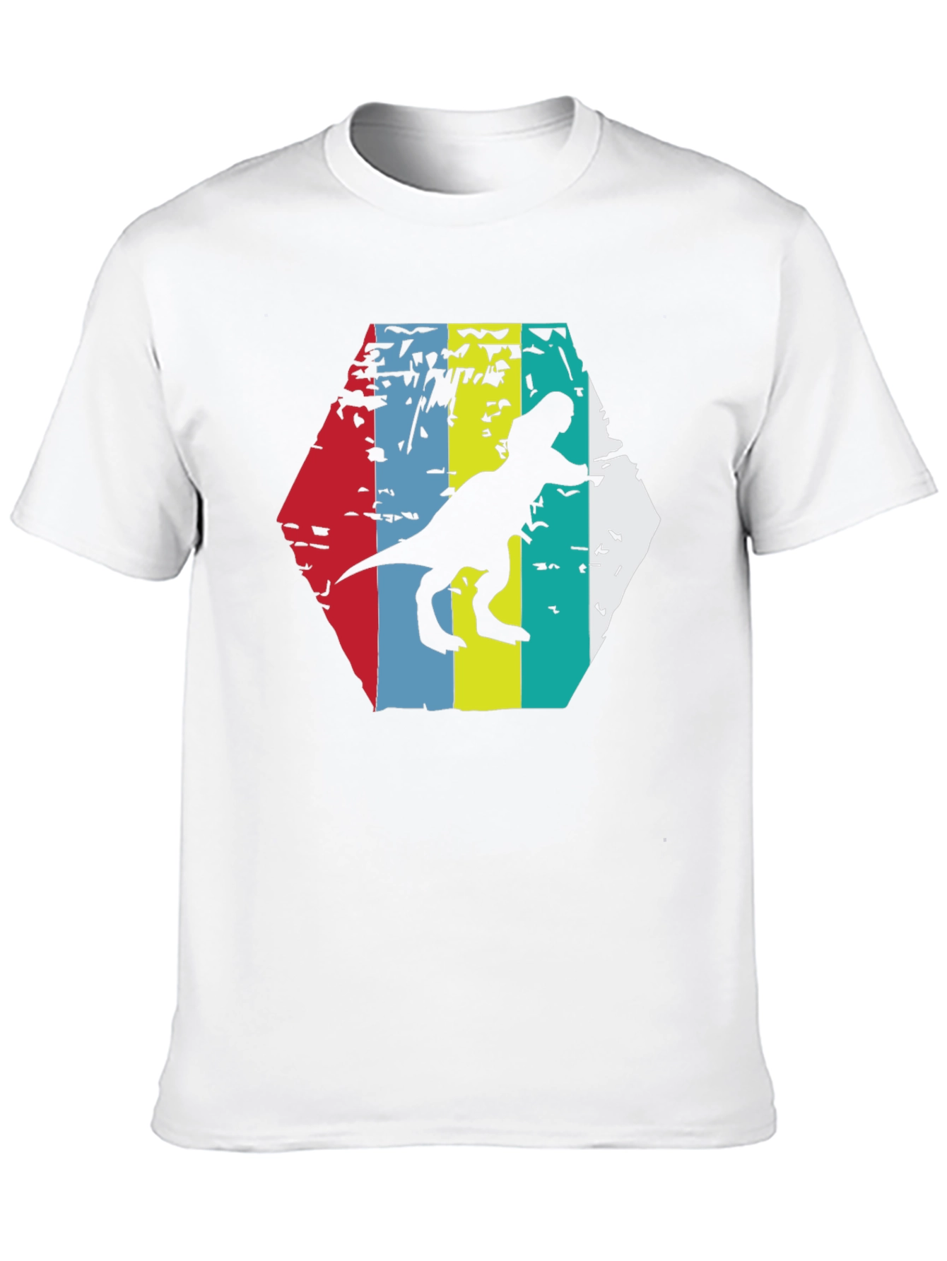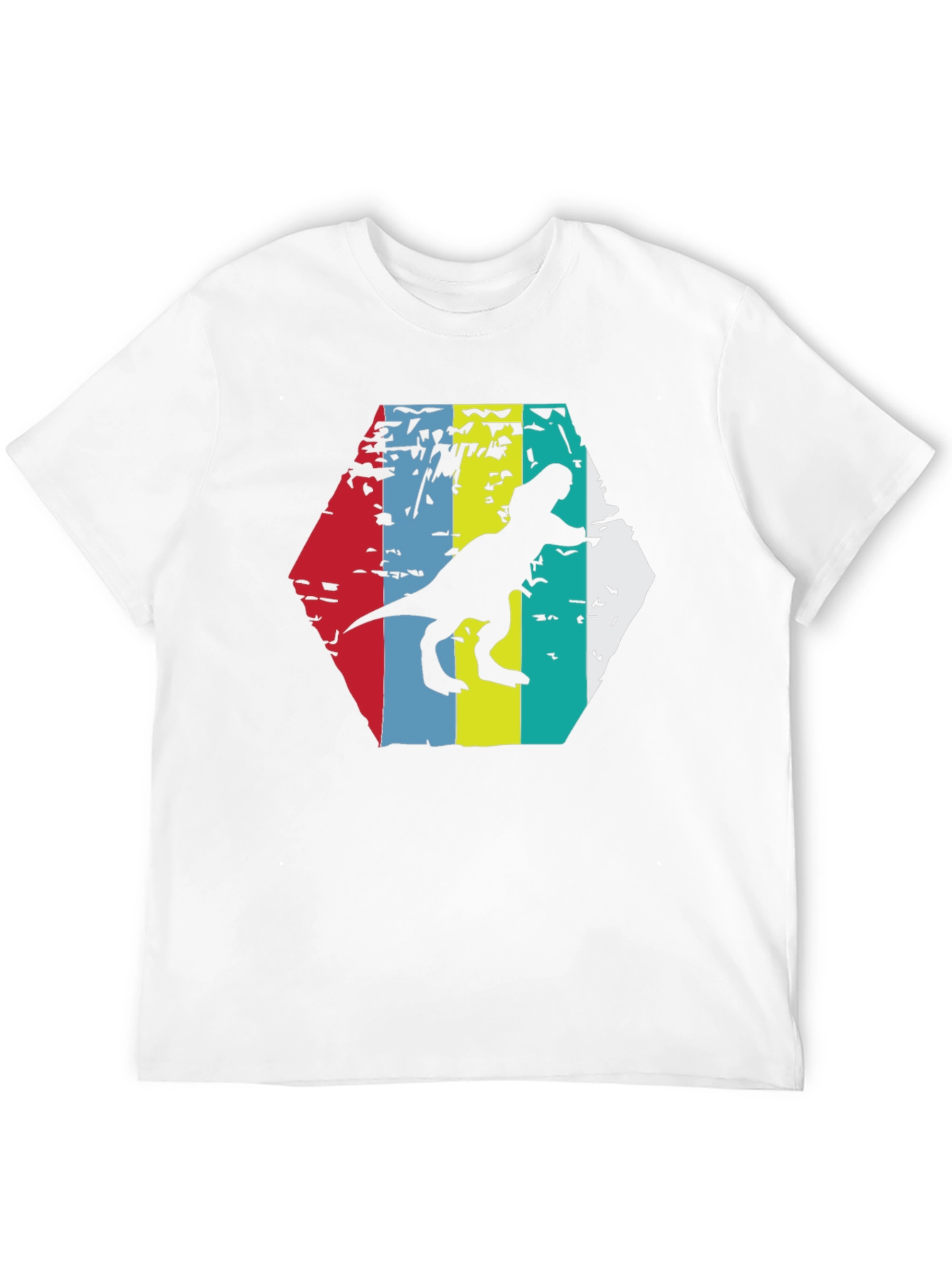 Roam back in time with this eye-catching retro-themed t-shirt. The shirt features a bold, distressed hexagon design in vibrant red, blue, yellow, and teal stripes, framing a striking black dinosaur silhouette. Crafted from a comfortable, likely cotton blend, this tee offers a classic fit suitable for everyday wear. Show off your love for prehistoric creatures with a vintage twist. Perfect for casual outings, dinosaur enthusiasts, or anyone who appreciates a unique and stylish statement piece. Add some Jurassic flair to your wardrobe!