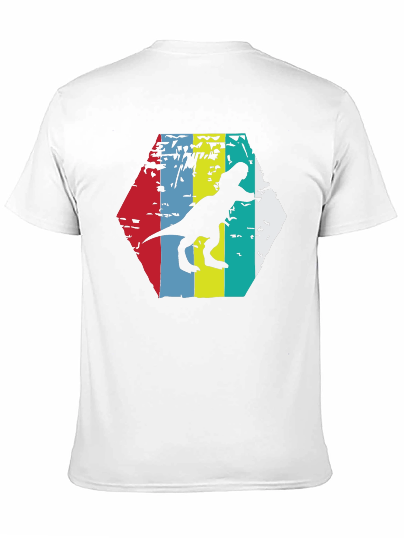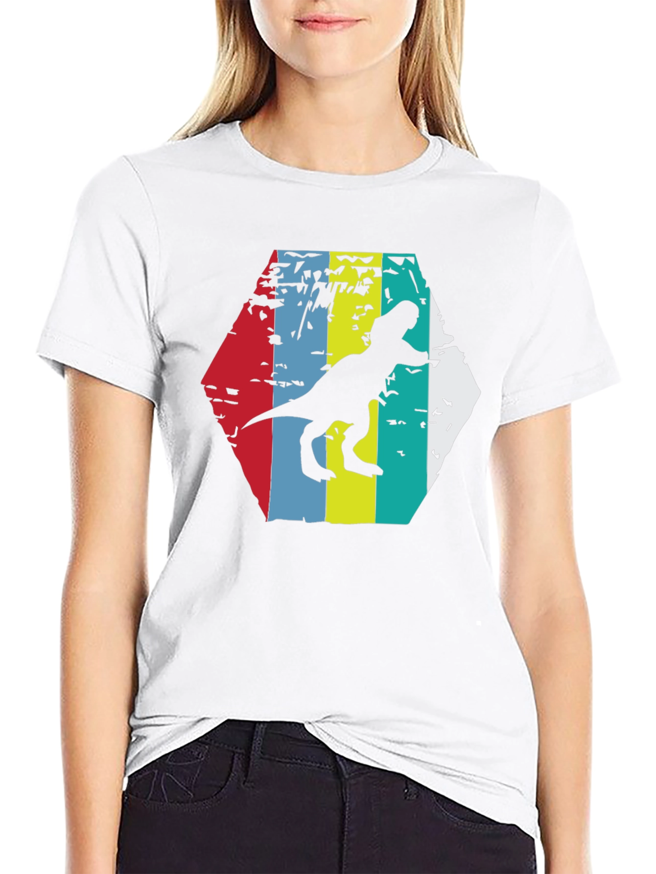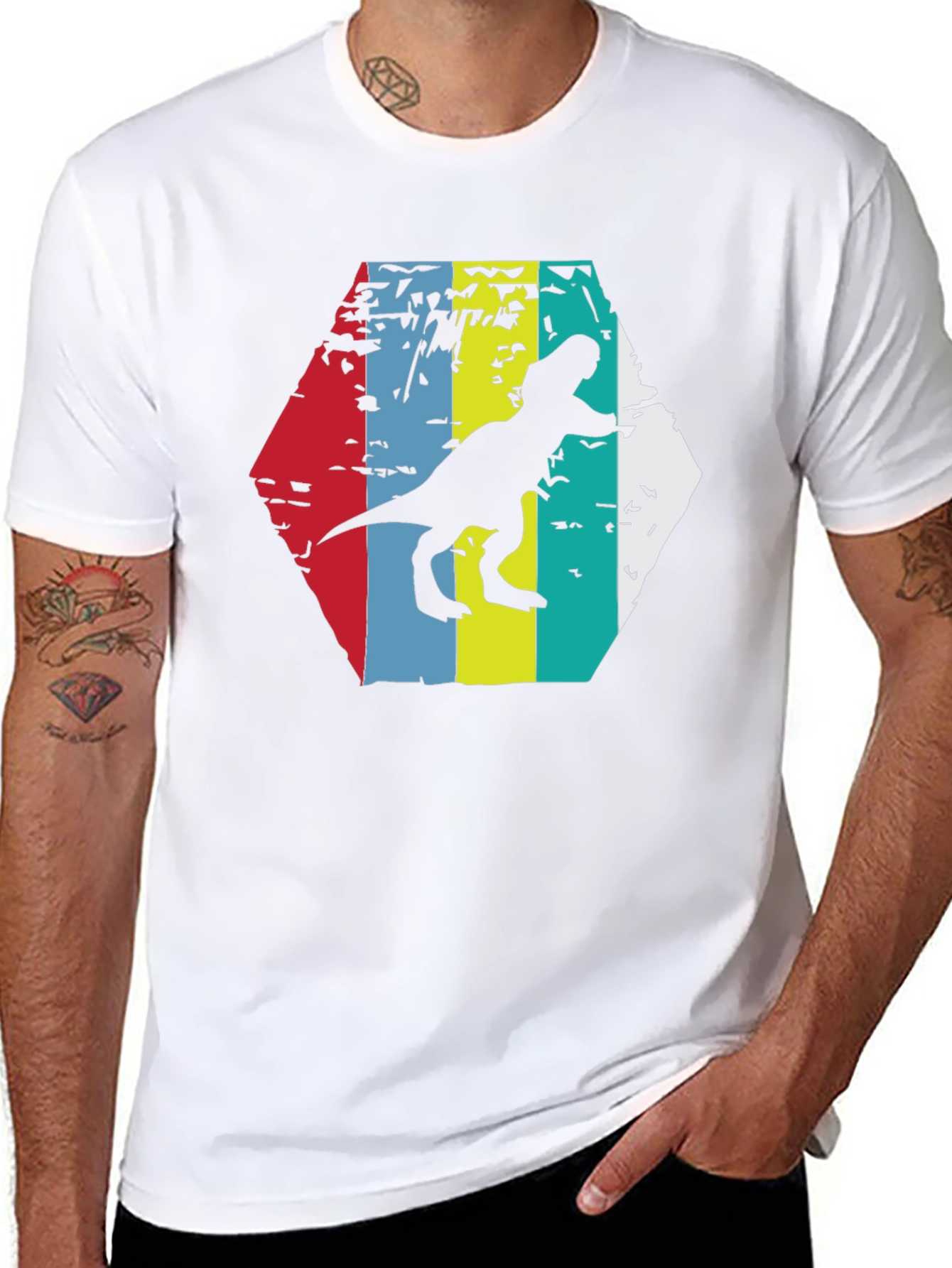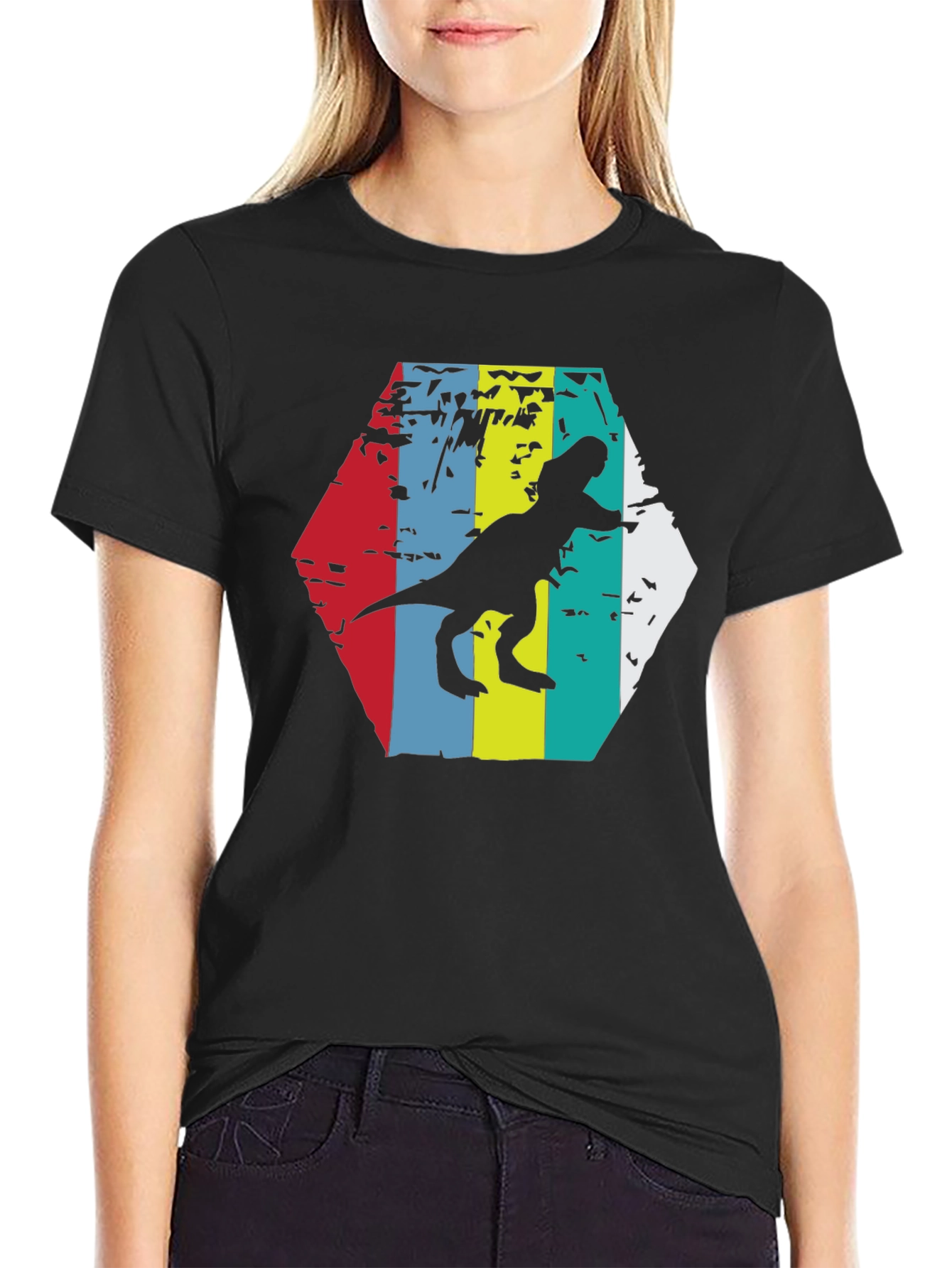 Roam back in time with this eye-catching retro-themed t-shirt. The shirt features a bold, distressed hexagon design in vibrant red, blue, yellow, and teal stripes, framing a striking black dinosaur silhouette. Crafted from a comfortable, likely cotton blend, this tee offers a classic fit suitable for everyday wear. Show off your love for prehistoric creatures with a vintage twist. Perfect for casual outings, dinosaur enthusiasts, or anyone who appreciates a unique and stylish statement piece. Add some Jurassic flair to your wardrobe!