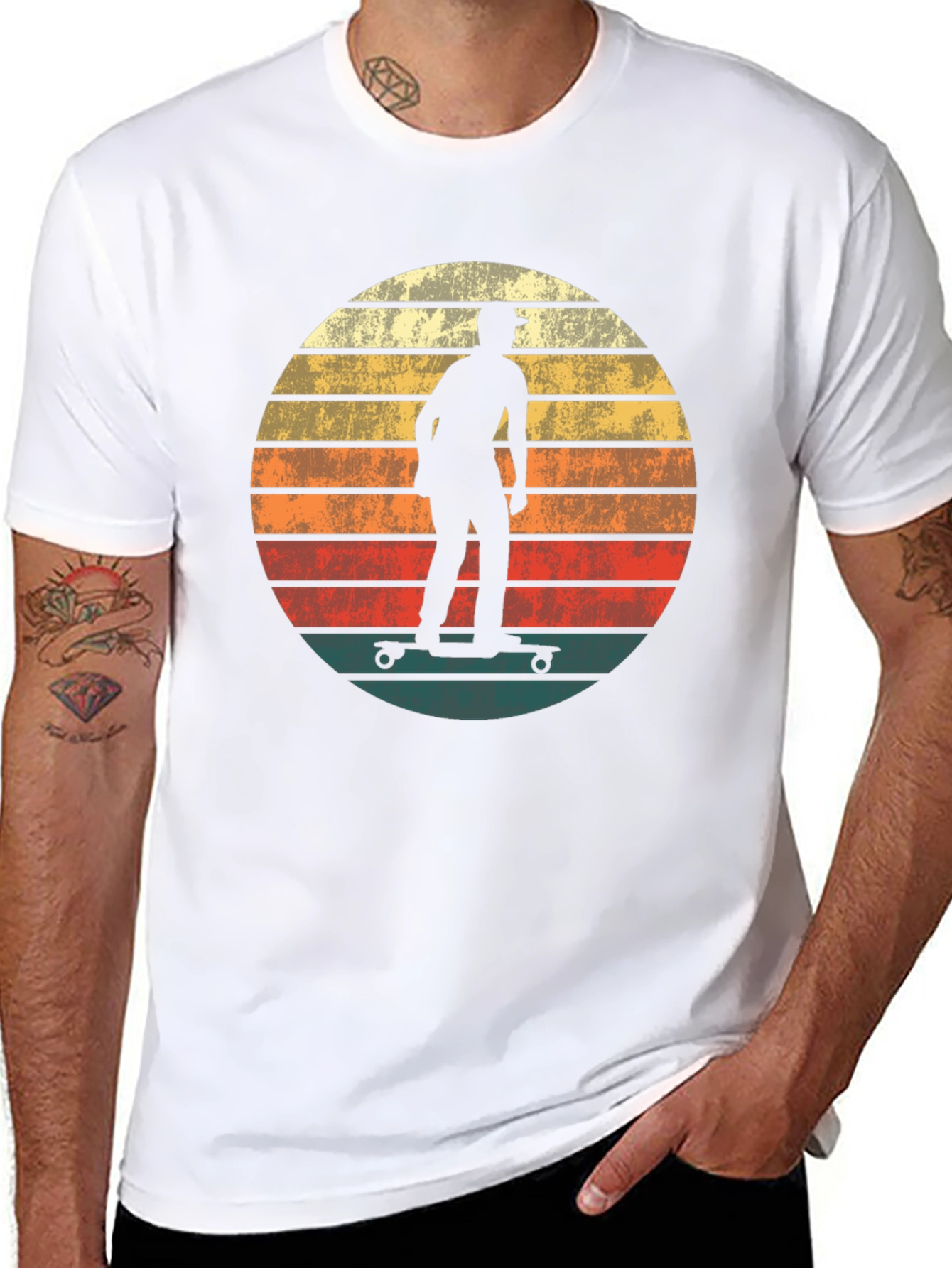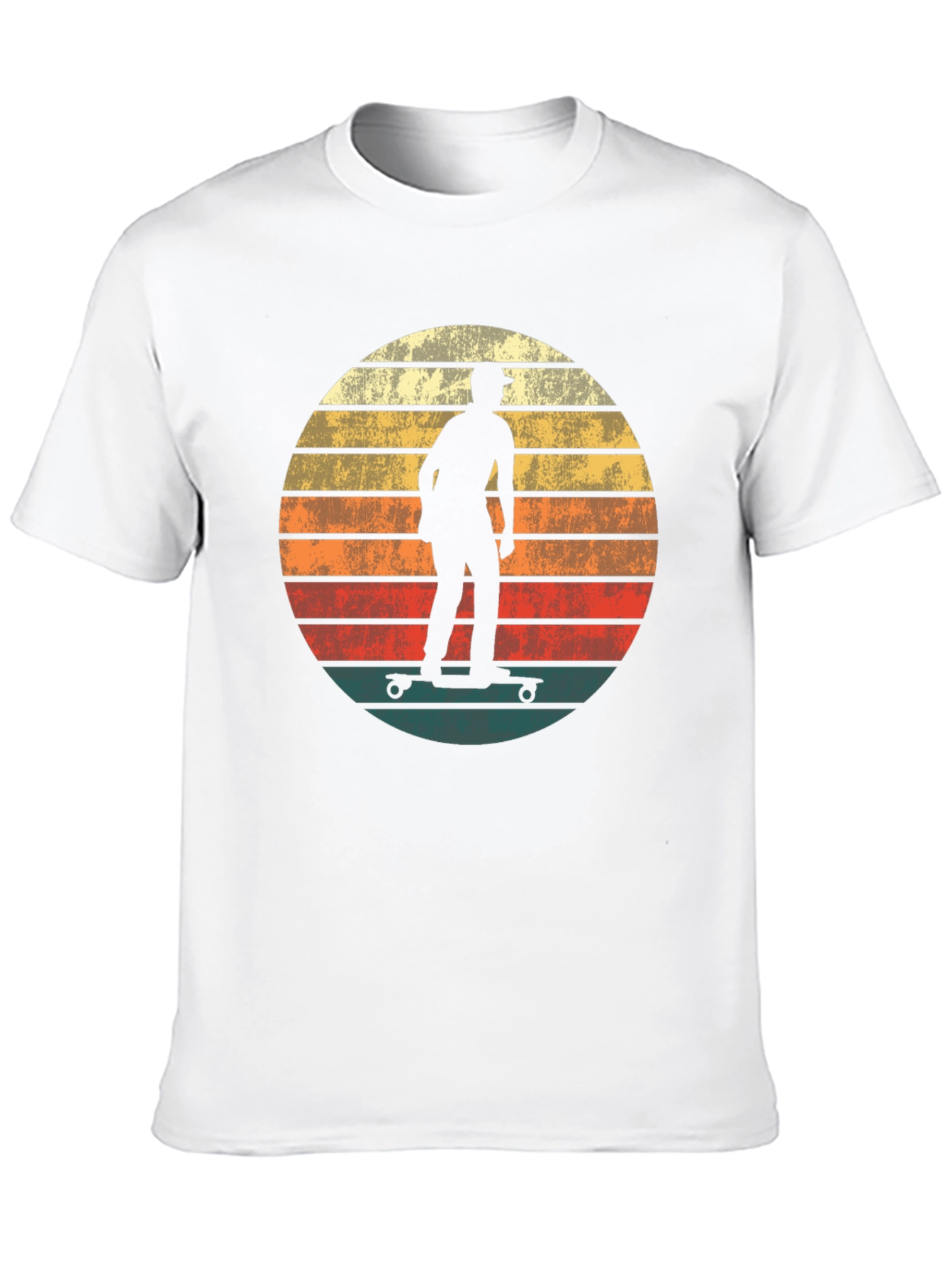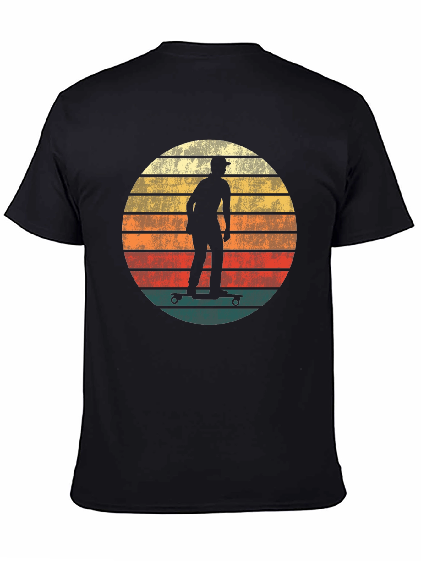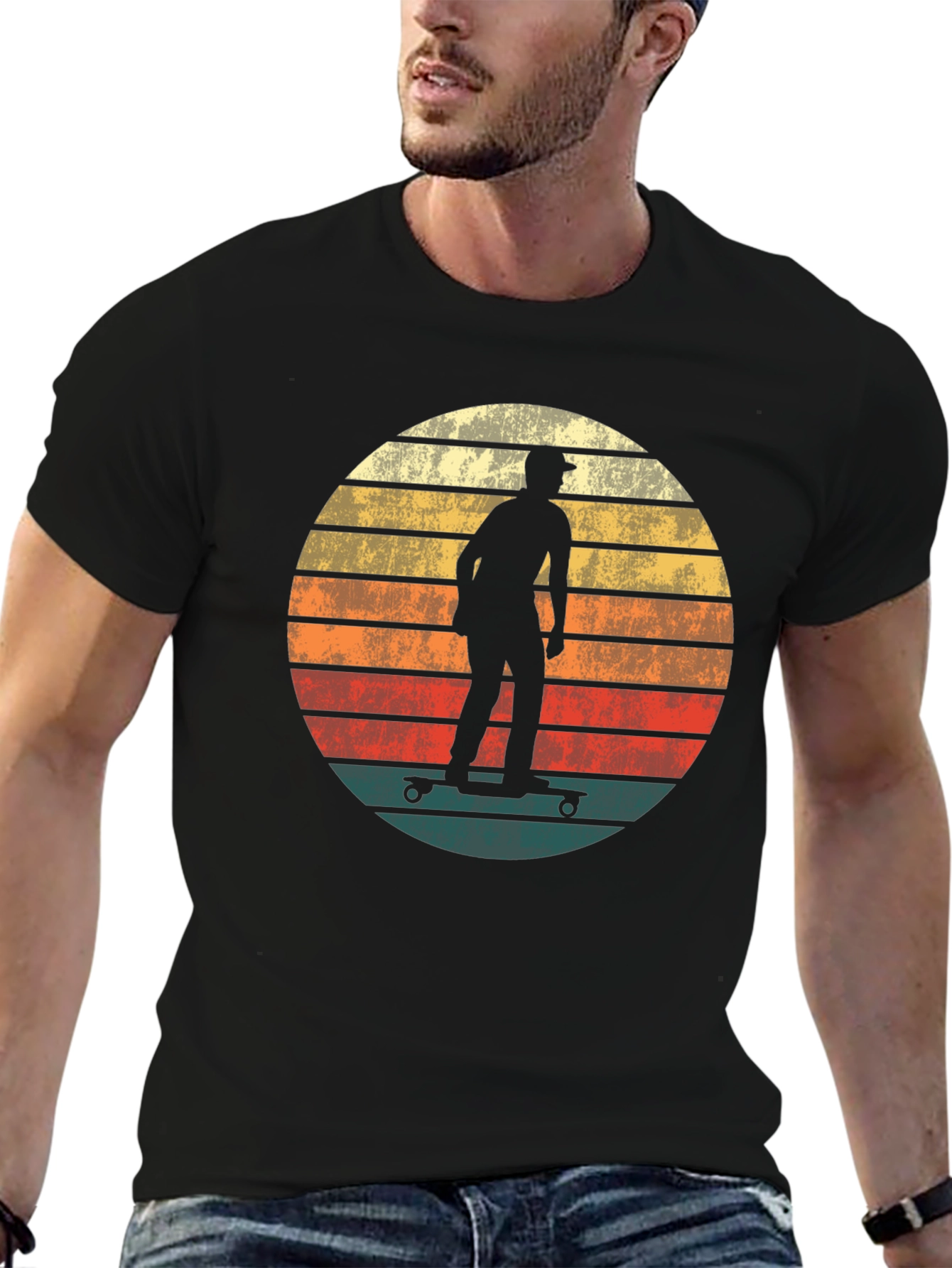 Embrace vintage vibes with this stylish black graphic tee. It features a retro-inspired sunset circle design with a silhouetted skateboarder adding a cool, laid-back touch. The design blends colors that evokes a vintage feel. Made from comfortable fabric, this short-sleeved shirt is perfect for casual wear, skateboarding sessions, or adding a unique element to your everyday style. Pair it with jeans, shorts, or chinos for a versatile and effortless look that will turn heads wherever you go. Stand out from the crowd and showcase your love for skateboarding with this eye-catching tee.