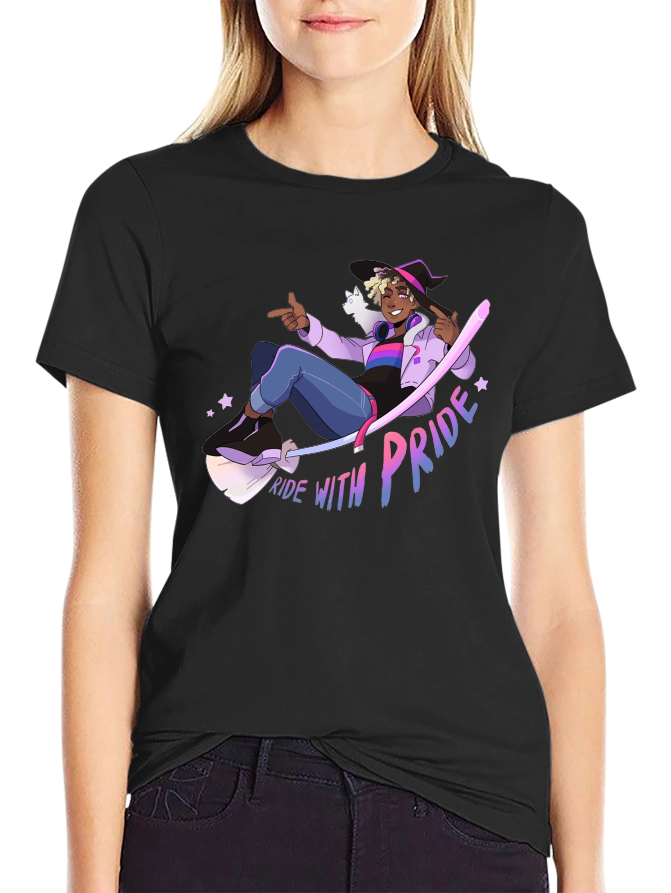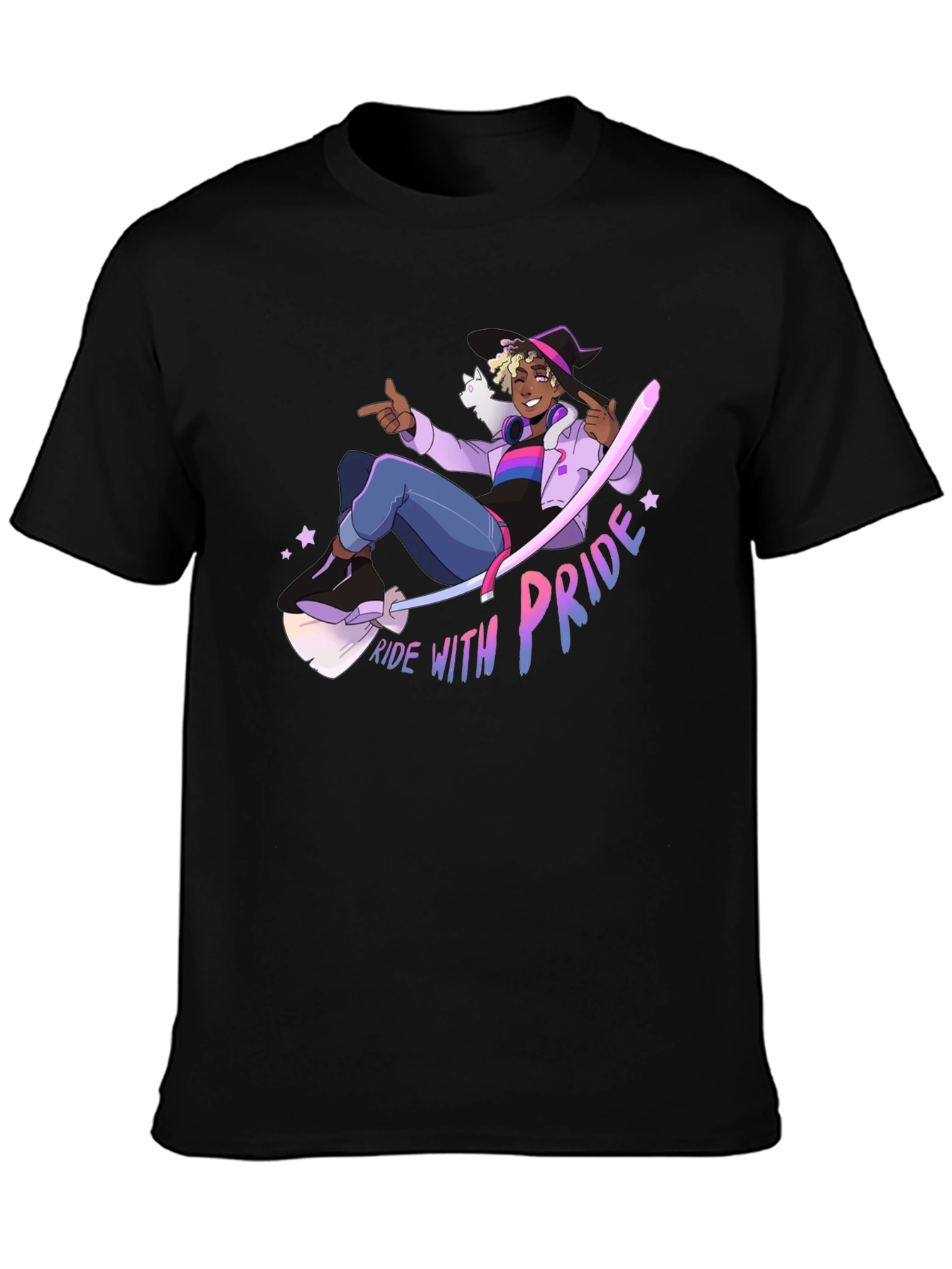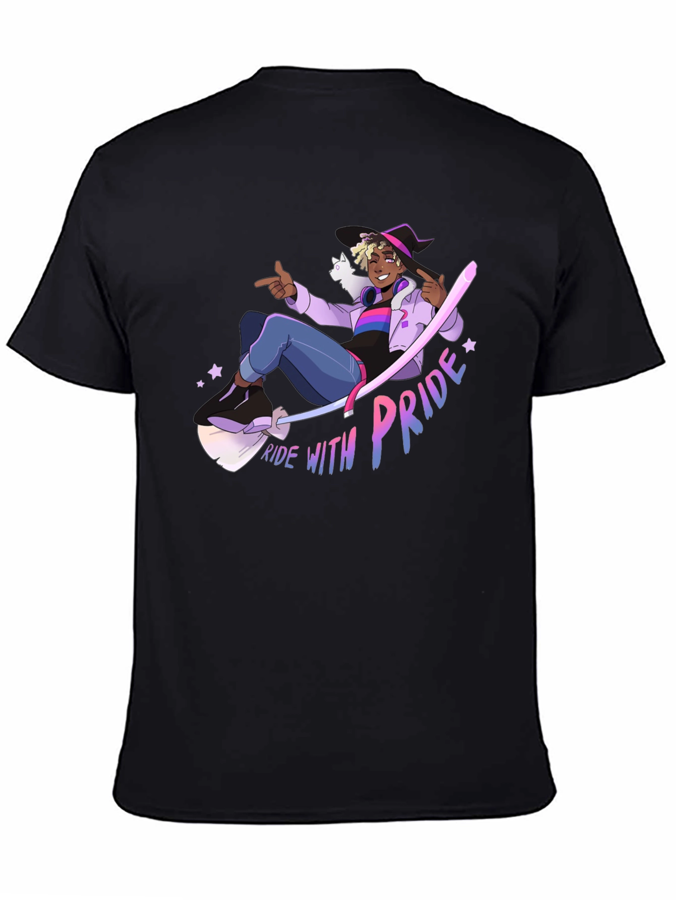 Show your pride with this unique black graphic tee! Featuring a vibrant, cartoon-style design of a cool witch character riding a broom, this t-shirt is a bold statement piece. The design includes the phrase "Ride With Pride" in eye-catching rainbow lettering. The character's outfit incorporates the colors of the bisexual flag on the shirt, adding a subtle touch of support. Perfect for casual wear, pride events, or anyone who wants to make a statement, this t-shirt is sure to turn heads and spark conversations.