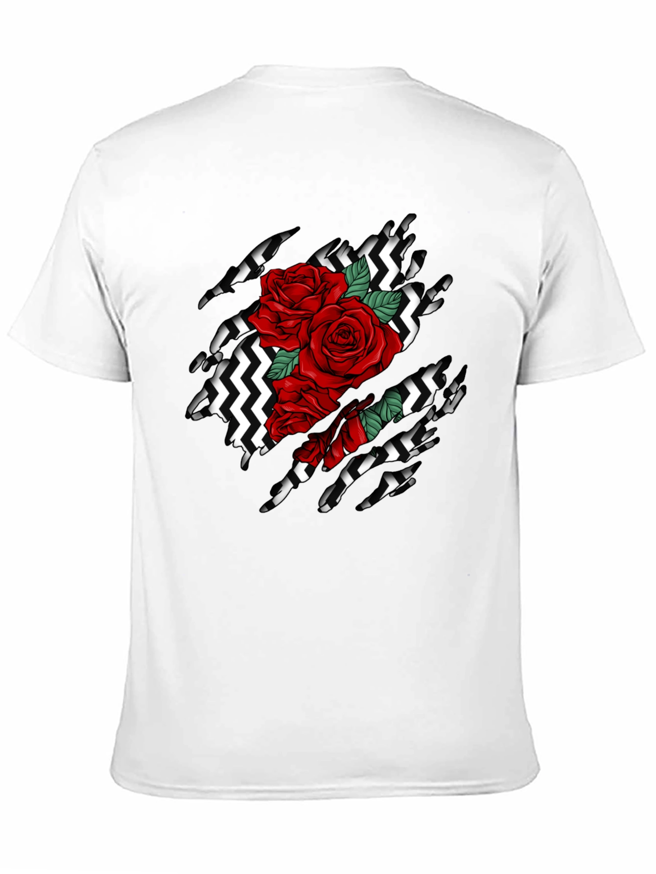 Elevate your style with this striking black graphic t-shirt. The tee features a bold, eye-catching design of ripped fabric revealing a vibrant red rose bouquet over a black and white chevron pattern. Crafted from comfortable, breathable fabric, this shirt is perfect for everyday wear. Its unique design makes it a standout piece for casual outings, concerts, or adding an edgy touch to your wardrobe. Express your individuality with this statement t-shirt that blends classic floral imagery with a modern, deconstructed aesthetic. Make a statement and turn heads with this unique ripped rose graphic tee!