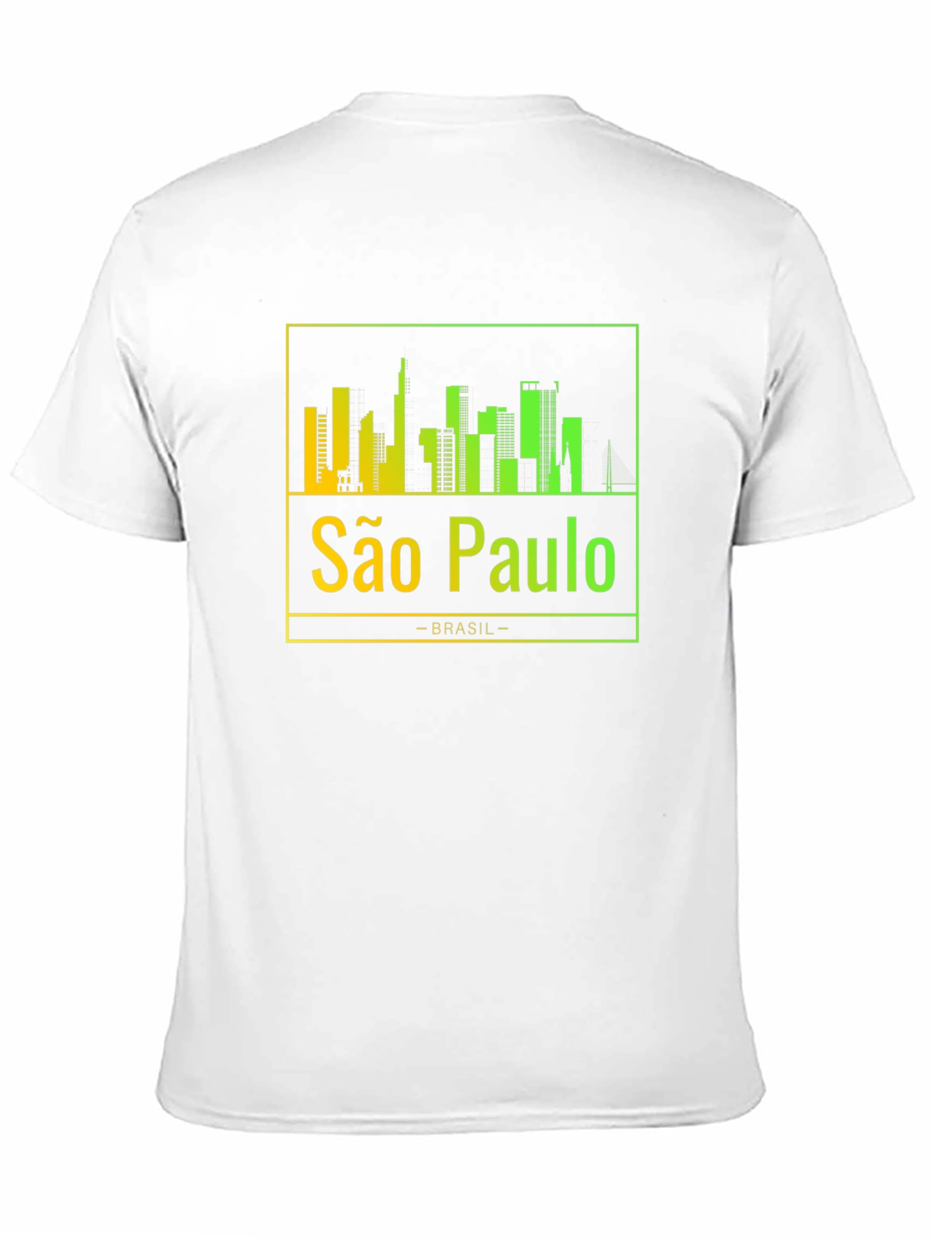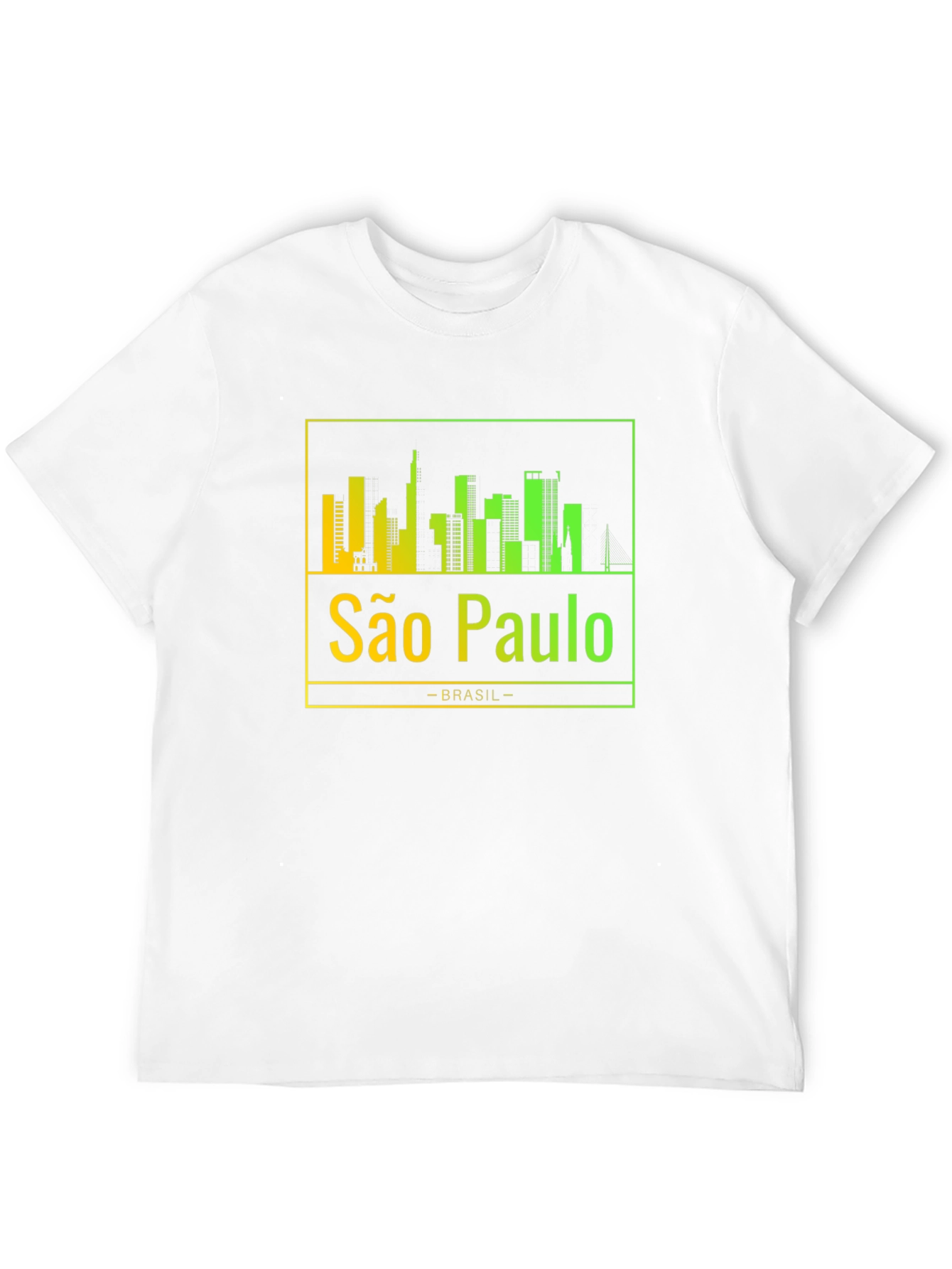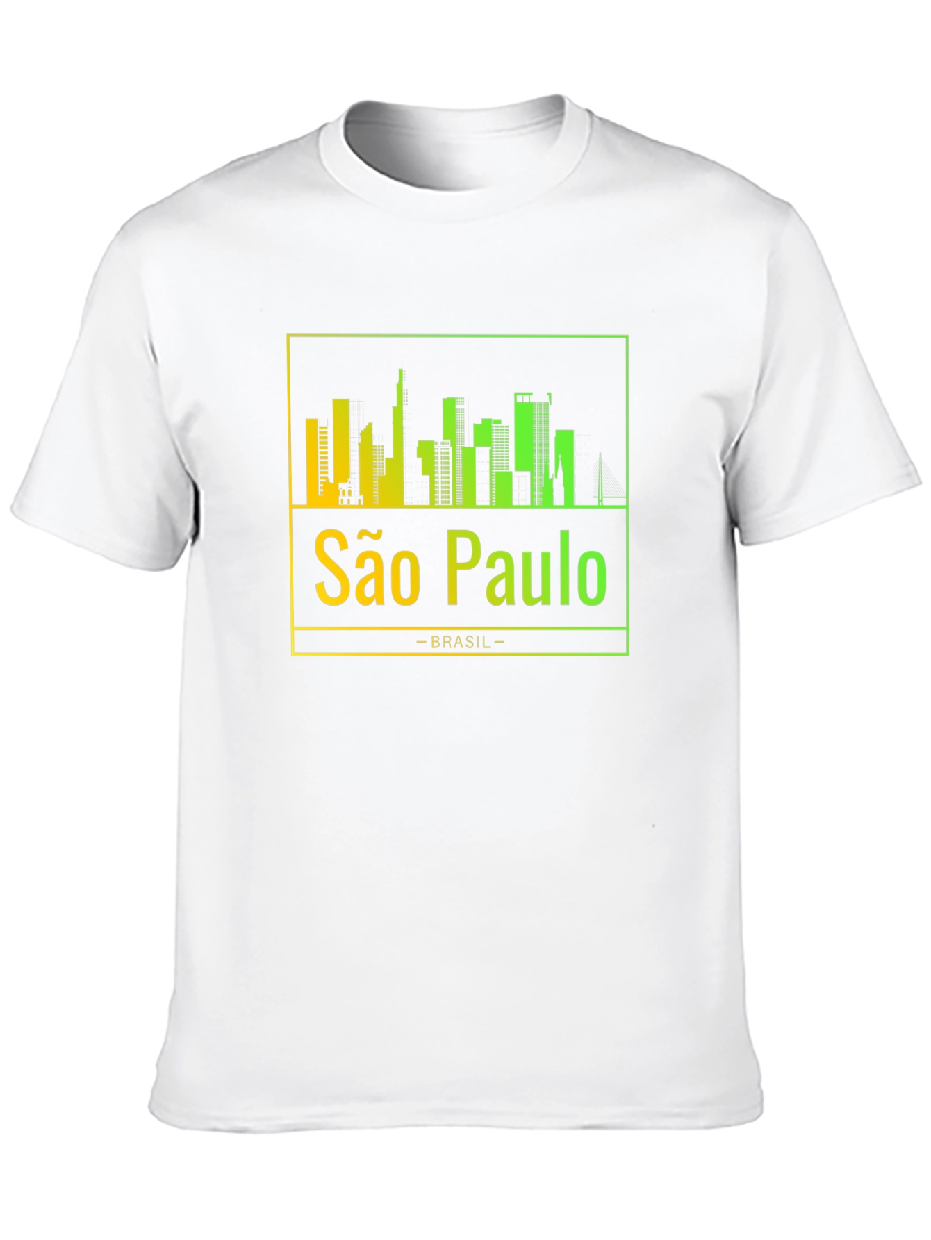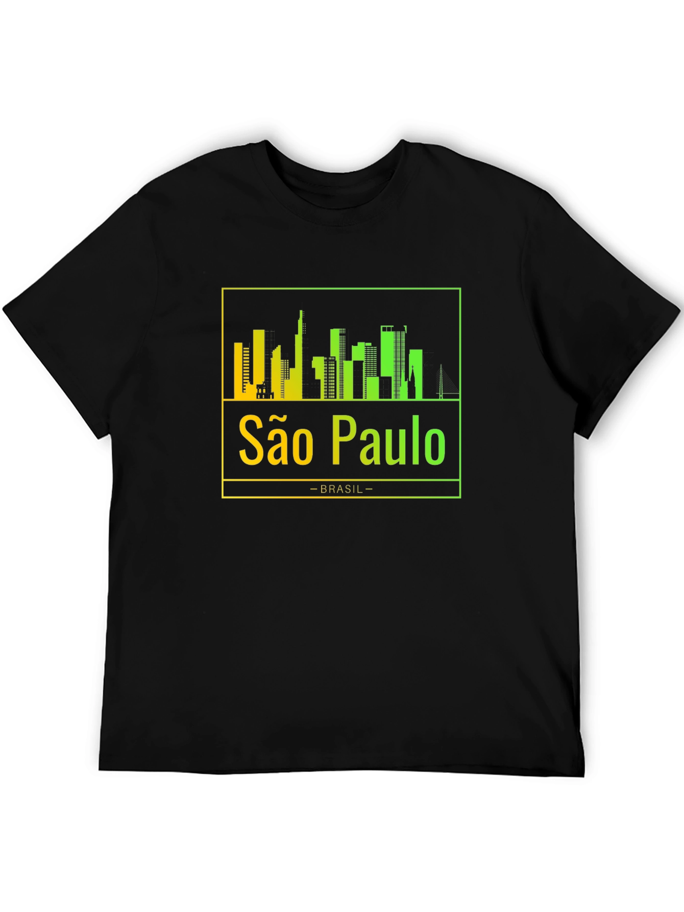 Show your love for São Paulo with this stylish black t-shirt. The shirt features a vibrant, gradient skyline design of the city, showcasing its iconic buildings. Below the skyline, "São Paulo" is printed in a matching gradient, followed by "-BRASIL-". The gradient transitions from yellow to green, adding a modern touch to the classic design. Made from a soft and comfortable material, this tee is perfect for everyday wear. Whether you're a local or just a fan, this São Paulo t-shirt is a great way to represent your favorite city. Ideal for casual outings, travel, or as a unique souvenir. Grab yours today and celebrate São Paulo!