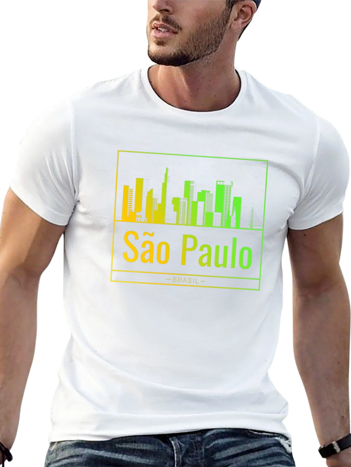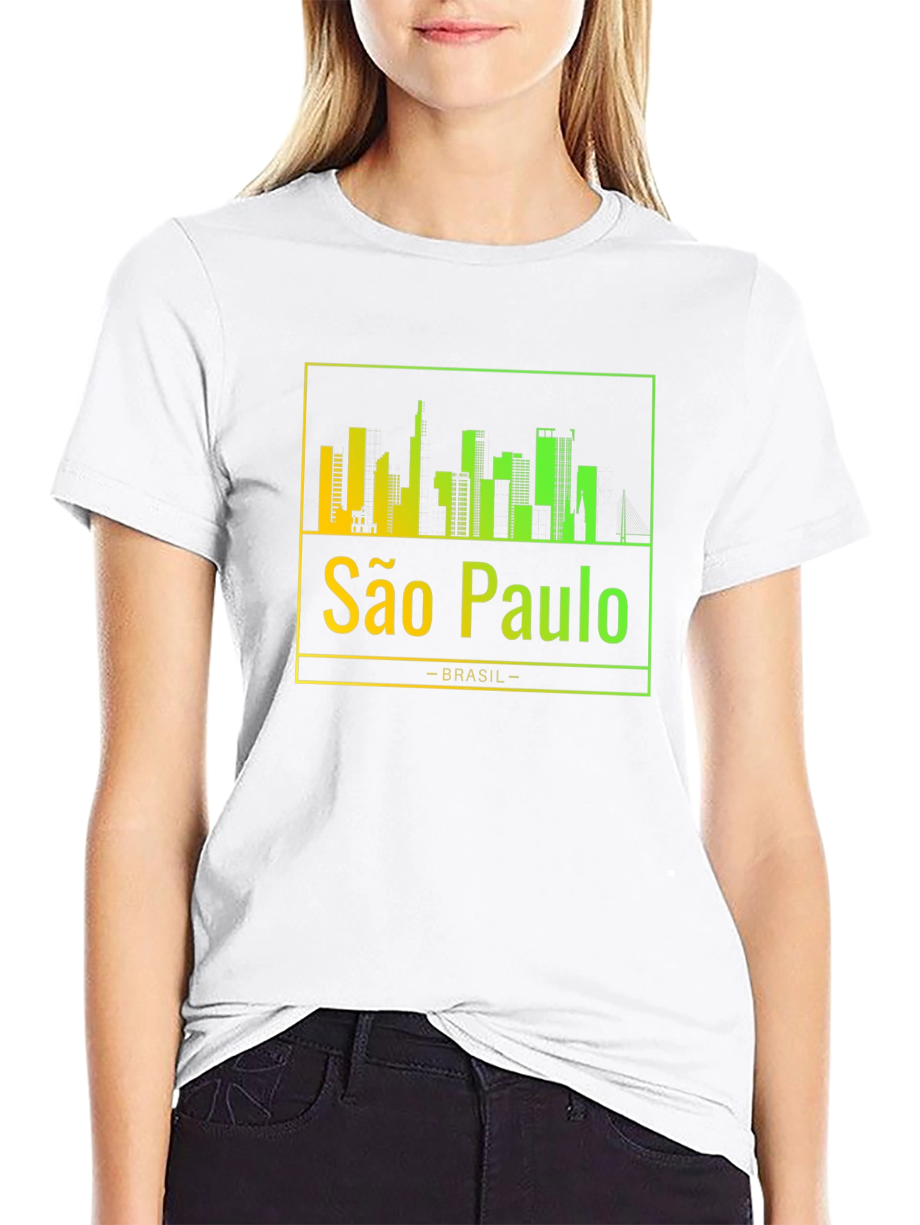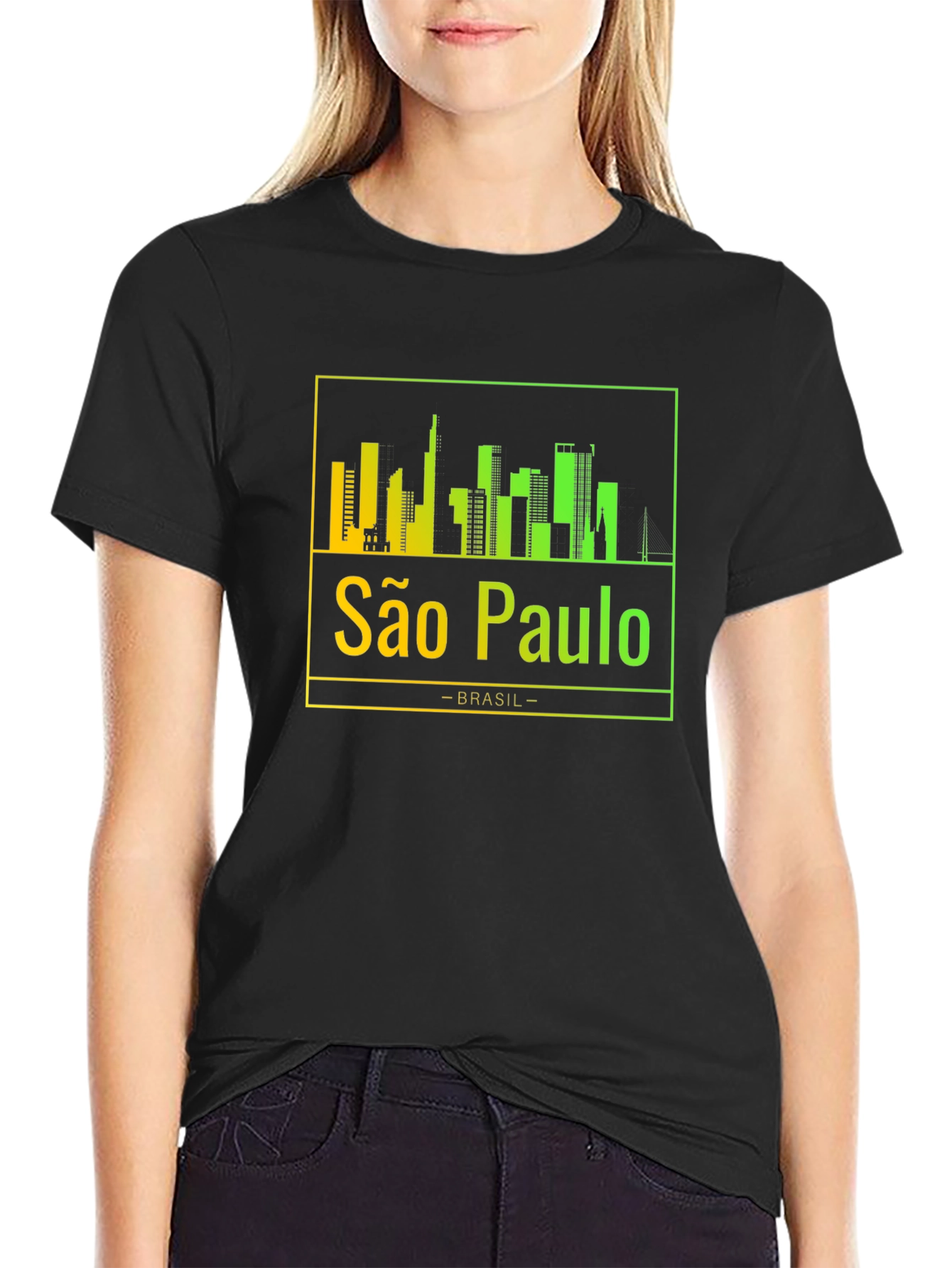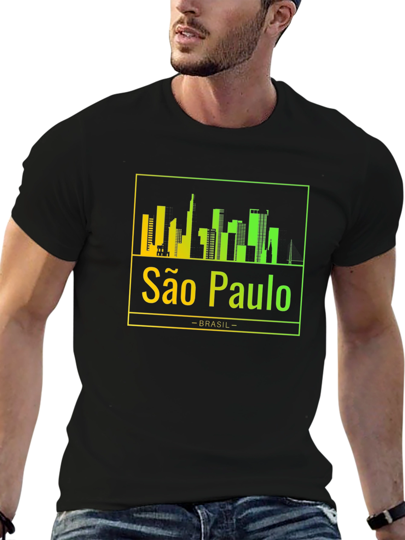 Show your love for São Paulo with this stylish black t-shirt. The shirt features a vibrant, gradient skyline design of the city, showcasing its iconic buildings. Below the skyline, "São Paulo" is printed in a matching gradient, followed by "-BRASIL-". The gradient transitions from yellow to green, adding a modern touch to the classic design. Made from a soft and comfortable material, this tee is perfect for everyday wear. Whether you're a local or just a fan, this São Paulo t-shirt is a great way to represent your favorite city. Ideal for casual outings, travel, or as a unique souvenir. Grab yours today and celebrate São Paulo!