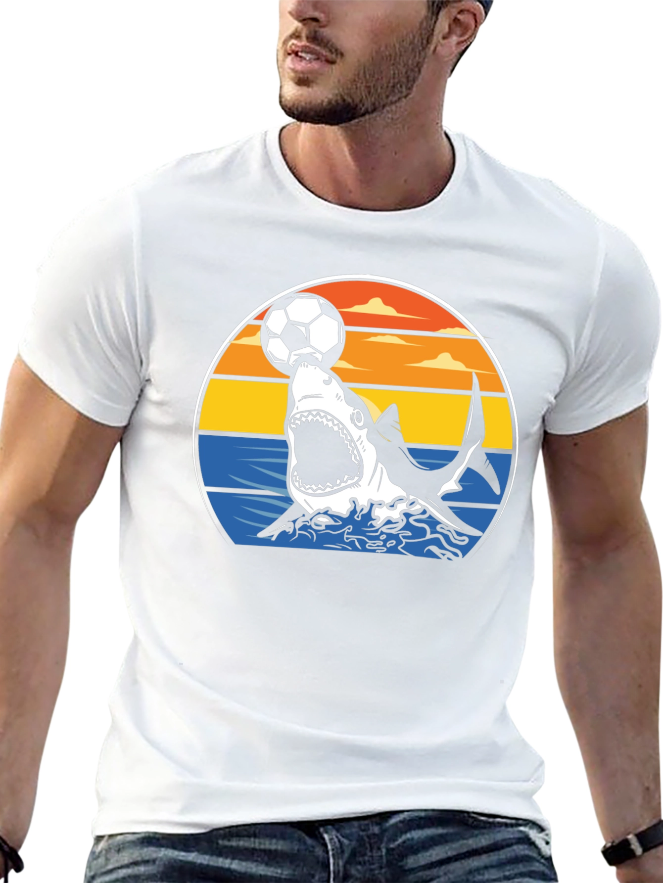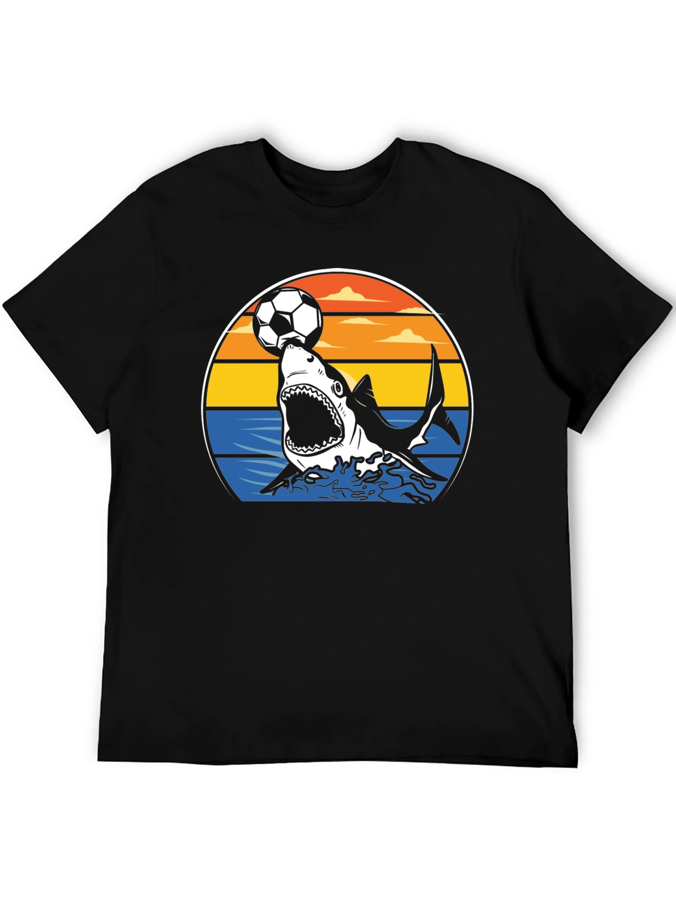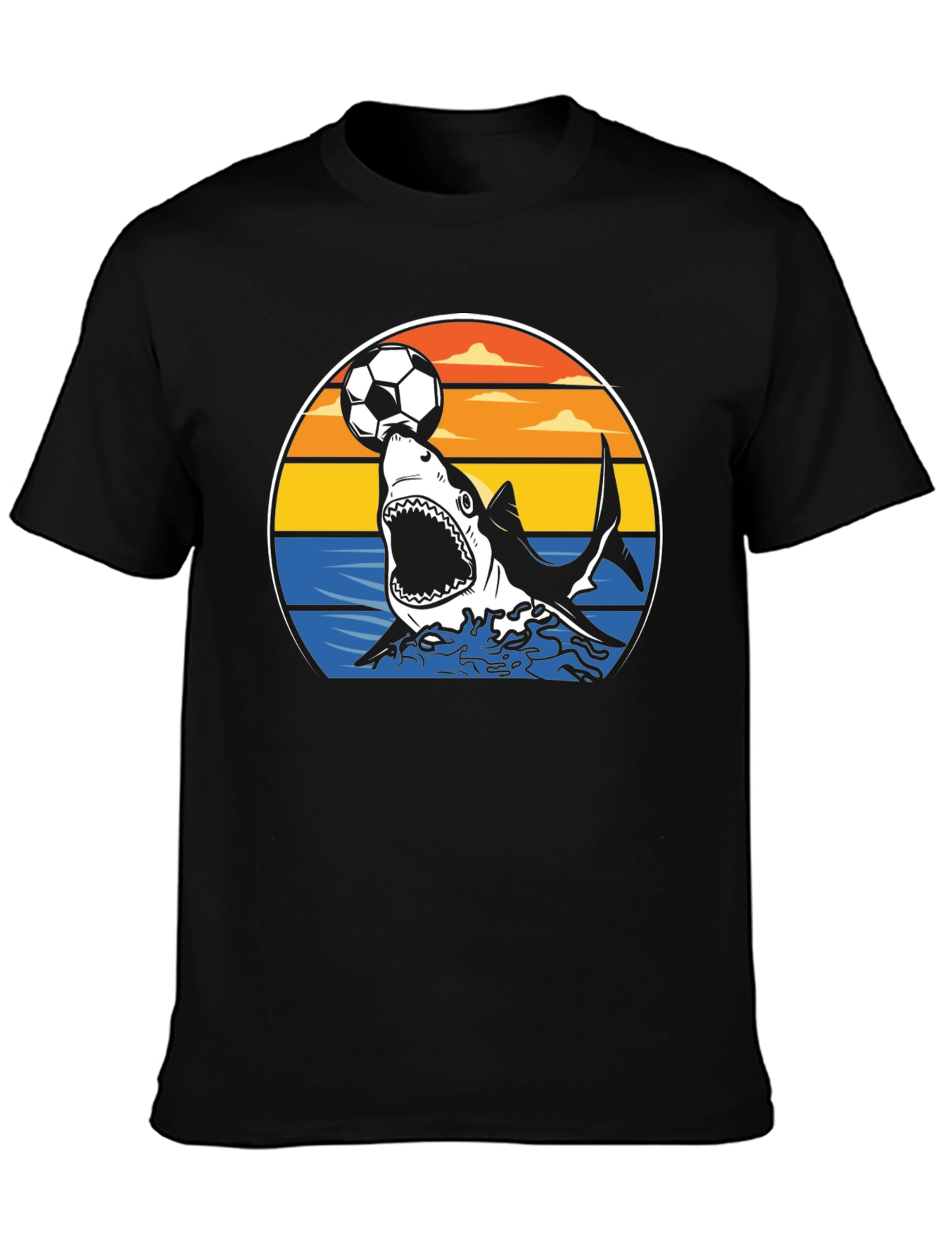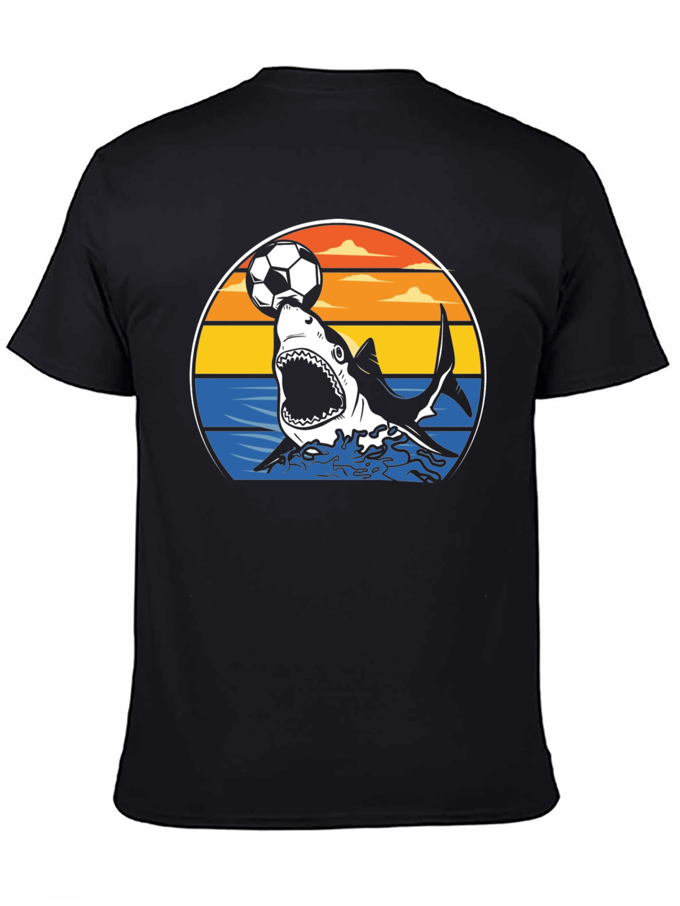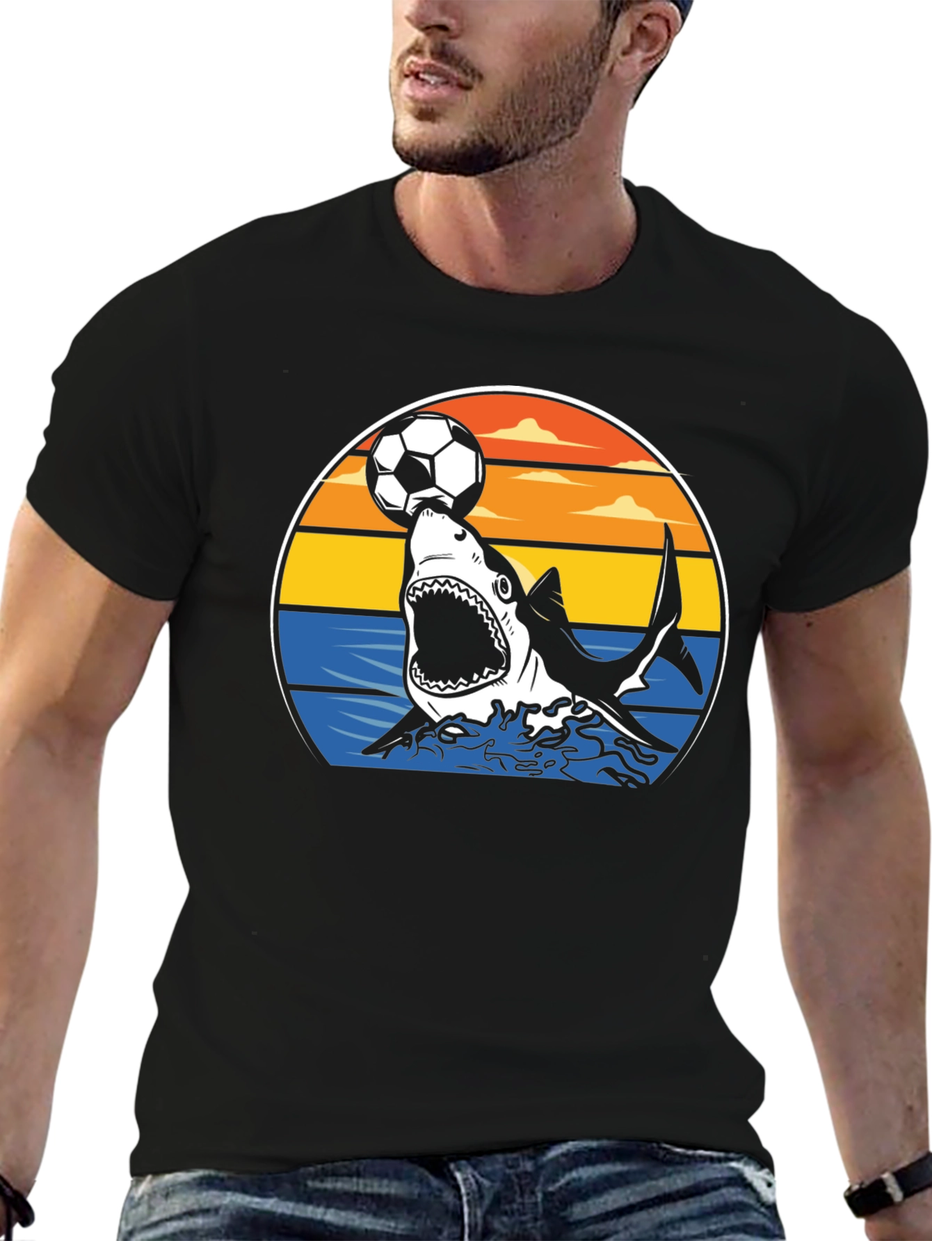 Dive into style with this unique black t-shirt featuring a striking design! A shark balances a soccer ball on its nose against a vibrant sunset backdrop. The playful graphic combines marine life with the thrill of soccer, making it perfect for sports enthusiasts and ocean lovers alike. Made from comfortable, breathable fabric, this tee is ideal for casual wear, sports practice, or a day out. Show off your unique style and love for the game with this eye-catching shark soccer t-shirt. A conversation starter and a must-have for your wardrobe!