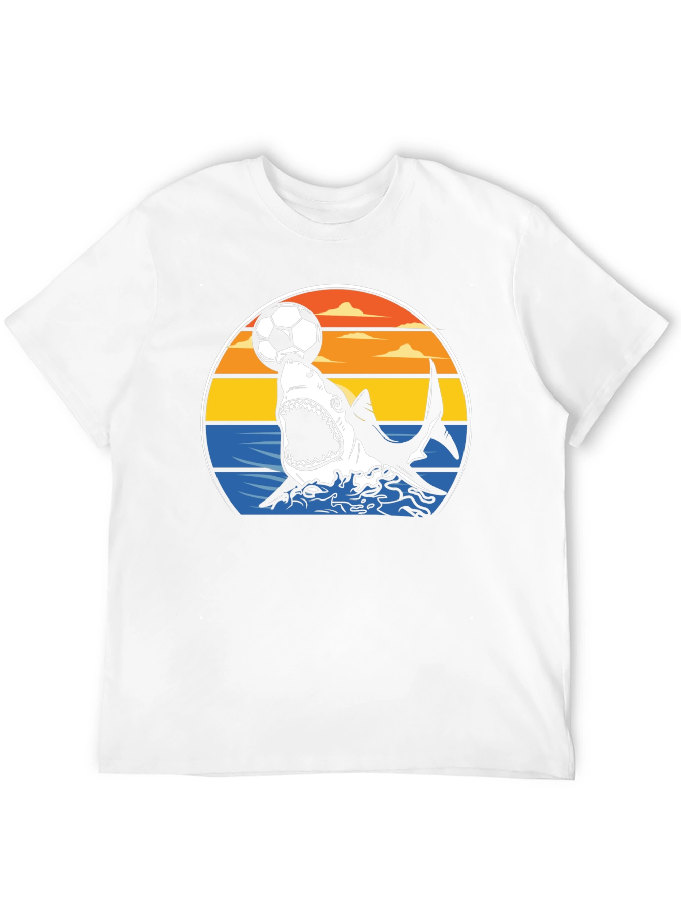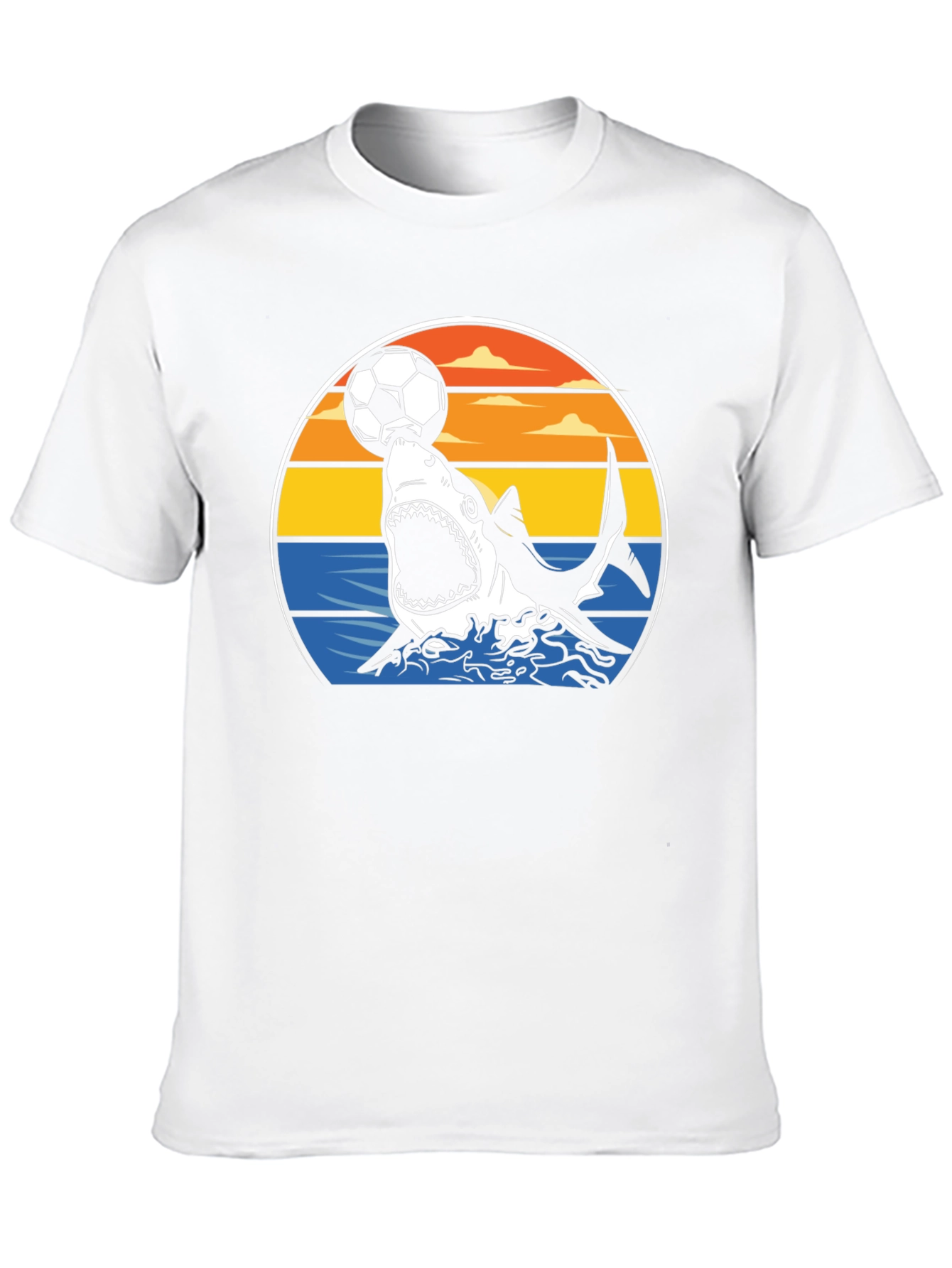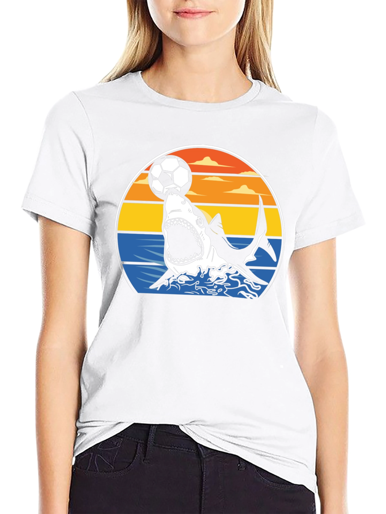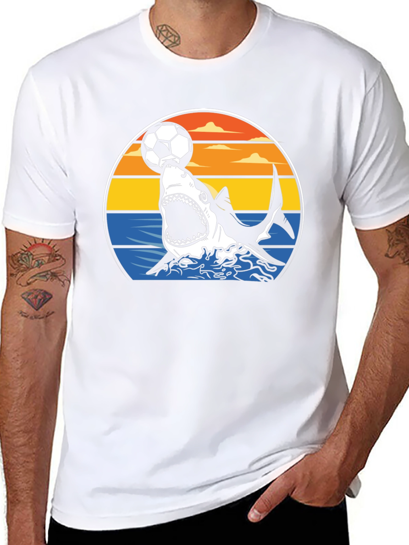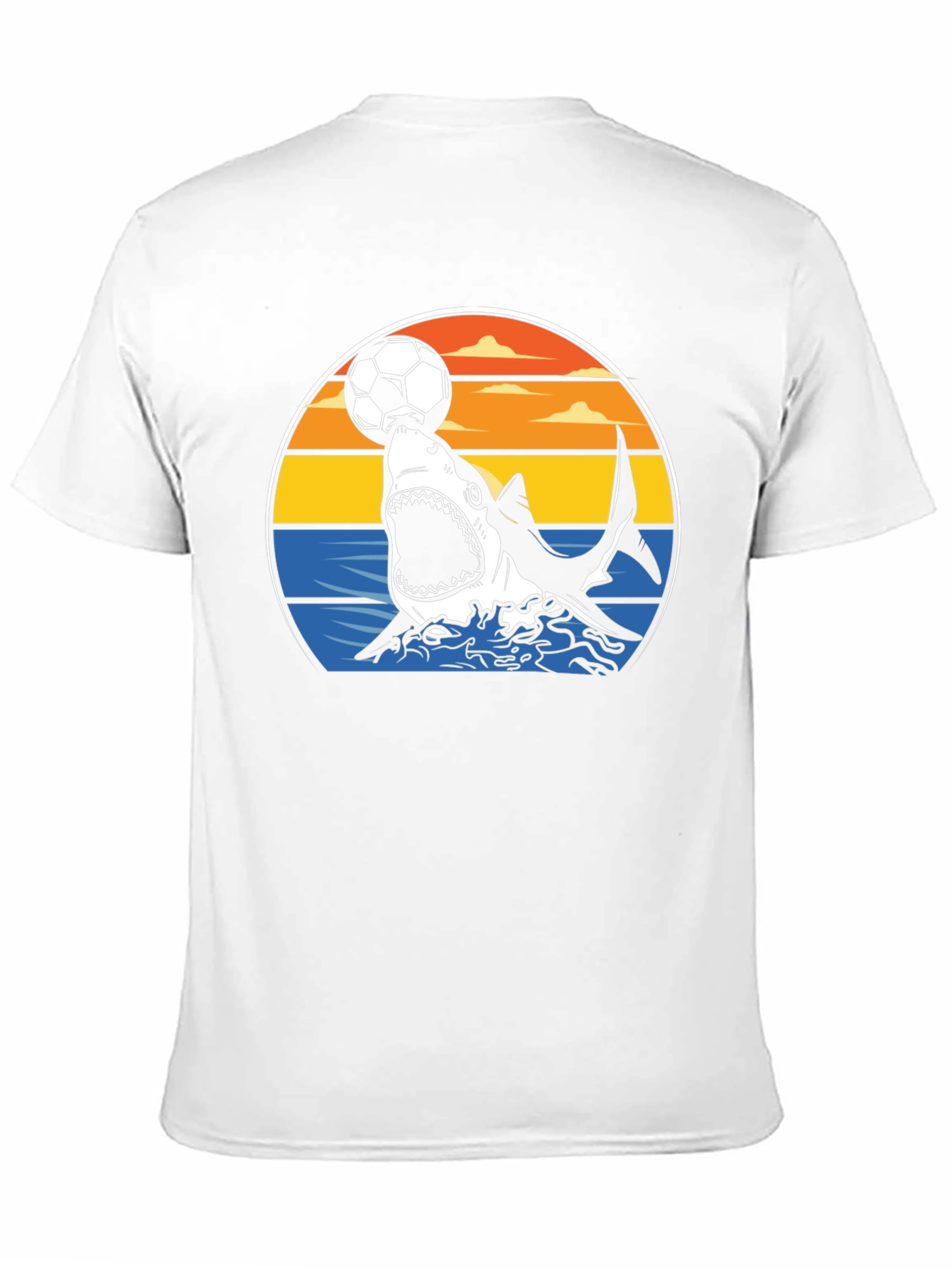 Dive into style with this unique black t-shirt featuring a striking design! A shark balances a soccer ball on its nose against a vibrant sunset backdrop. The playful graphic combines marine life with the thrill of soccer, making it perfect for sports enthusiasts and ocean lovers alike. Made from comfortable, breathable fabric, this tee is ideal for casual wear, sports practice, or a day out. Show off your unique style and love for the game with this eye-catching shark soccer t-shirt. A conversation starter and a must-have for your wardrobe!
