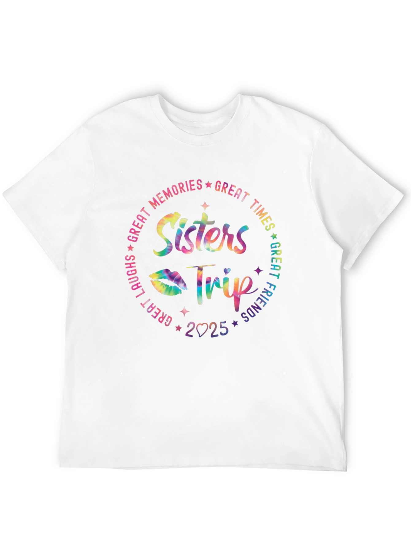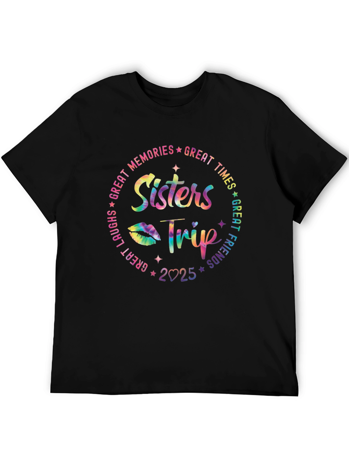 Celebrate sisterhood with this vibrant "Sisters Trip 2025" T-shirt. The design features a colorful, tie-dye inspired "Sisters Trip" text, surrounded by the words "Great Memories, Great Times, Great Friends, Great Laughs" in a circular pattern. A playful kiss mark adds a touch of fun. This tee is perfect for commemorating a special trip with your sisters or as a thoughtful gift. Made from comfortable material, it's ideal for casual wear, vacations, and making lasting memories together. Show off your sisterly bond in style!
