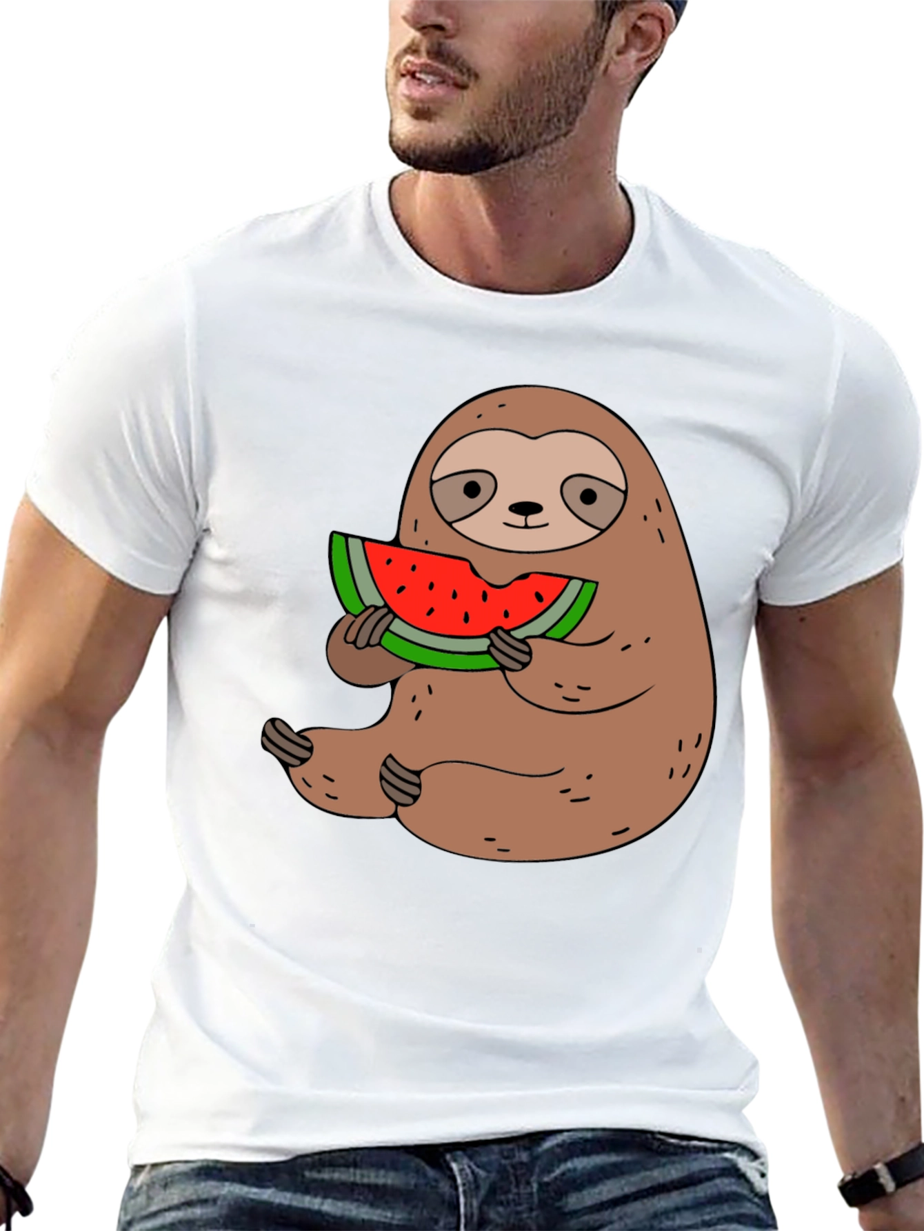 This stylish black t-shirt features a charming graphic of a sloth happily enjoying a slice of watermelon. The design is printed on a comfortable, breathable fabric, perfect for everyday wear. The sloth is rendered in cute cartoon style, making it a fun and playful addition to any wardrobe. The vibrant colors of the watermelon pop against the dark background of the shirt, ensuring the design stands out. Ideal for casual outings, lounging at home, or as a unique gift for sloth lovers. The classic fit and soft material make this tee a comfortable and trendy choice.