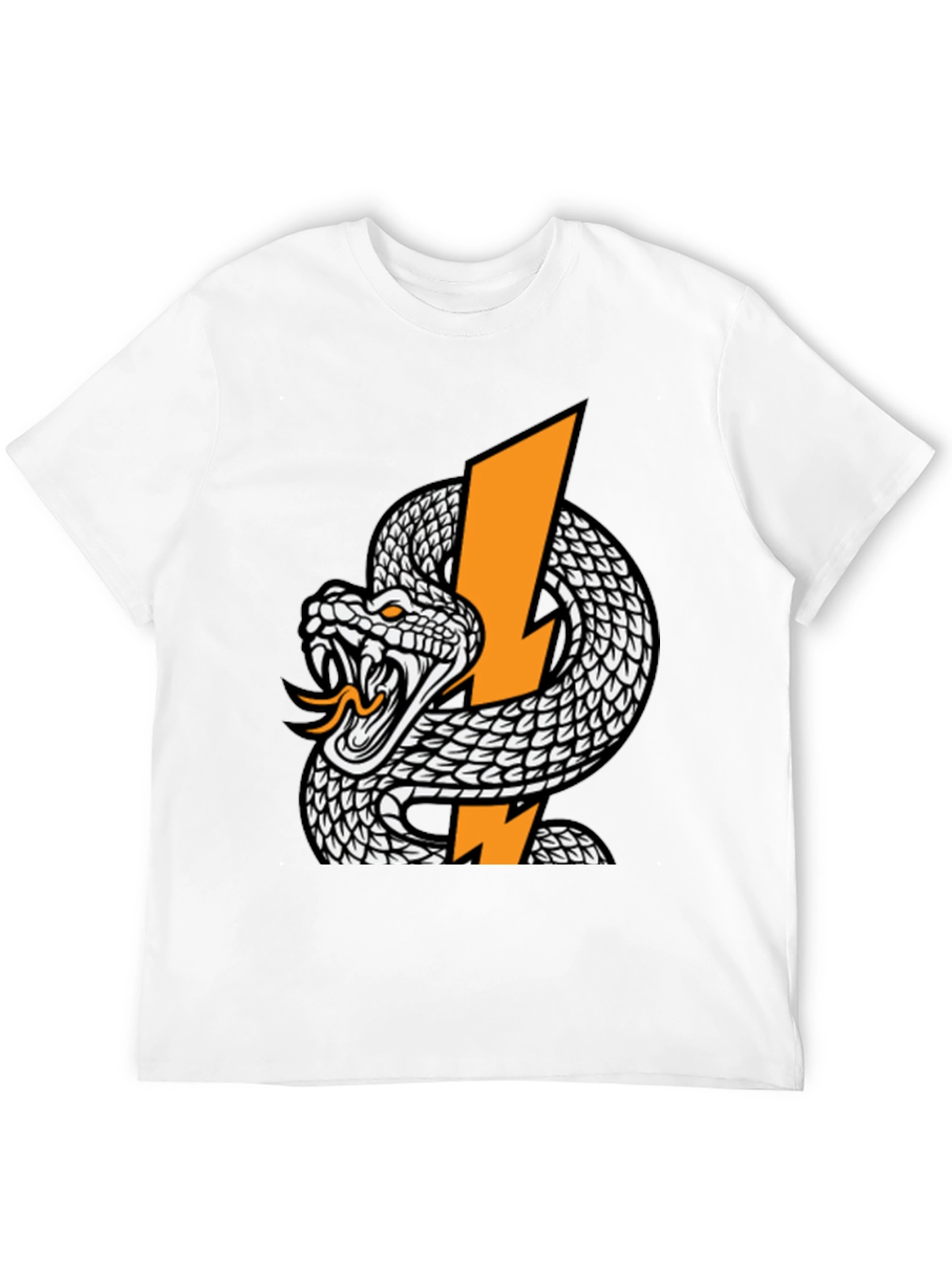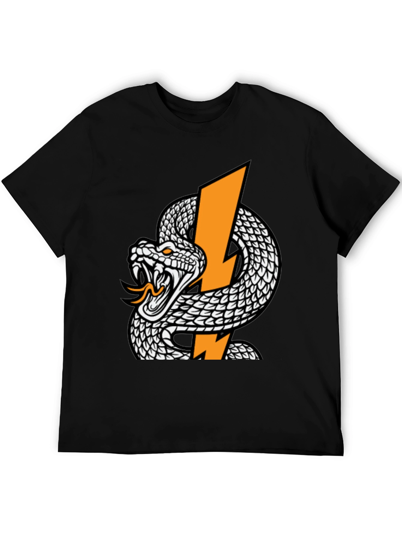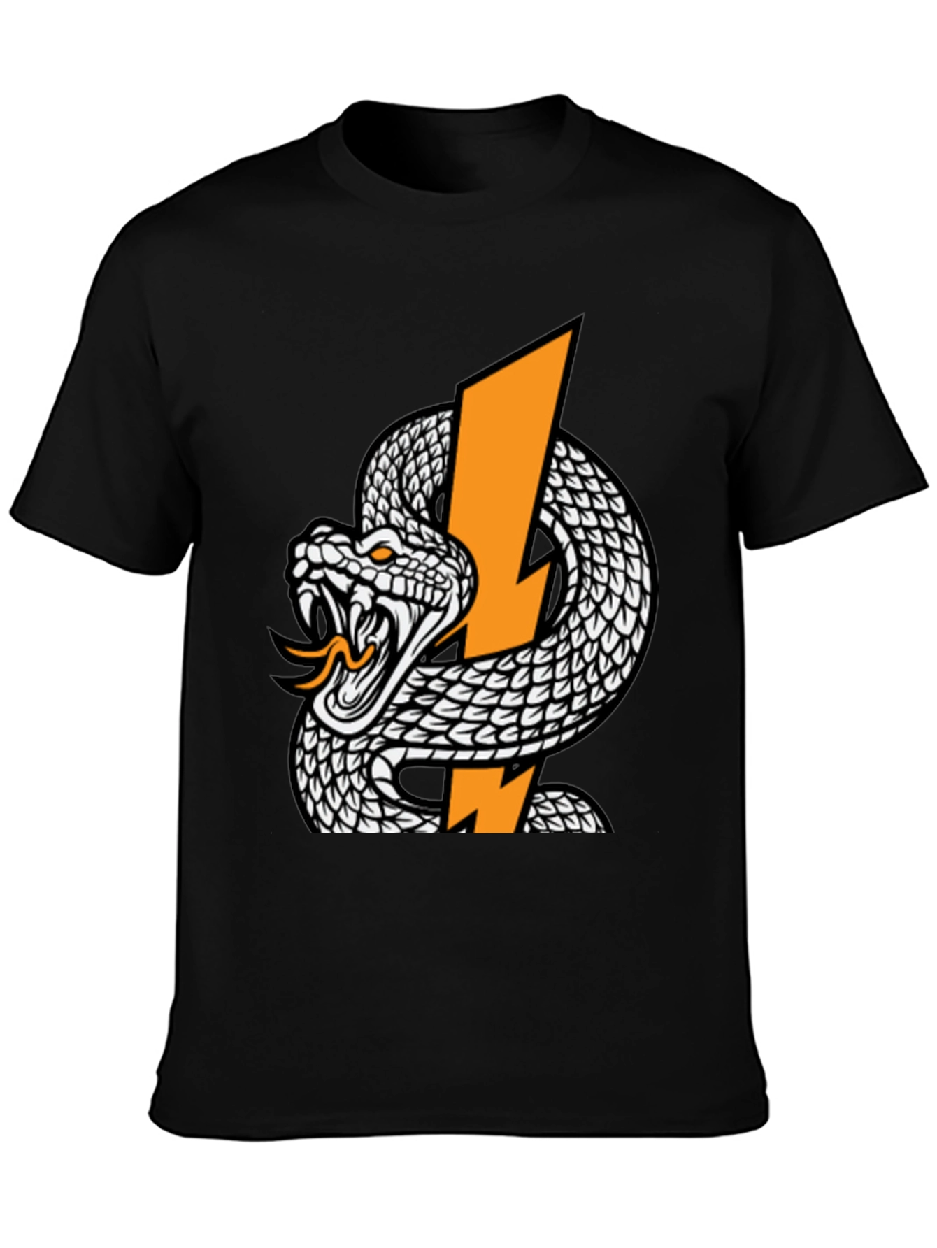 Strike with style in this eye-catching black t-shirt featuring a striking graphic of a coiled snake intertwined with a bold orange lightning bolt. The detailed design showcases the snake's menacing fangs and piercing orange eyes. Made from a comfortable-looking fabric, this tee is perfect for casual wear, concerts, or expressing your edgy side. Stand out from the crowd and unleash your inner rebel with this statement piece. This tee is a unique addition to any wardrobe.