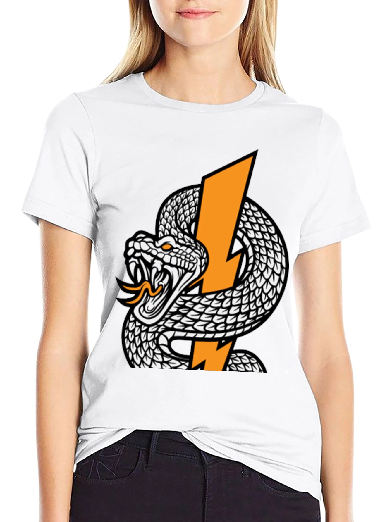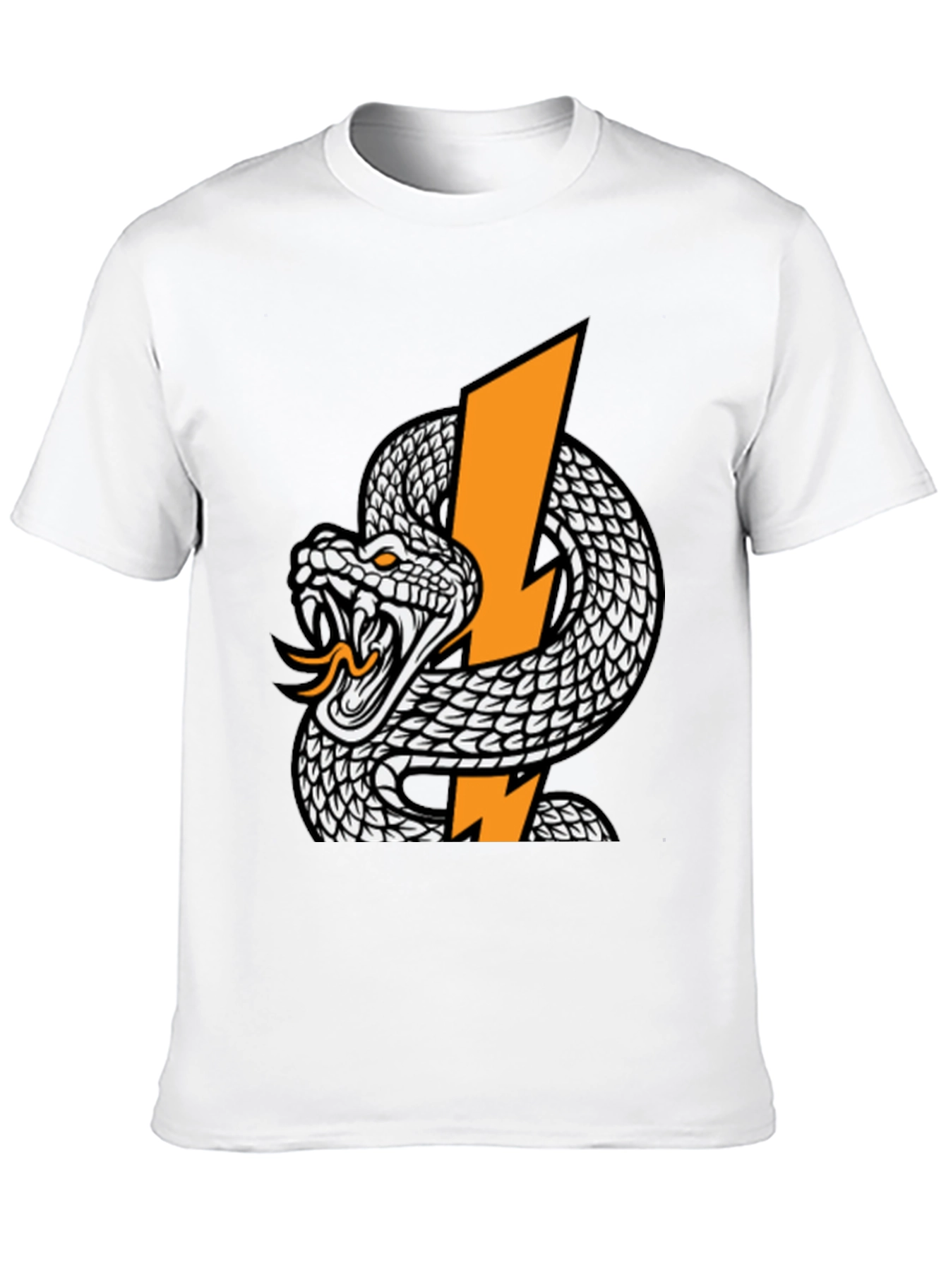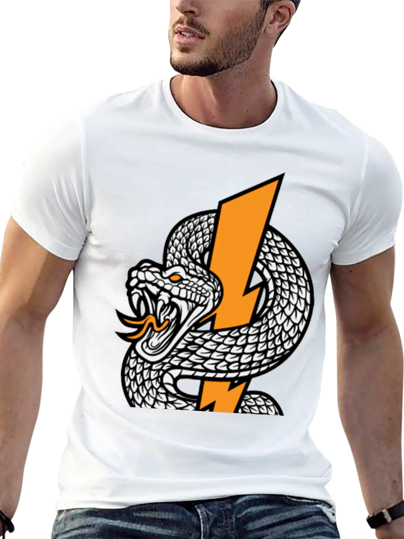 Strike with style in this eye-catching black t-shirt featuring a striking graphic of a coiled snake intertwined with a bold orange lightning bolt. The detailed design showcases the snake's menacing fangs and piercing orange eyes. Made from a comfortable-looking fabric, this tee is perfect for casual wear, concerts, or expressing your edgy side. Stand out from the crowd and unleash your inner rebel with this statement piece. This tee is a unique addition to any wardrobe.