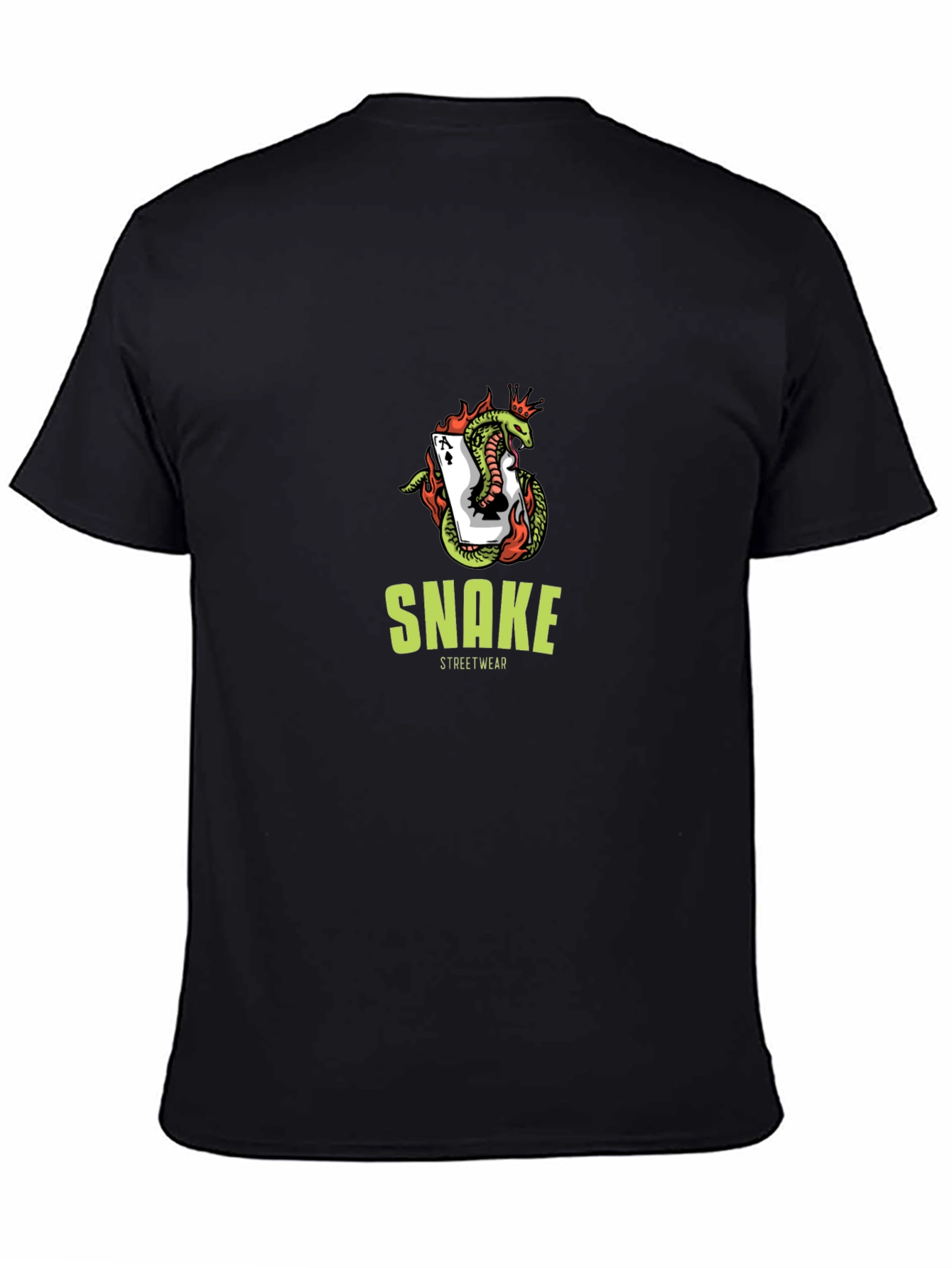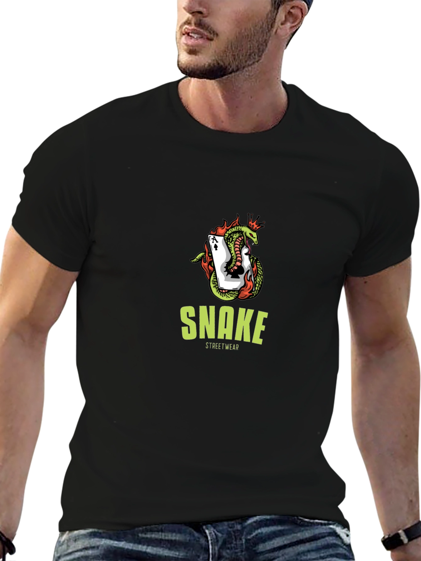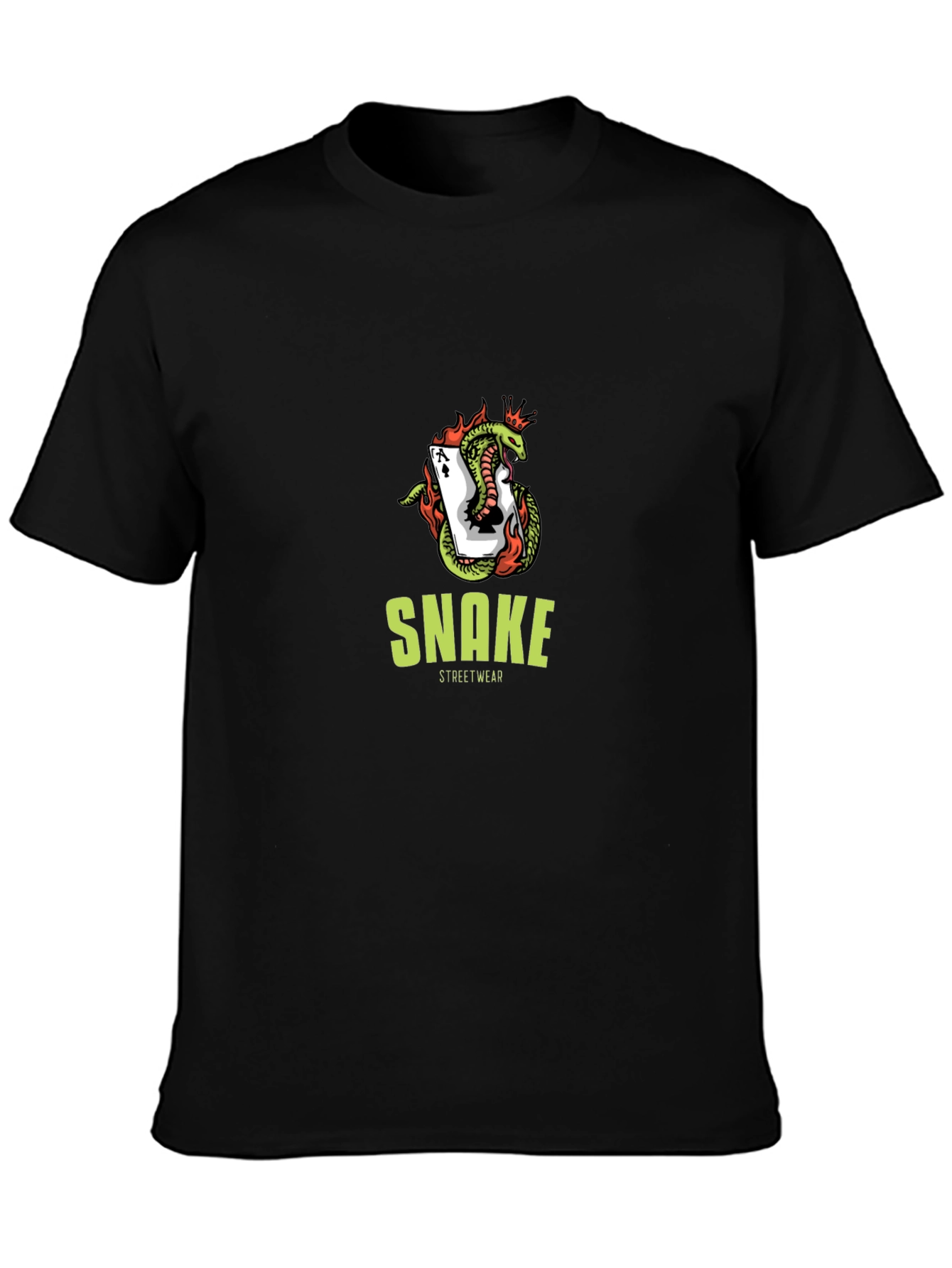 Rock this edgy black graphic tee featuring a striking snake design. The vibrant green snake, adorned with a crown, coils around a playing card engulfed in flames. The bold 'SNAKE STREETWEAR' text adds to the urban aesthetic. Made from a comfortable fabric, this tee offers a relaxed fit, perfect for everyday wear. Showcase your unique style by pairing it with jeans, shorts, or joggers. Ideal for casual outings, concerts, or making a statement wherever you go. This tee is a must-have for those who love unique streetwear with a touch of rebellion.