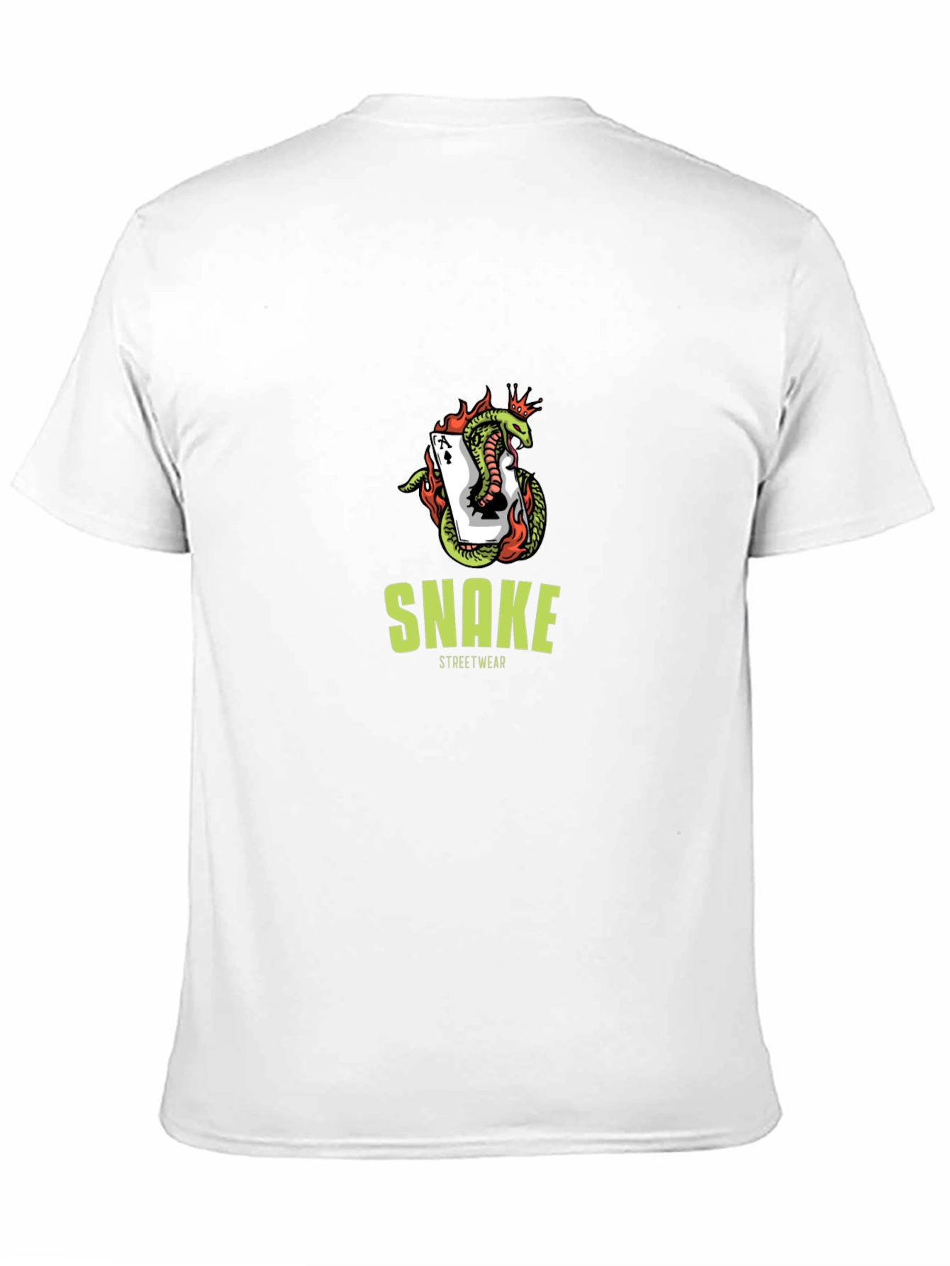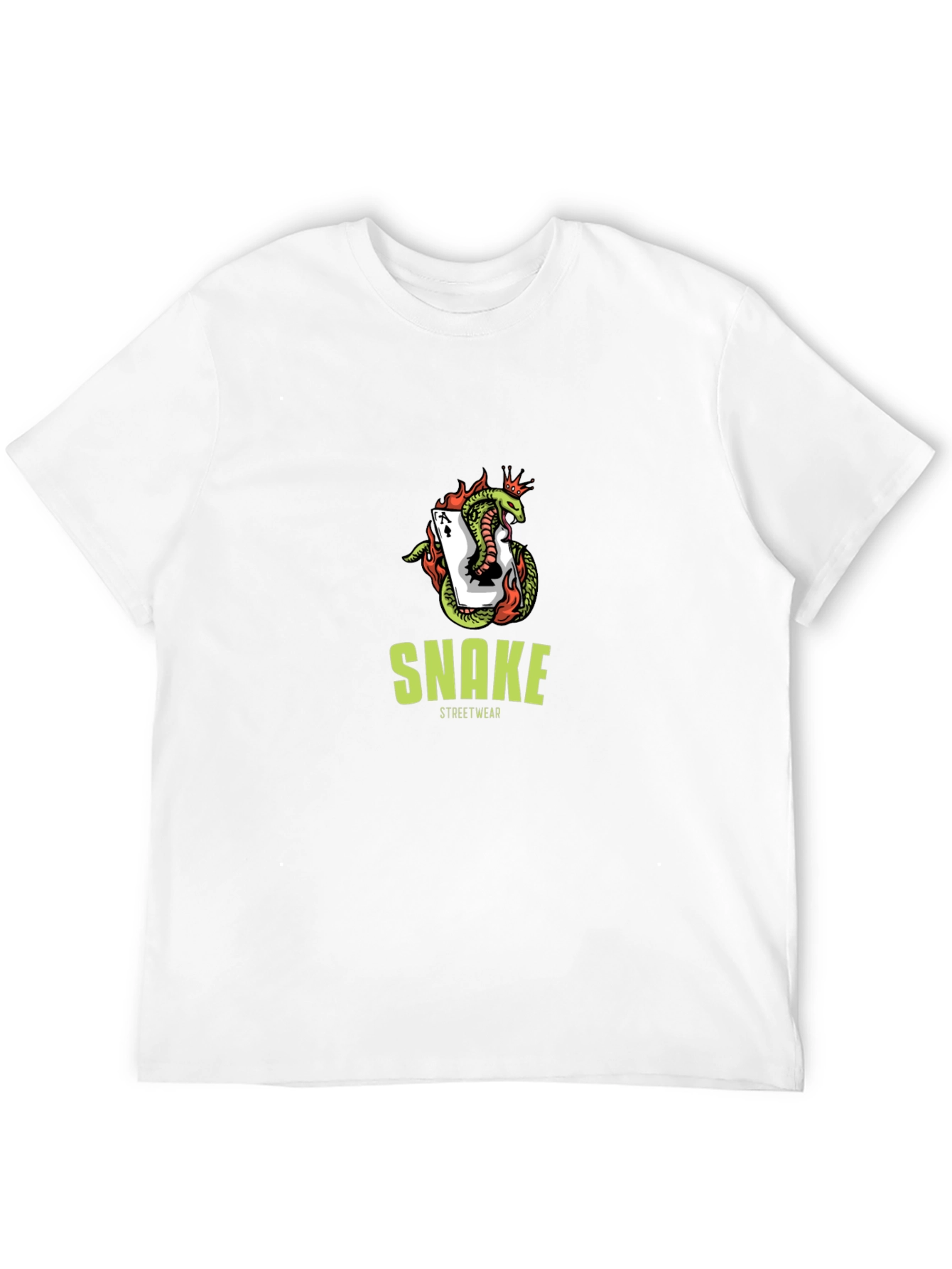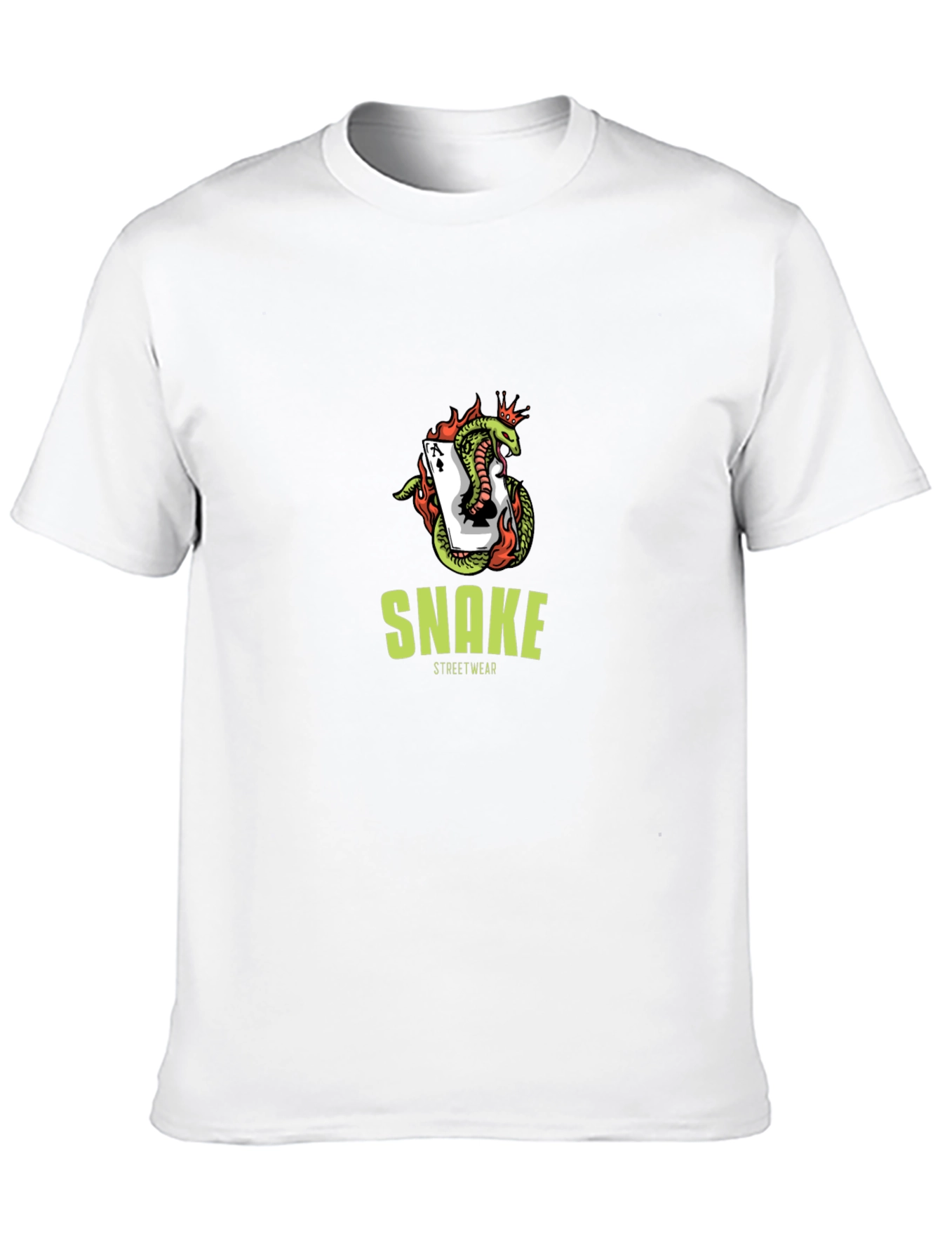 Rock this edgy black graphic tee featuring a striking snake design. The vibrant green snake, adorned with a crown, coils around a playing card engulfed in flames. The bold 'SNAKE STREETWEAR' text adds to the urban aesthetic. Made from a comfortable fabric, this tee offers a relaxed fit, perfect for everyday wear. Showcase your unique style by pairing it with jeans, shorts, or joggers. Ideal for casual outings, concerts, or making a statement wherever you go. This tee is a must-have for those who love unique streetwear with a touch of rebellion.