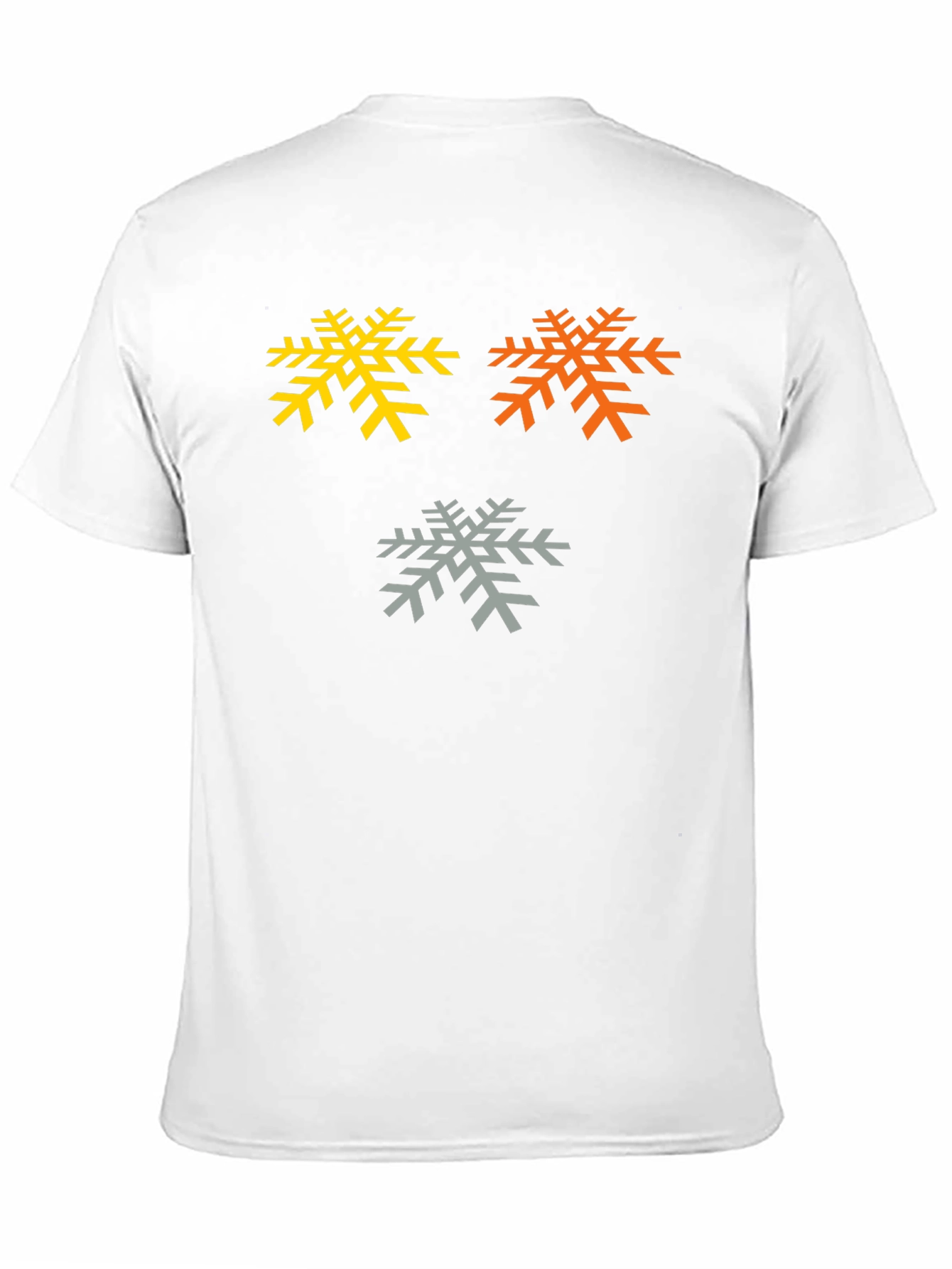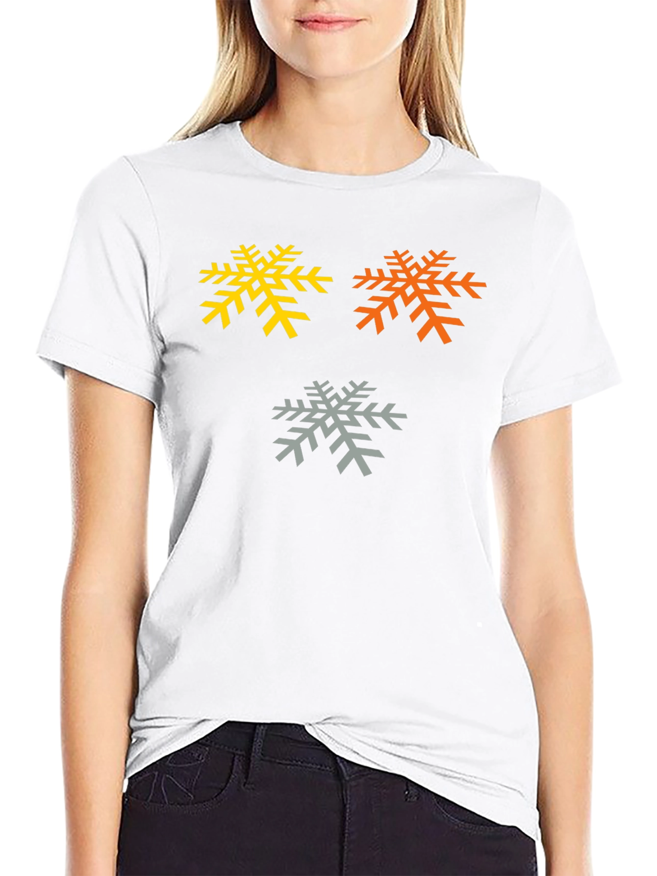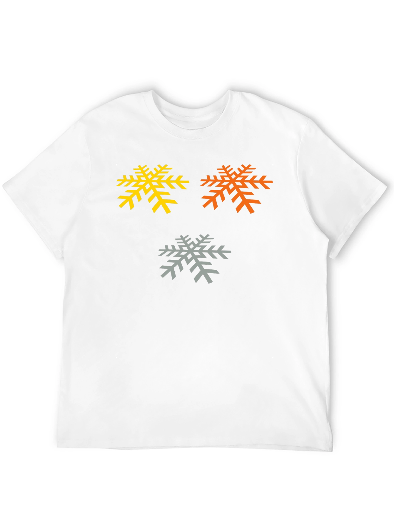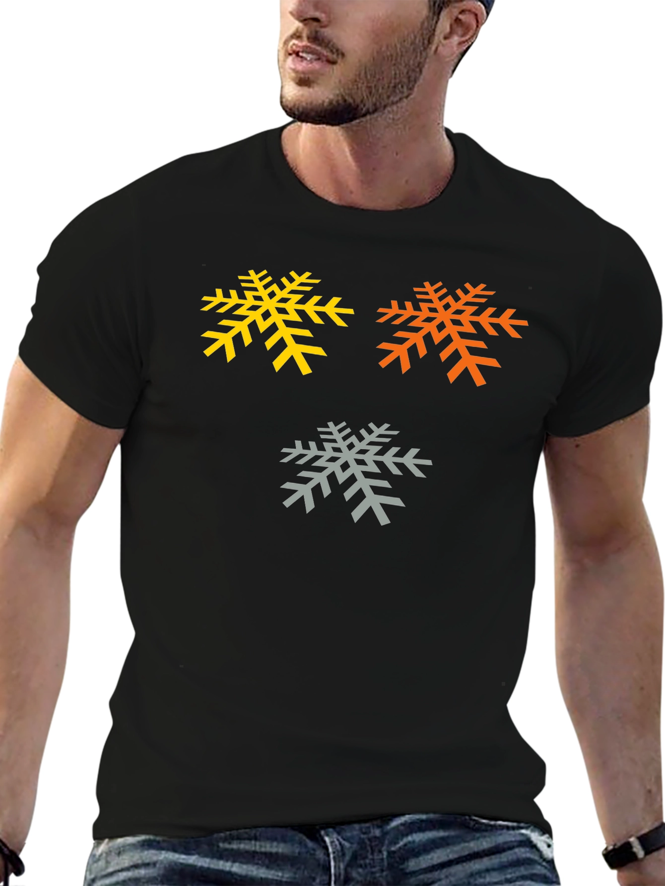 Stay cool with this trendy black tee! Crafted from a soft cotton blend, this shirt features a unique snowflake graphic design in three different colors - yellow, orange and silver. The design adds a touch of wintry charm to any outfit. Perfect for casual wear, the shirt is comfortable and stylish. Pair it with jeans or shorts for a relaxed look. This graphic tee is sure to be a conversation starter and a great addition to your wardrobe. The classic black color makes it easy to match with other items in your wardrobe for versatile styling options.