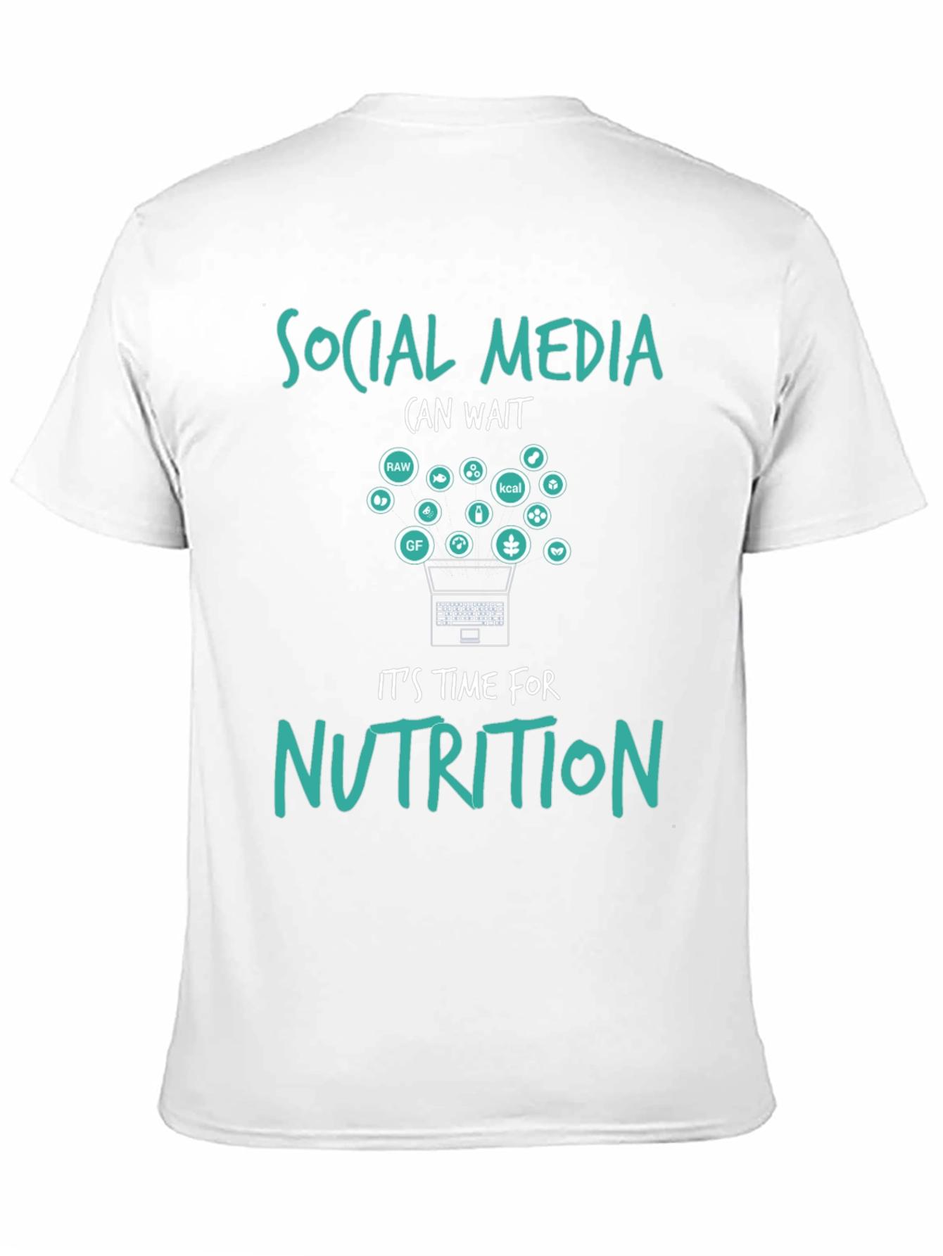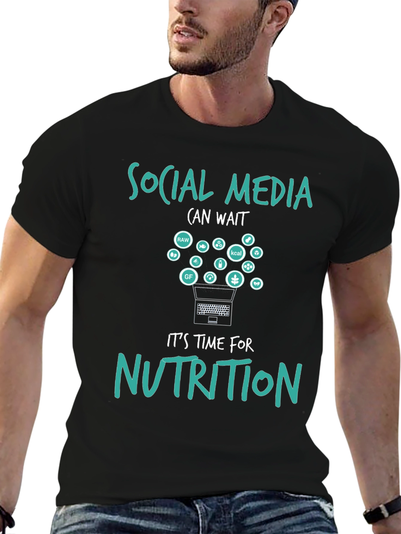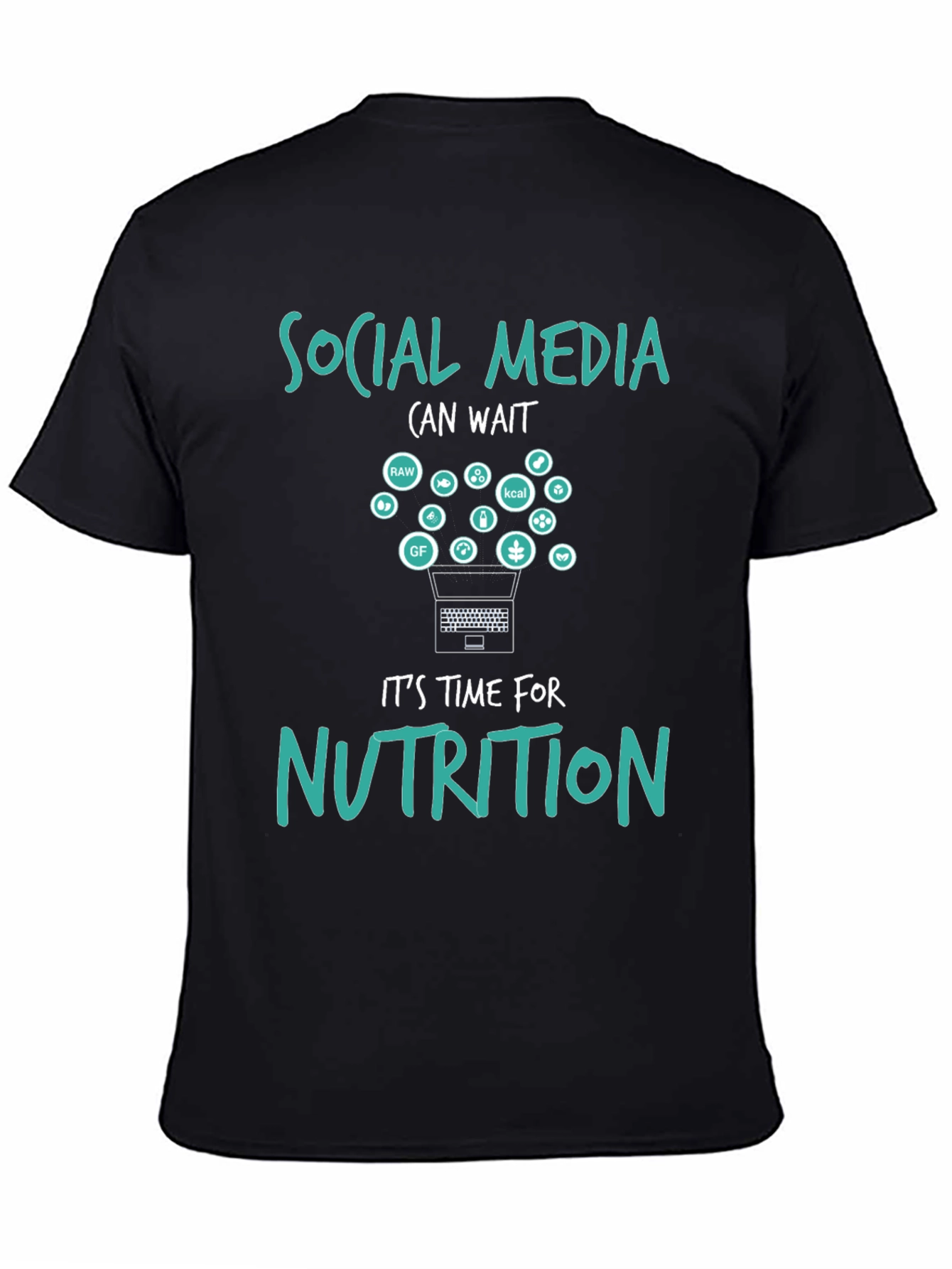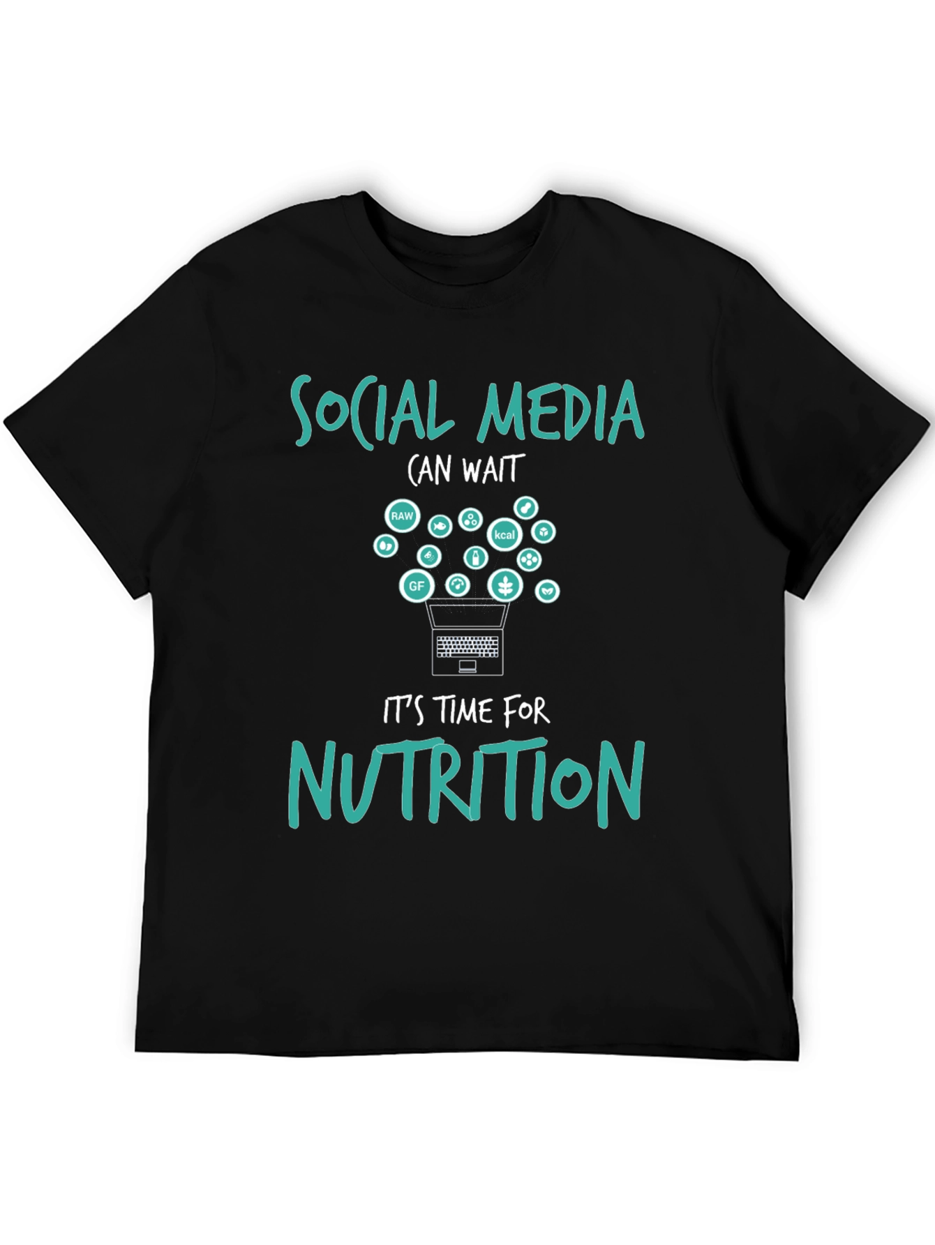 Embrace mindful eating with this unique black t-shirt, featuring a playful design that reads "Social Media (can wait) It's time for NUTRITION." A laptop graphic launches healthy food icons, promoting balanced living. Ideal for health enthusiasts, dieticians, or anyone seeking to disconnect and nourish their body. Wear it to the gym, nutrition workshops, or casual outings to spark conversations about wellness. Made with quality fabric, this tee offers both style and comfort.