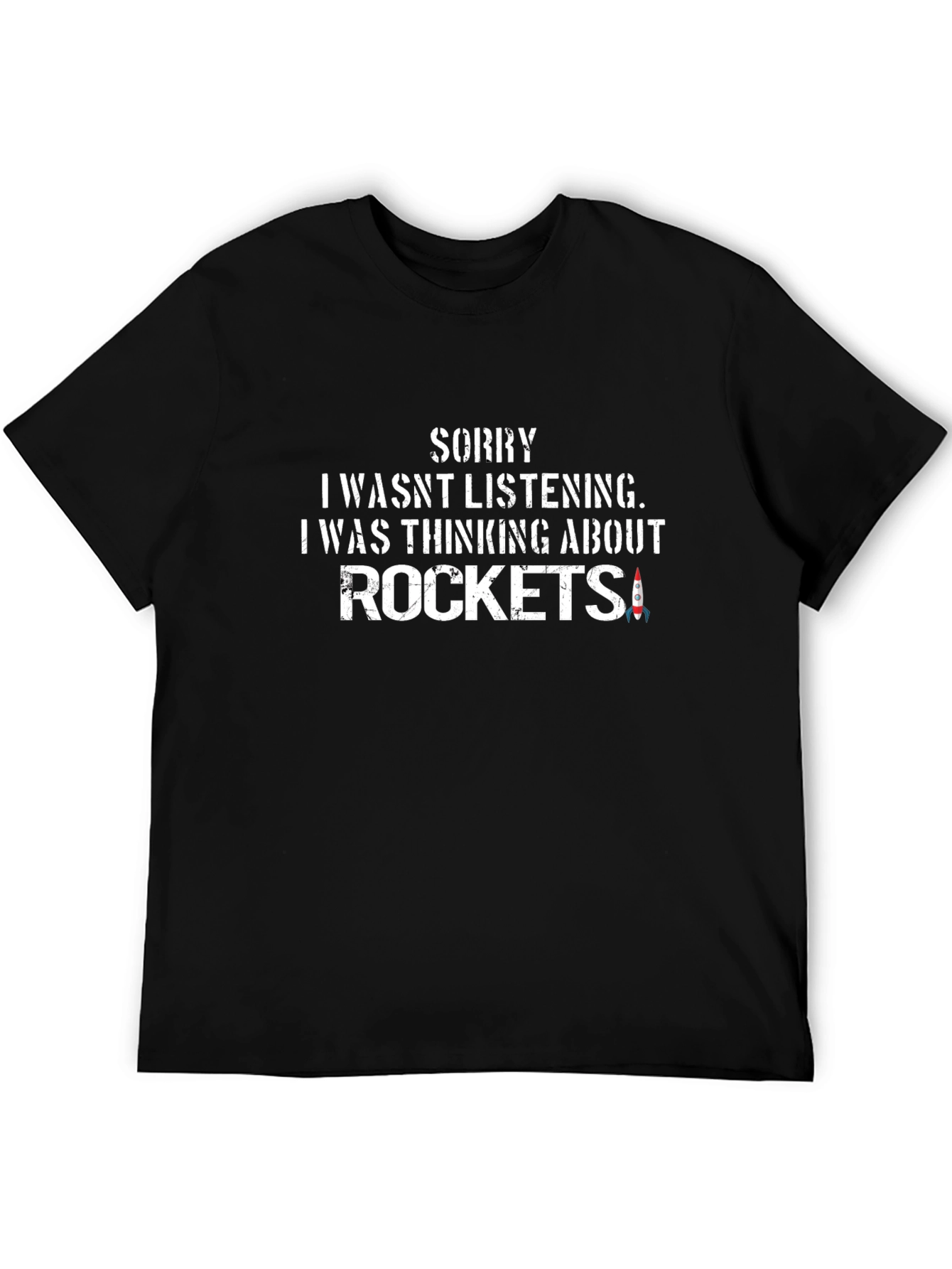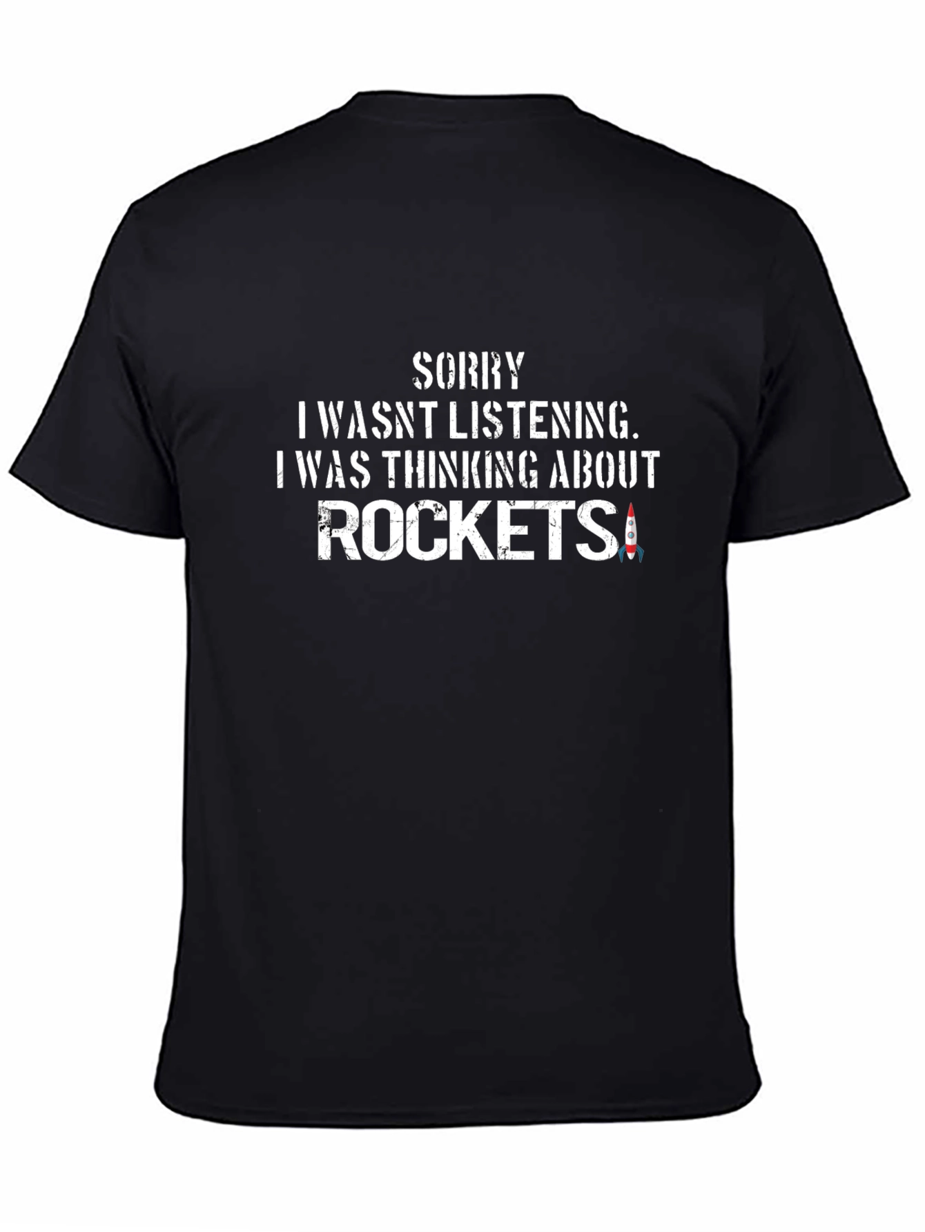Express your passion for space with this eye-catching black T-shirt! Featuring a playful white graphic that reads "Sorry, I wasn't listening. I was thinking about ROCKETS!", it's perfect for anyone who loves rockets. The design includes a small rocket illustration adding to its unique charm. Crafted from a comfortable material, this tee is ideal for casual wear, space enthusiasts, or anyone with a love for rockets and a quirky sense of humor. Makes a great gift for birthdays, holidays, or just because! Grab yours today and let your love for rockets shine!
