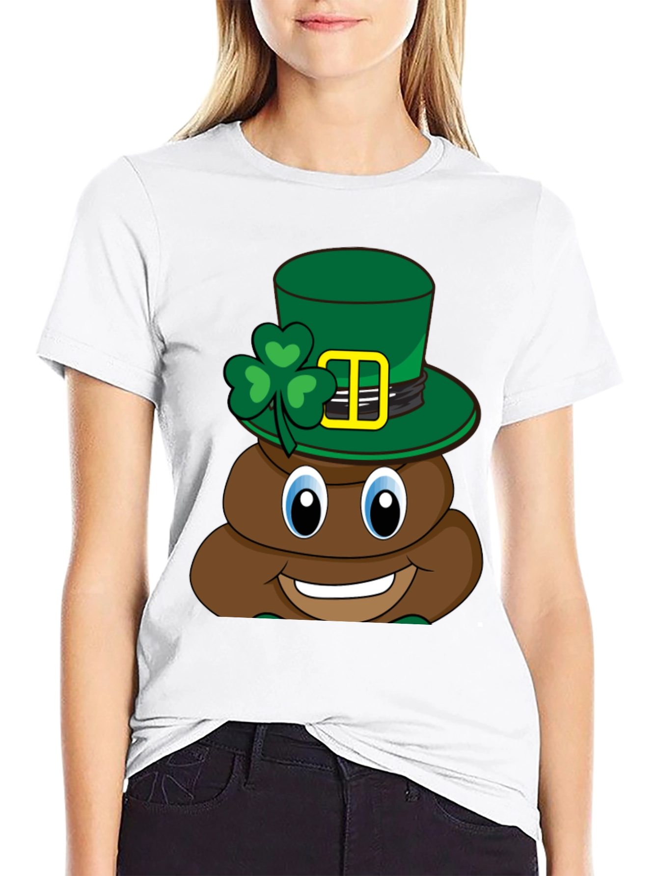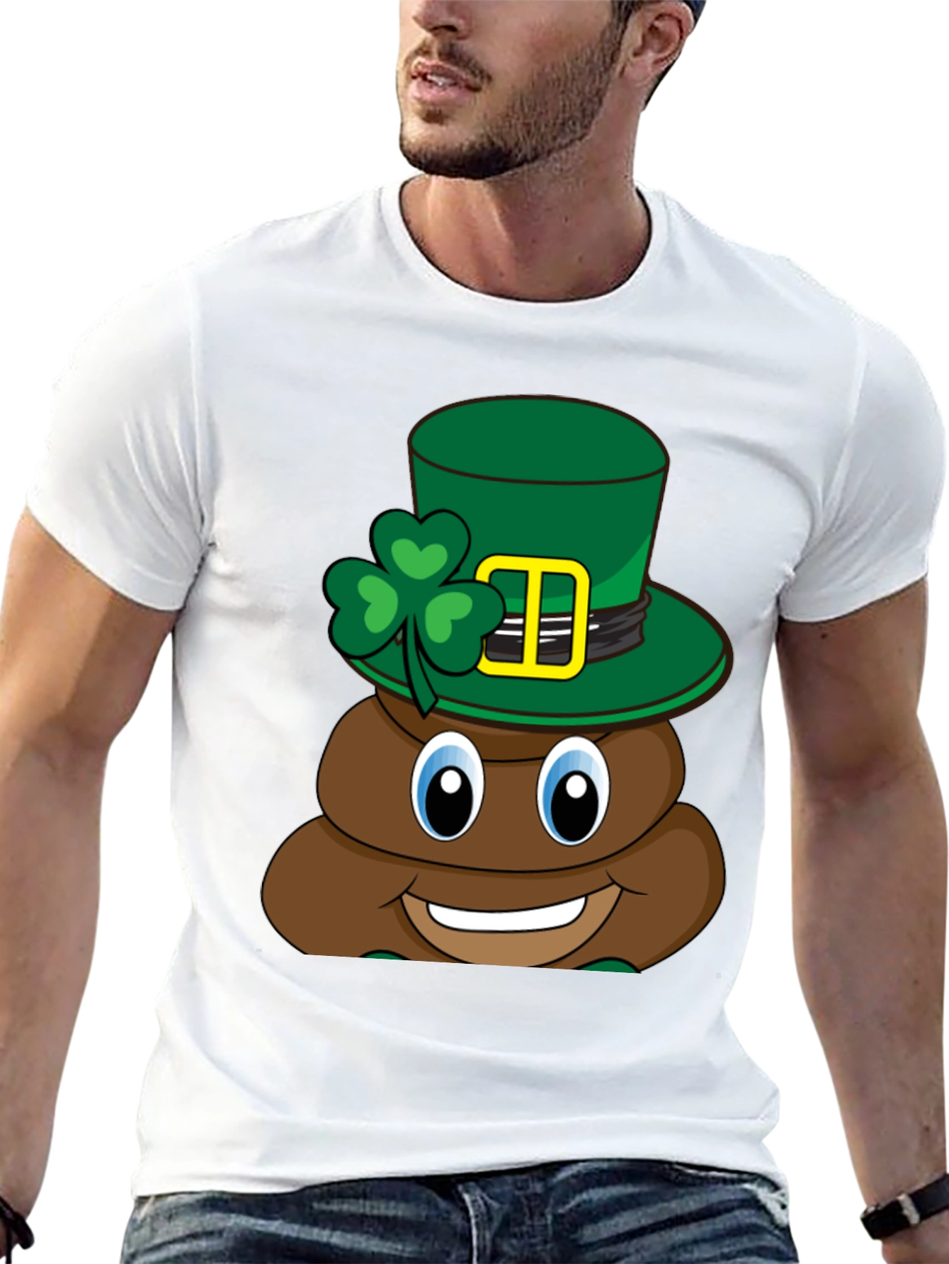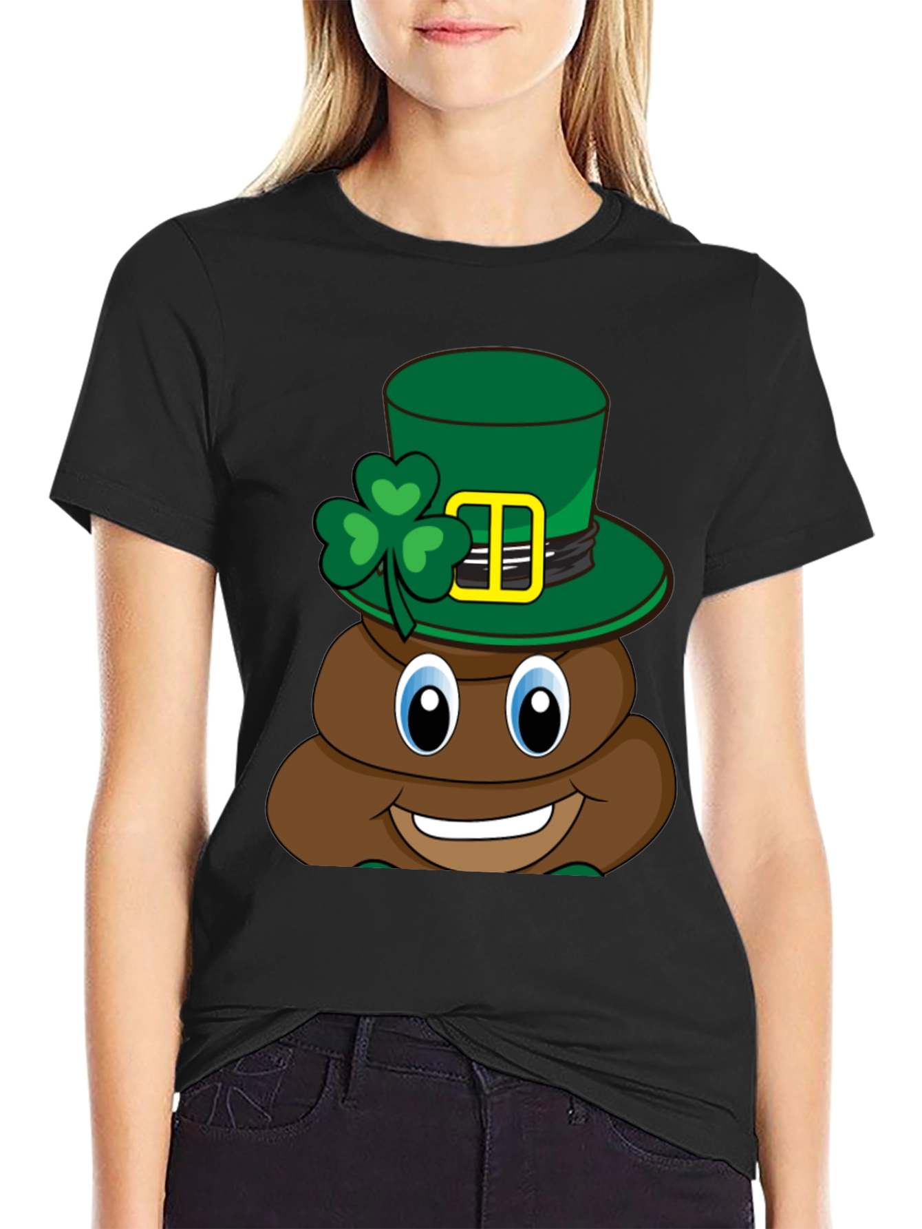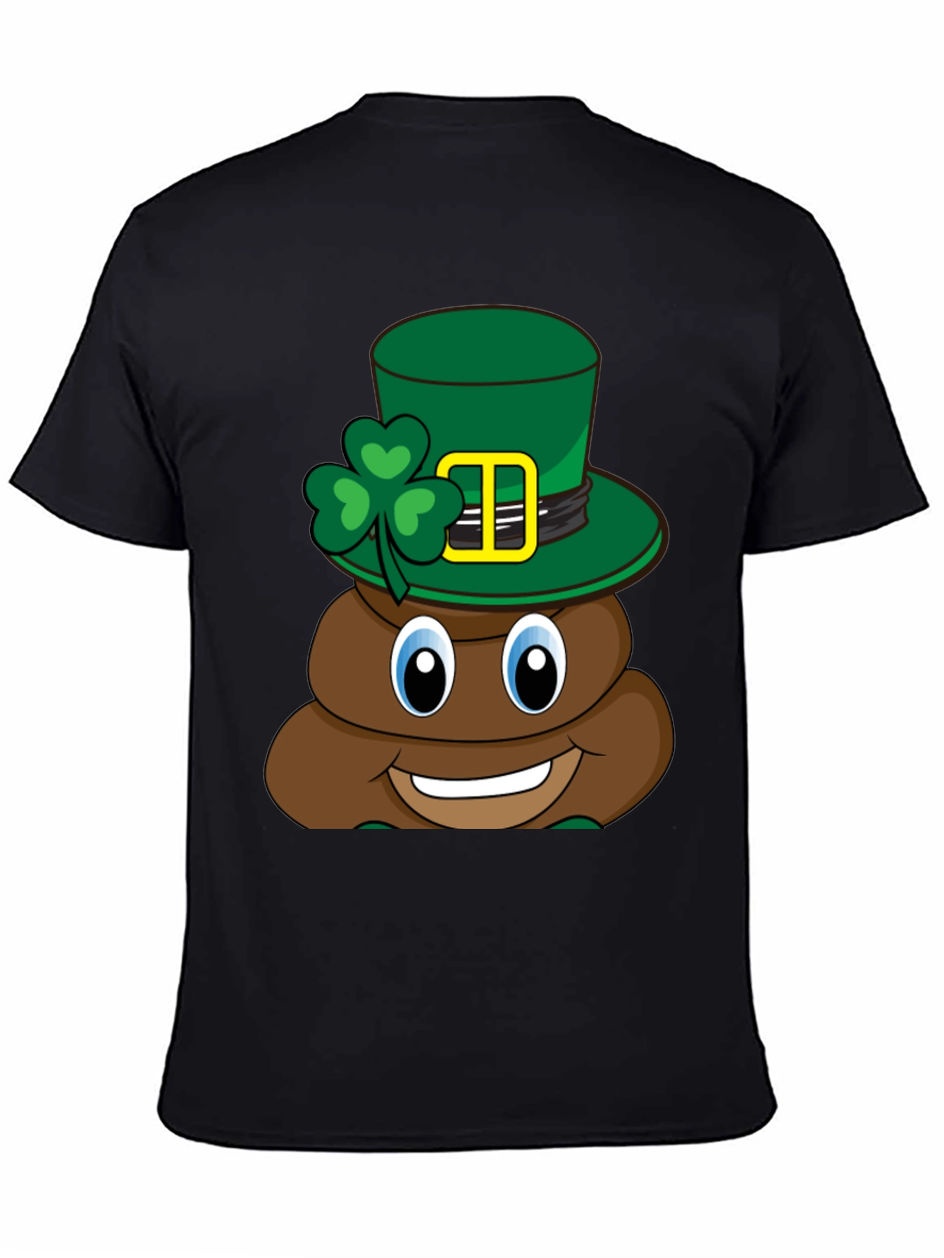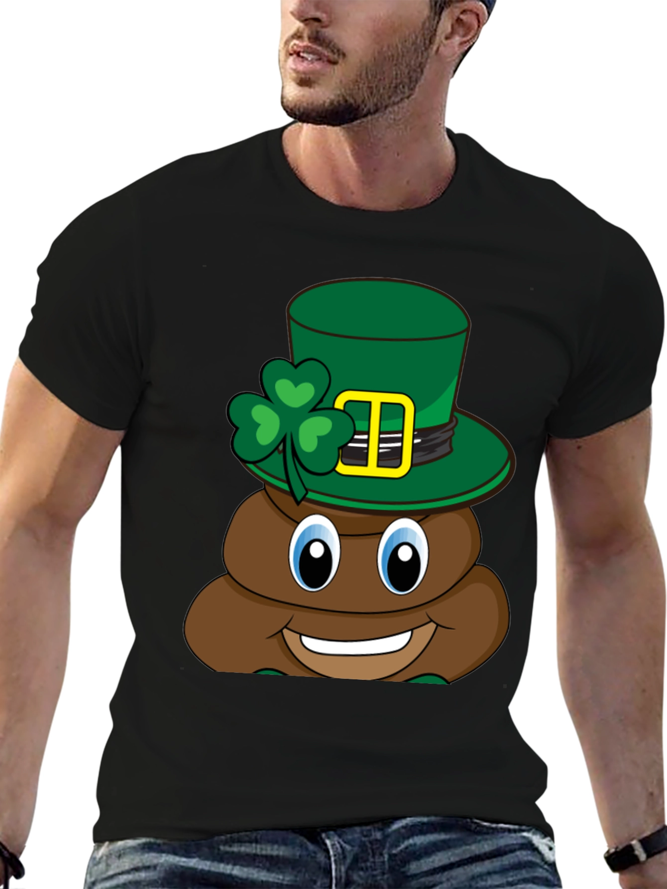 Show off your playful side with this fun black t-shirt featuring a whimsical cartoon poop character decked out in a festive green St. Patrick's Day hat with a shamrock! The unique design is sure to bring a smile to faces and spread some holiday cheer. Made from a comfortable, breathable fabric, this tee is perfect for casual wear, St. Paddy's Day parties, or as a novelty gift for those with a good sense of humor. Stand out from the crowd and celebrate St. Patrick's Day in a fun, unexpected way with this eye-catching t-shirt.