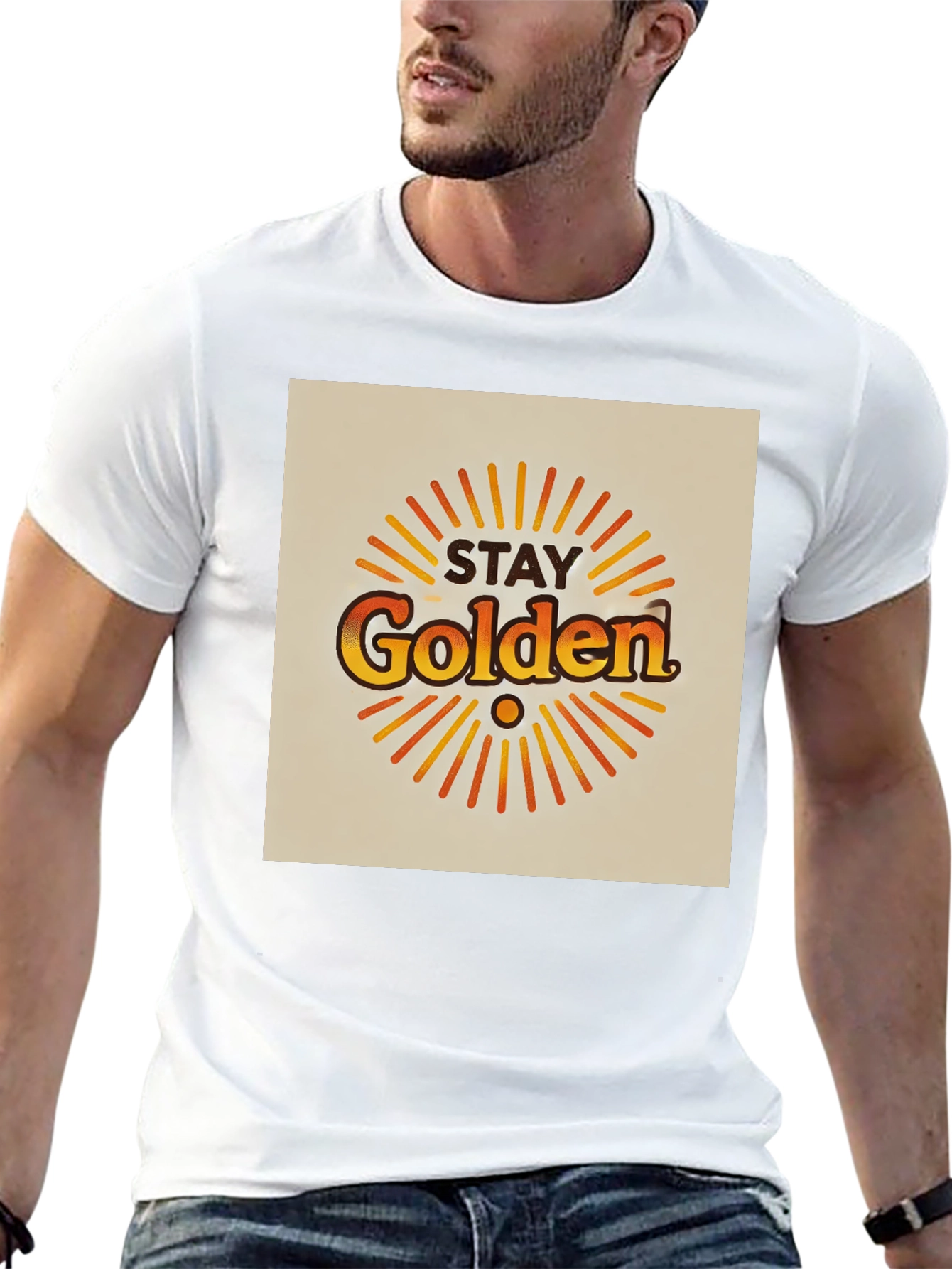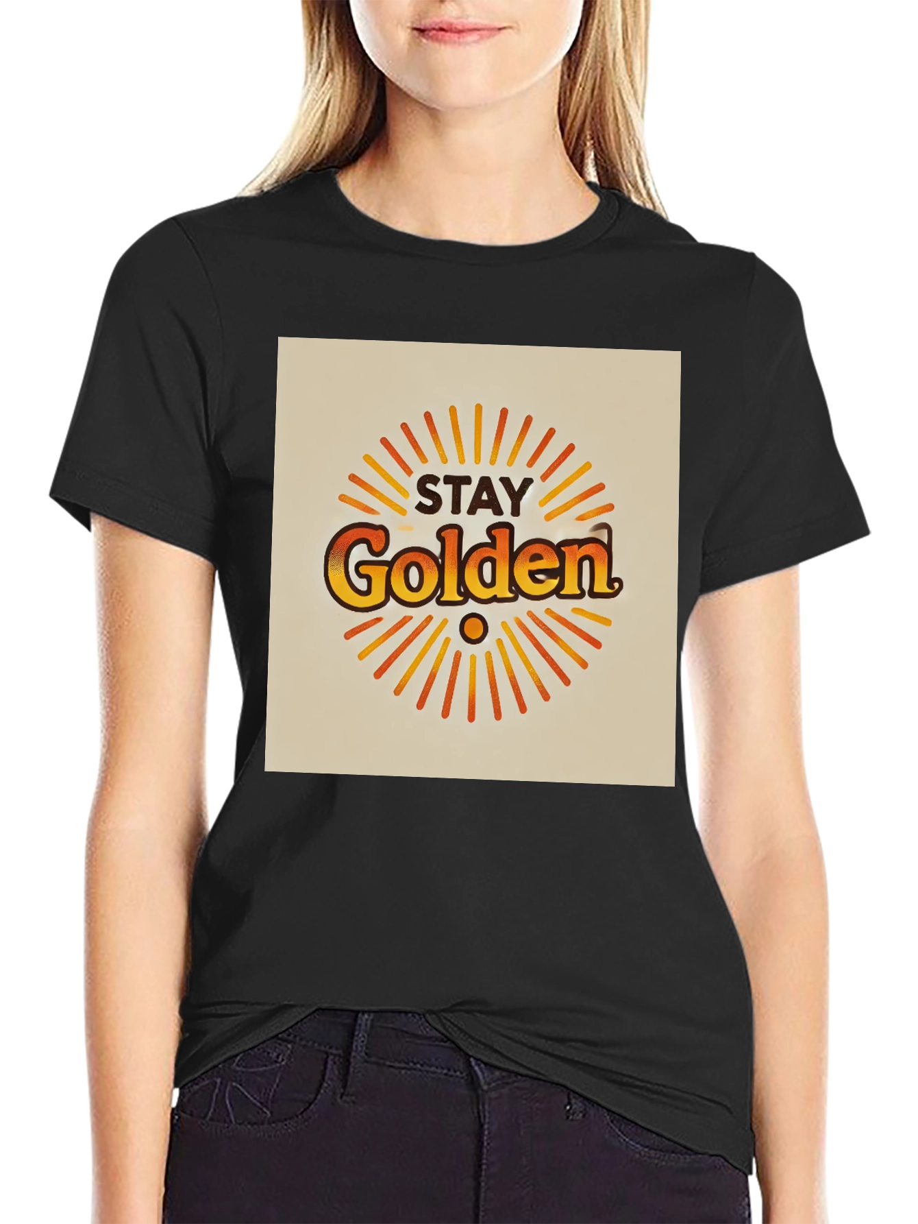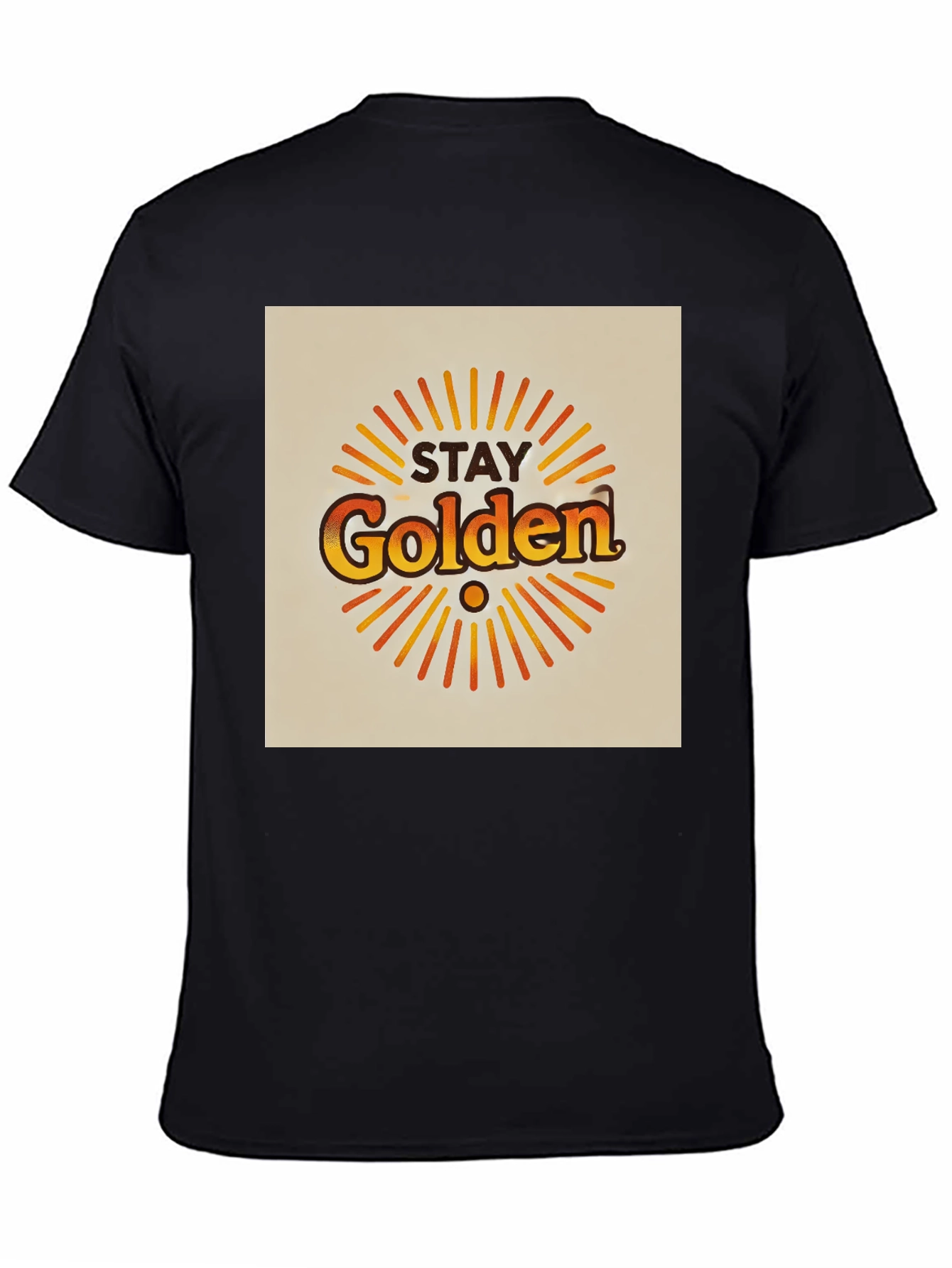 Embrace a vintage vibe with this classic black t-shirt featuring a 'Stay Golden' graphic. The design showcases a retro-style sunburst pattern in warm tones of orange and gold, evoking a sense of nostalgia. Made from a comfortable material, this shirt is perfect for everyday wear. Pair it with jeans or shorts for a casual look, or dress it up with a blazer for a night out. Show off your unique style and radiate positivity with this eye-catching tee. Ideal for those who love retro designs and motivational messages.