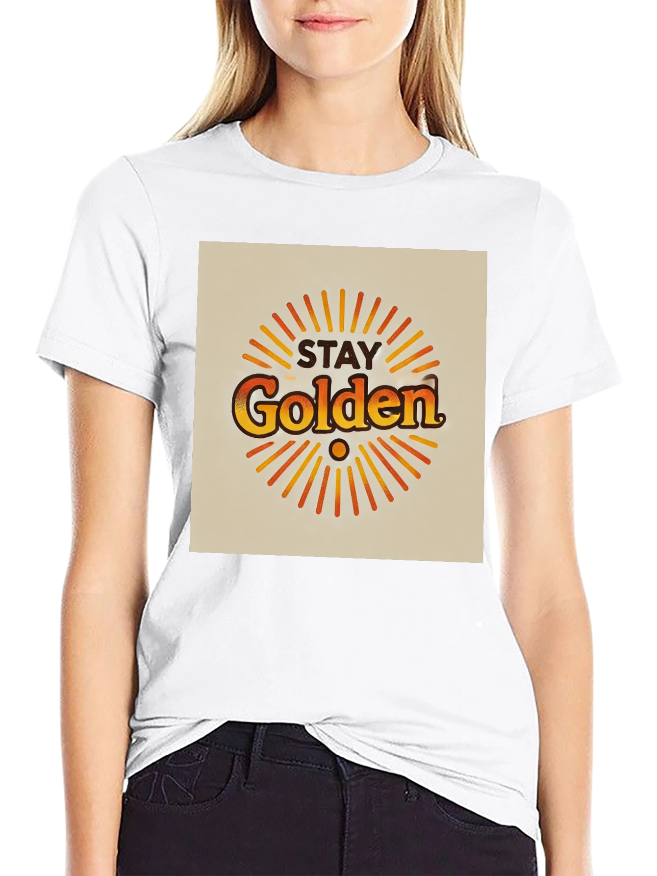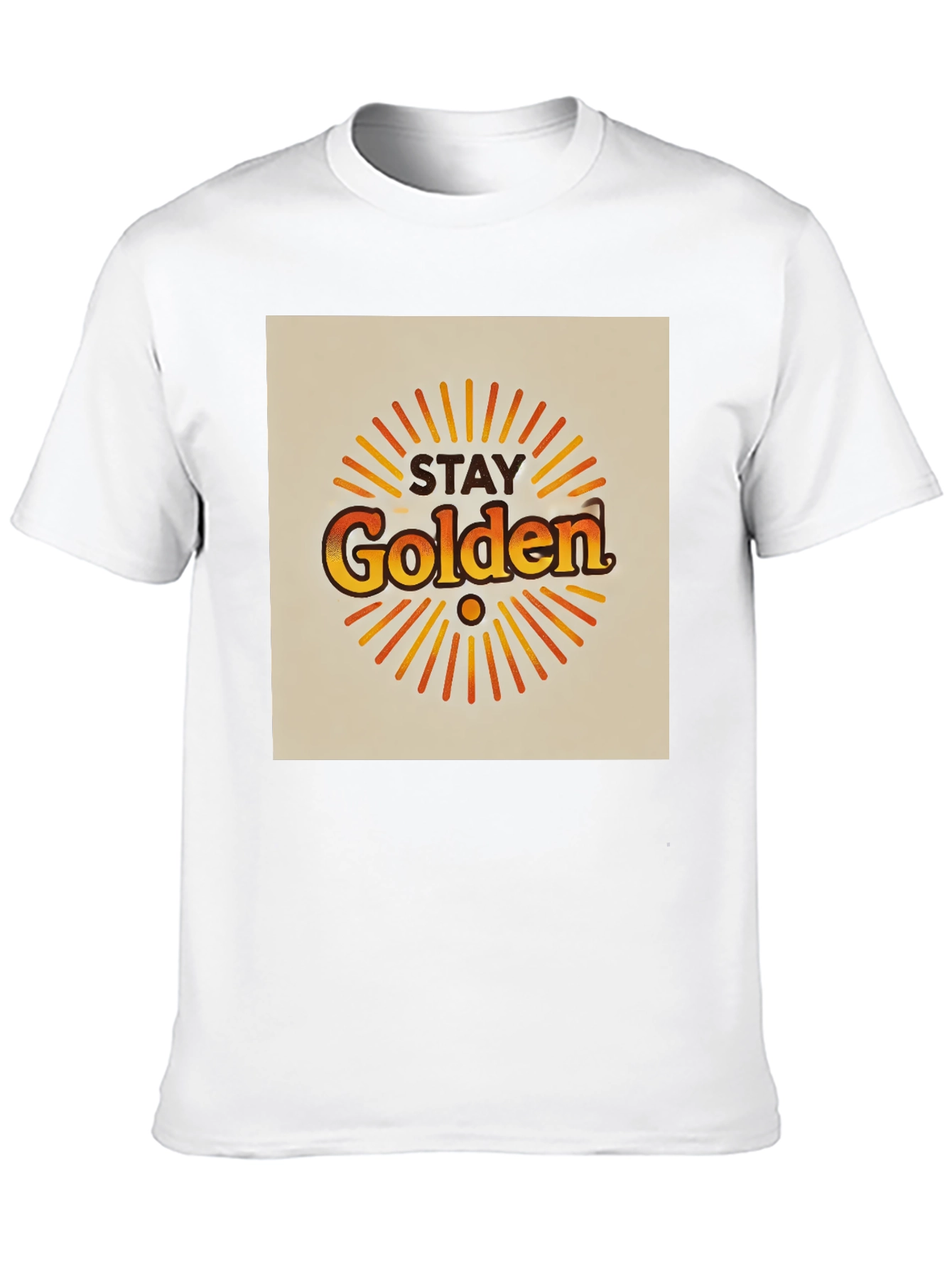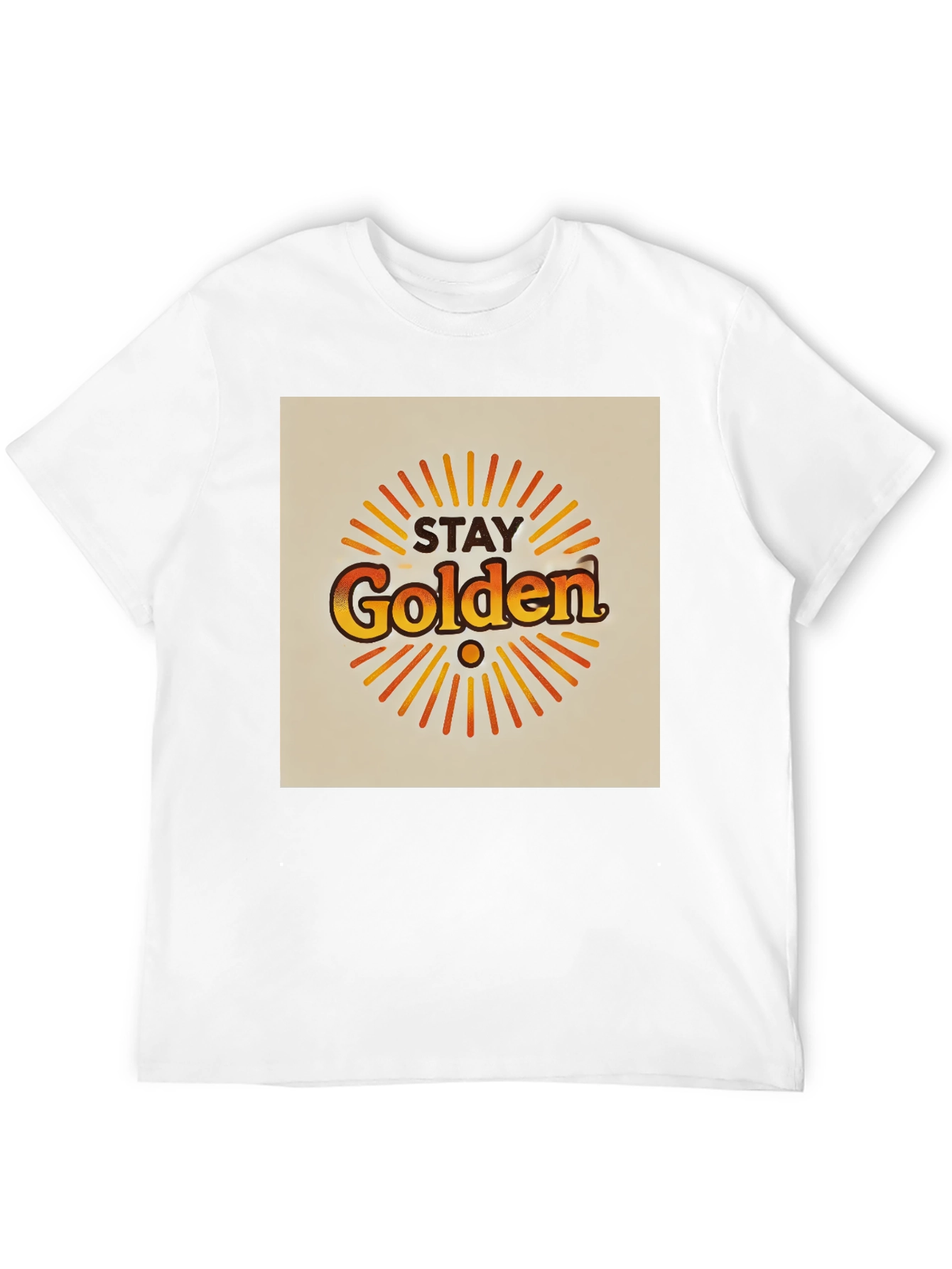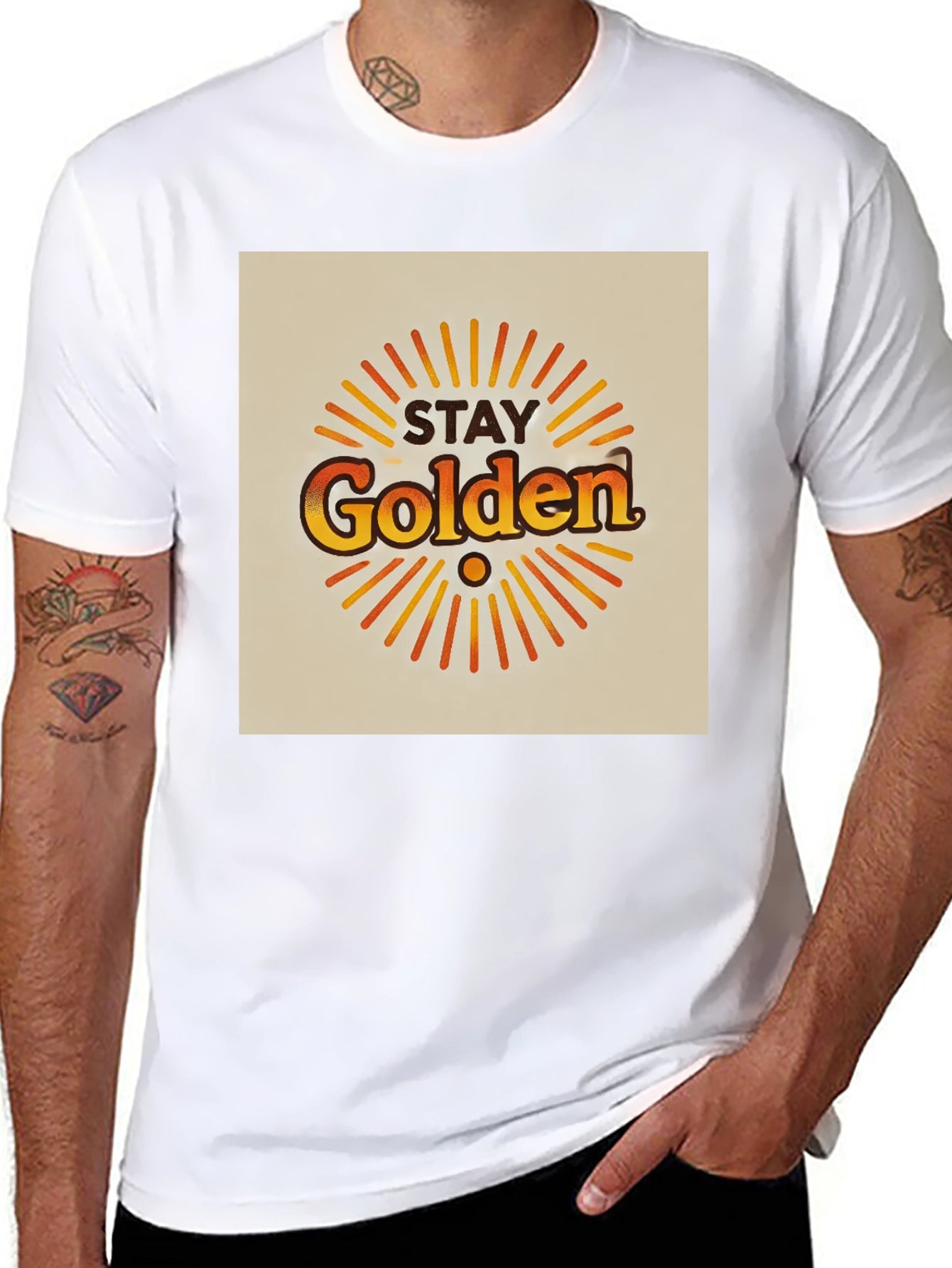 Embrace a vintage vibe with this classic black t-shirt featuring a 'Stay Golden' graphic. The design showcases a retro-style sunburst pattern in warm tones of orange and gold, evoking a sense of nostalgia. Made from a comfortable material, this shirt is perfect for everyday wear. Pair it with jeans or shorts for a casual look, or dress it up with a blazer for a night out. Show off your unique style and radiate positivity with this eye-catching tee. Ideal for those who love retro designs and motivational messages.