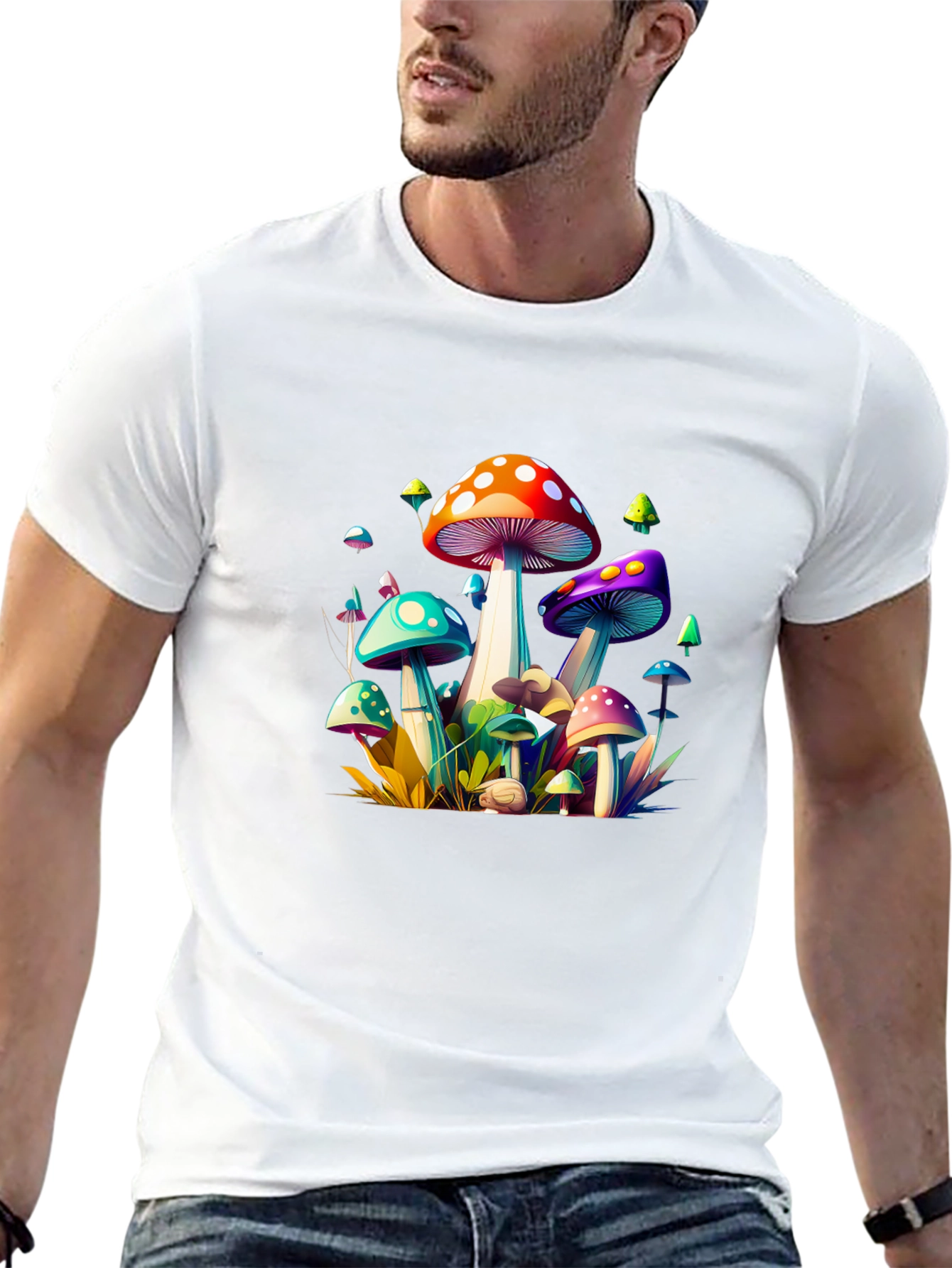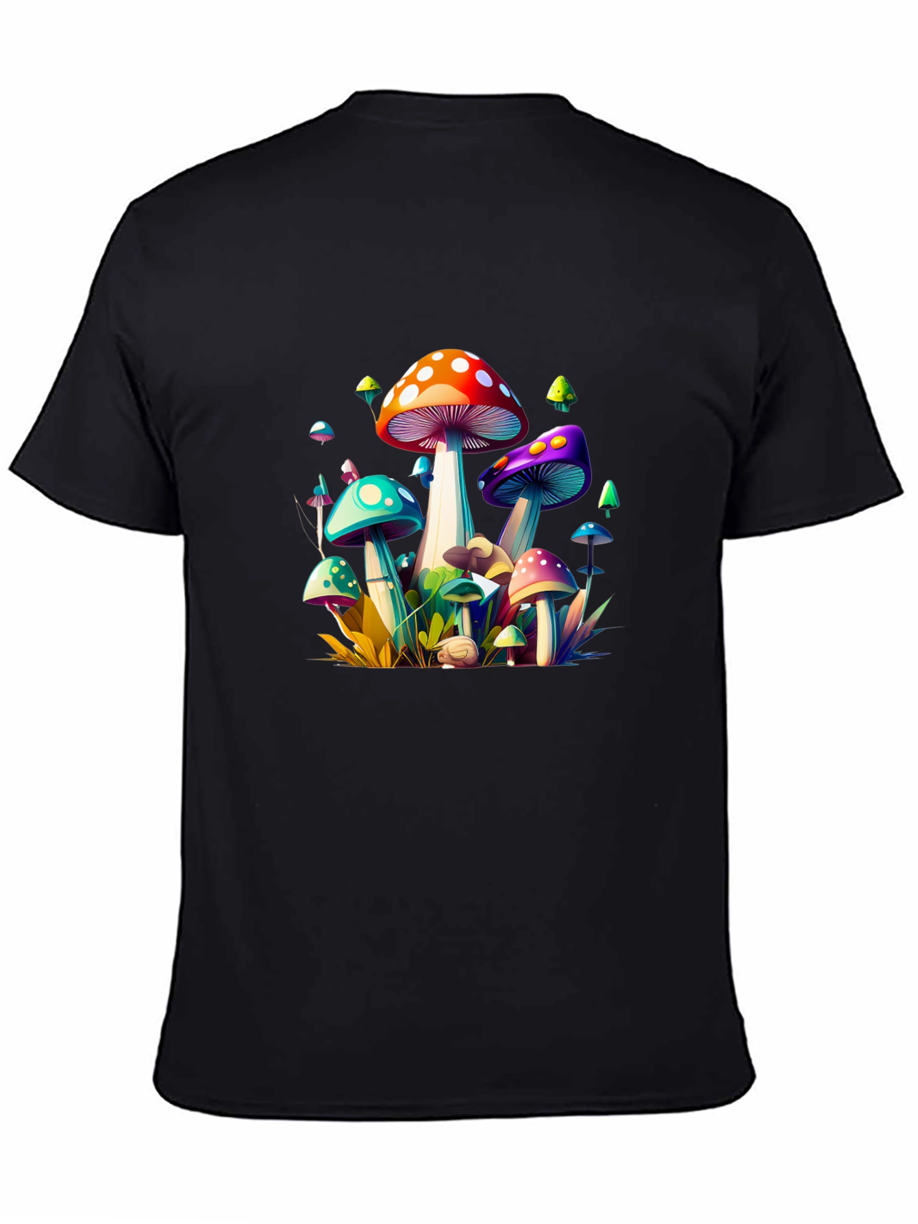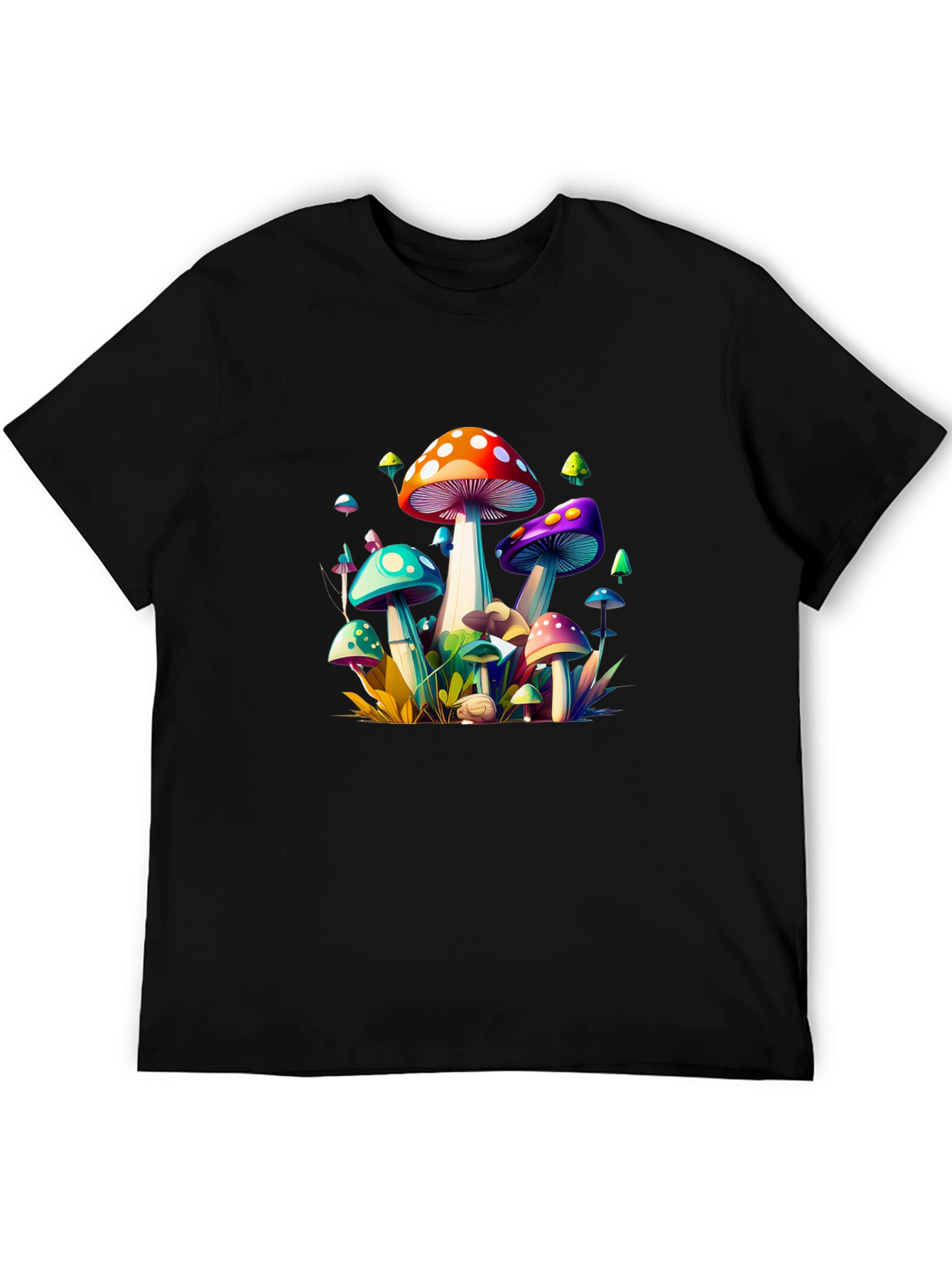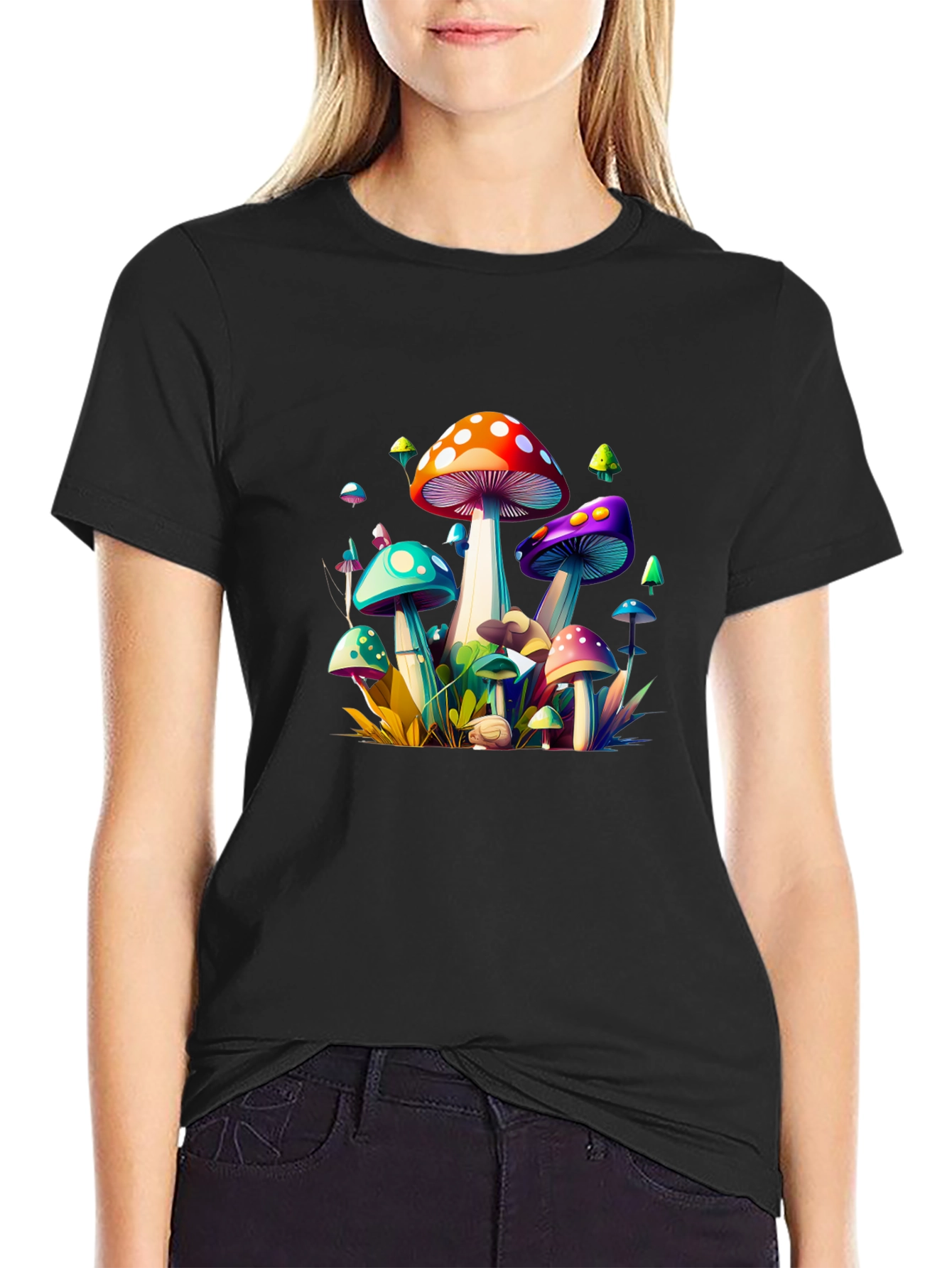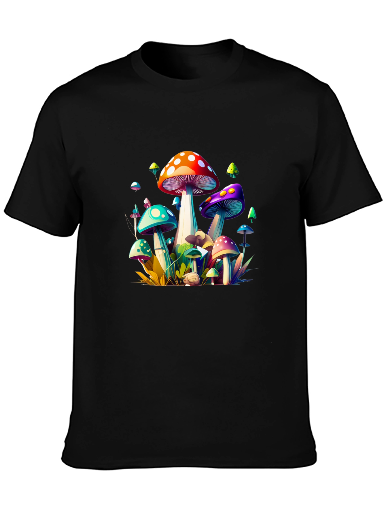 This eye-catching black tee features a whimsical cluster of colorful mushrooms. The vibrant graphic design pops against the dark fabric, showcasing a variety of fungi in shades of orange, purple, teal, and green. Perfect for nature lovers, festival goers, or anyone looking to add a touch of psychedelic style to their wardrobe. The shirt appears to be made from a comfortable, breathable material, suitable for everyday wear. Stand out from the crowd with this unique and playful graphic tee, sure to spark conversation and turn heads wherever you go.