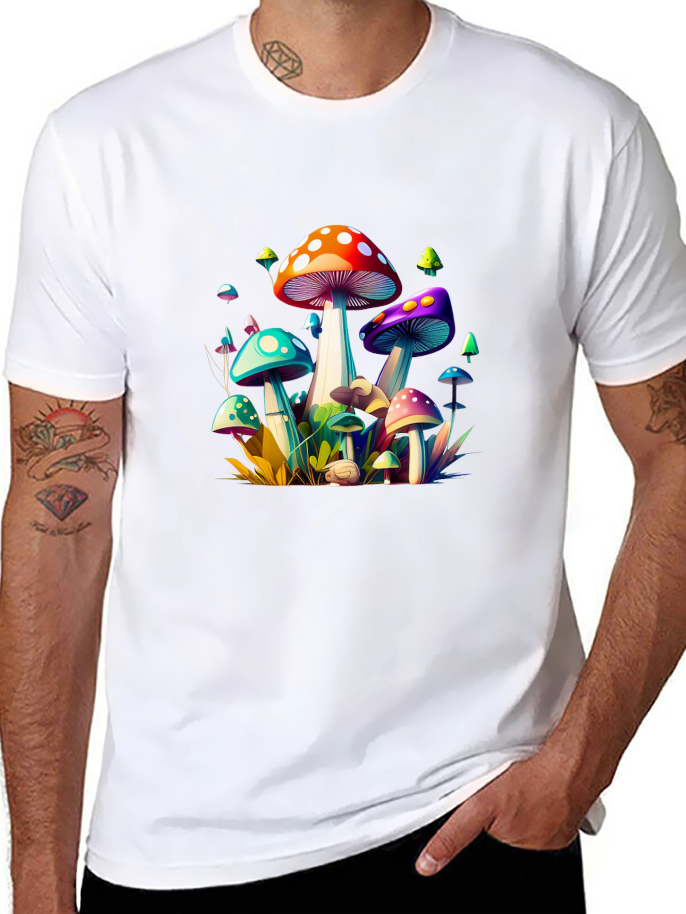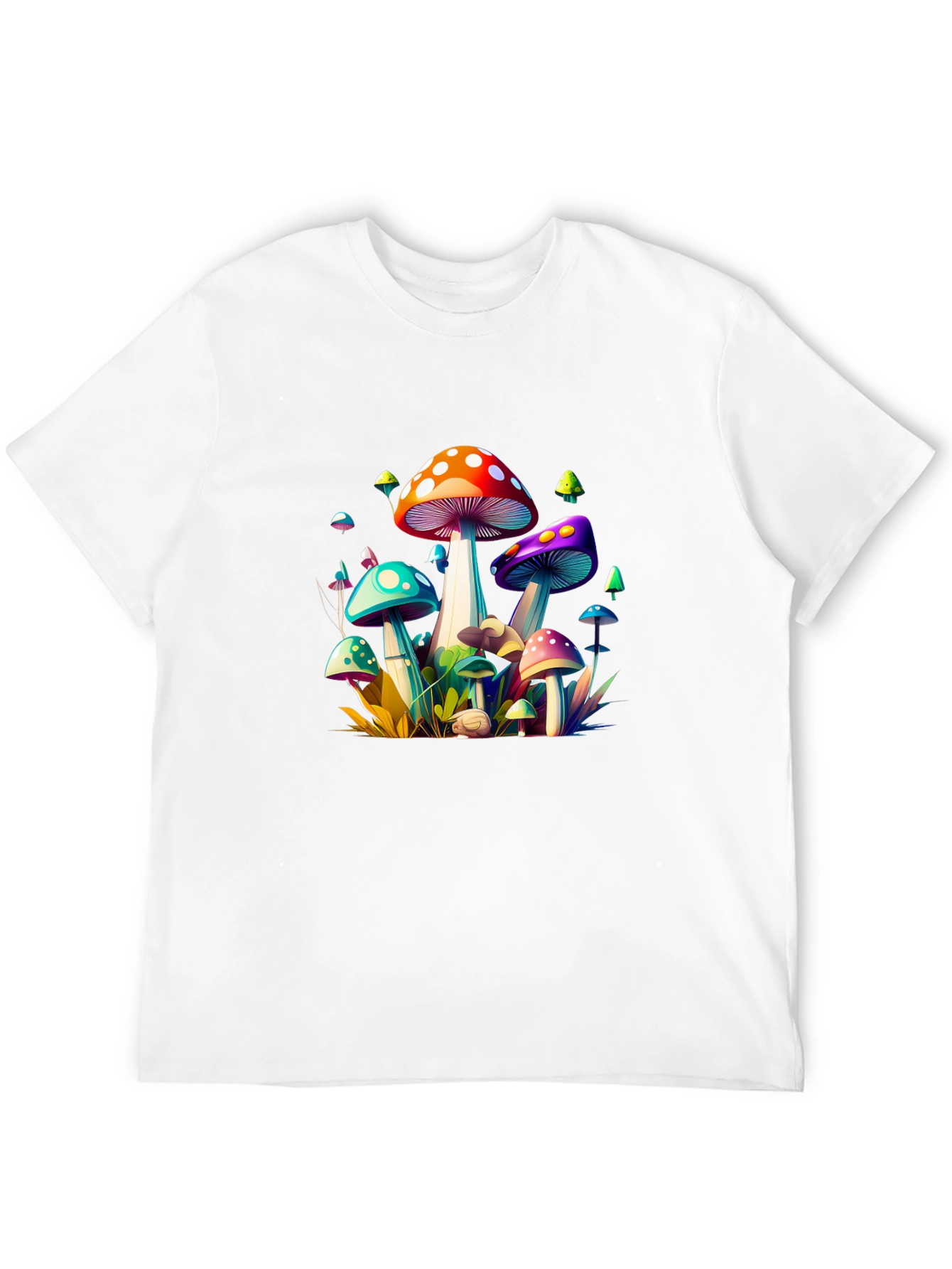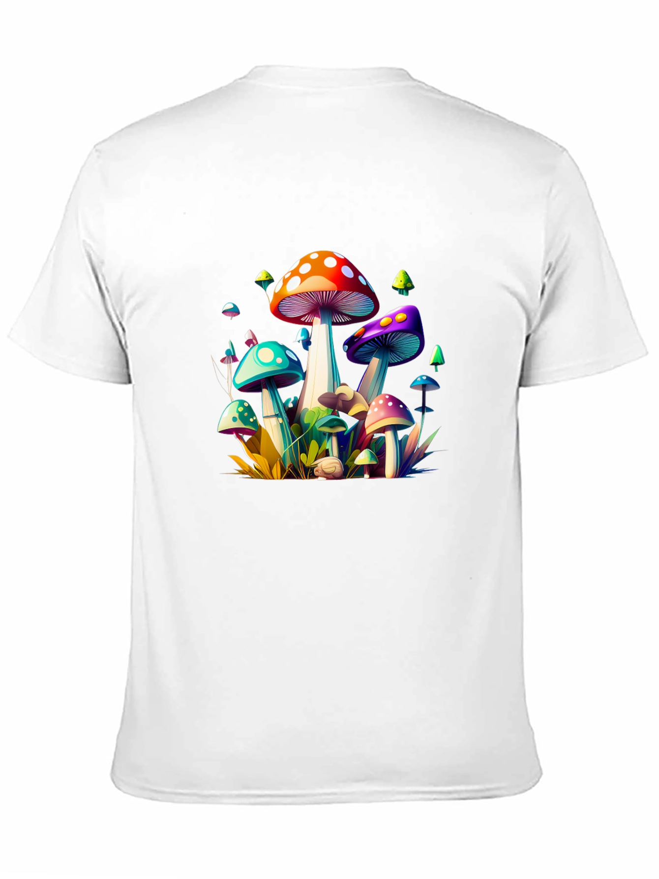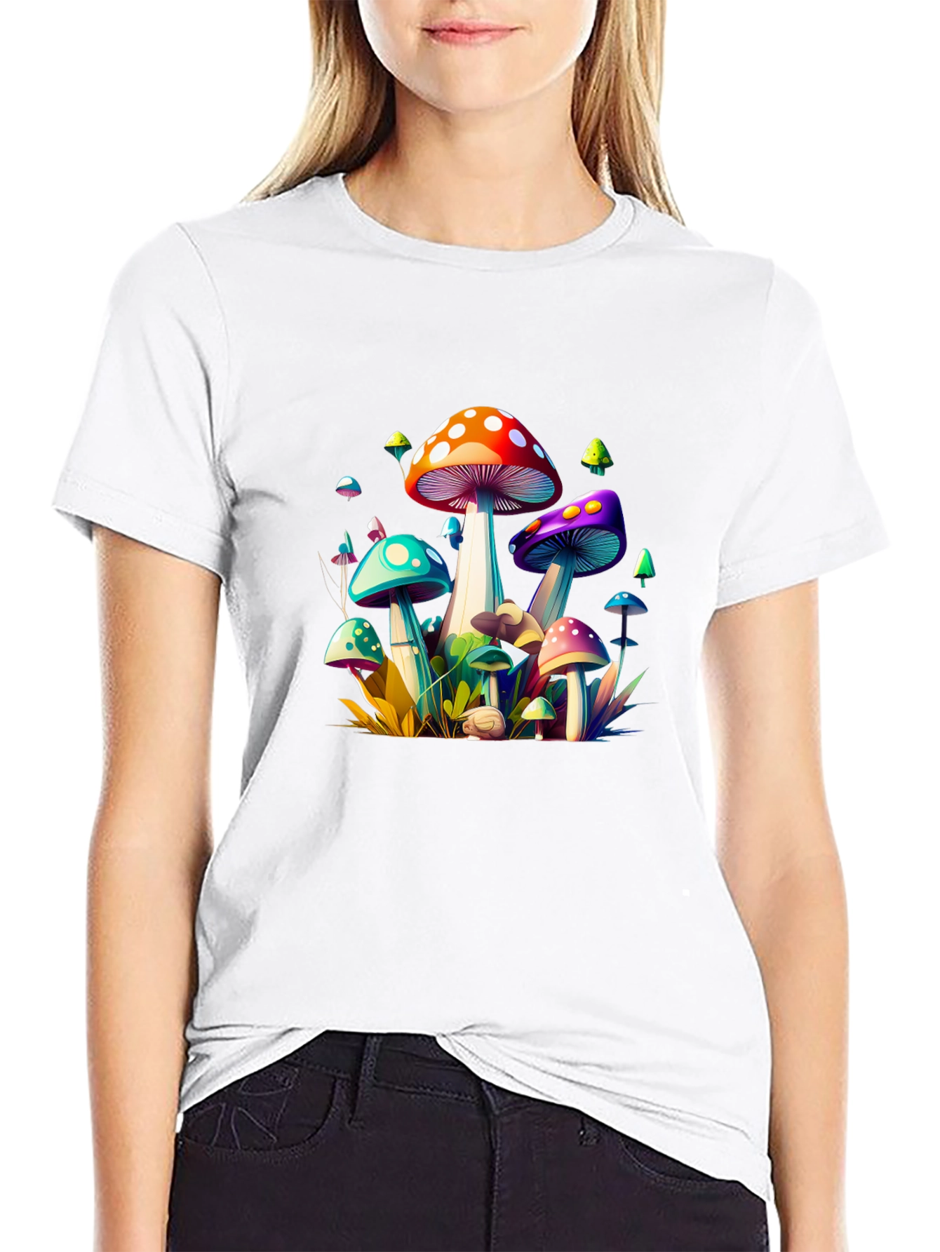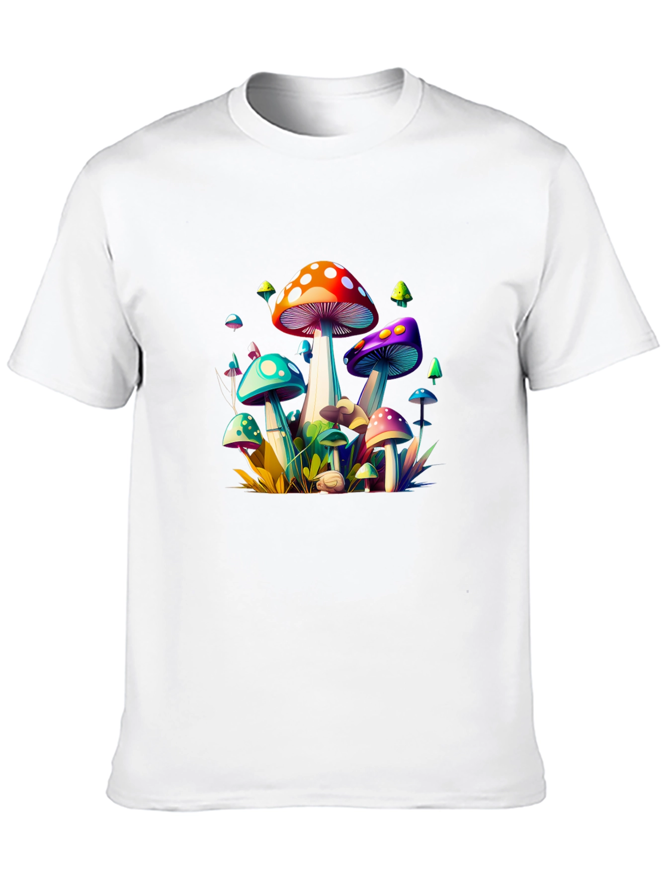 This eye-catching black tee features a whimsical cluster of colorful mushrooms. The vibrant graphic design pops against the dark fabric, showcasing a variety of fungi in shades of orange, purple, teal, and green. Perfect for nature lovers, festival goers, or anyone looking to add a touch of psychedelic style to their wardrobe. The shirt appears to be made from a comfortable, breathable material, suitable for everyday wear. Stand out from the crowd with this unique and playful graphic tee, sure to spark conversation and turn heads wherever you go.