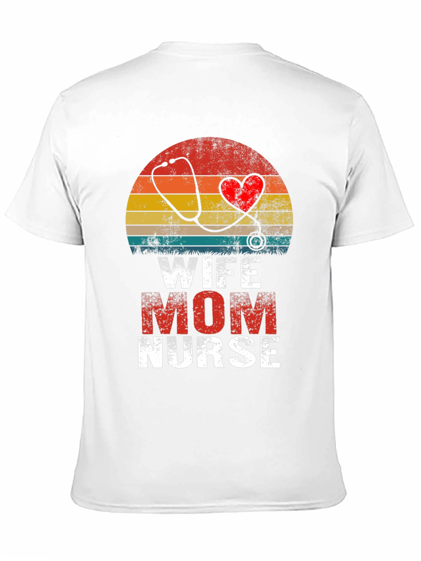 Show off your pride with this stylish "Wife Mom Nurse" graphic t-shirt. This black tee features a distressed retro sunset design with a stethoscope forming a heart shape, celebrating the multiple roles of a caring woman. Perfect for casual wear, it¡¯s a comfortable and expressive way to showcase your dedication as a wife, mother, and nurse. Ideal for healthcare professionals or anyone proud of these roles. This eye-catching design is sure to spark conversations and make a statement. A great gift option for the superwoman in your life!