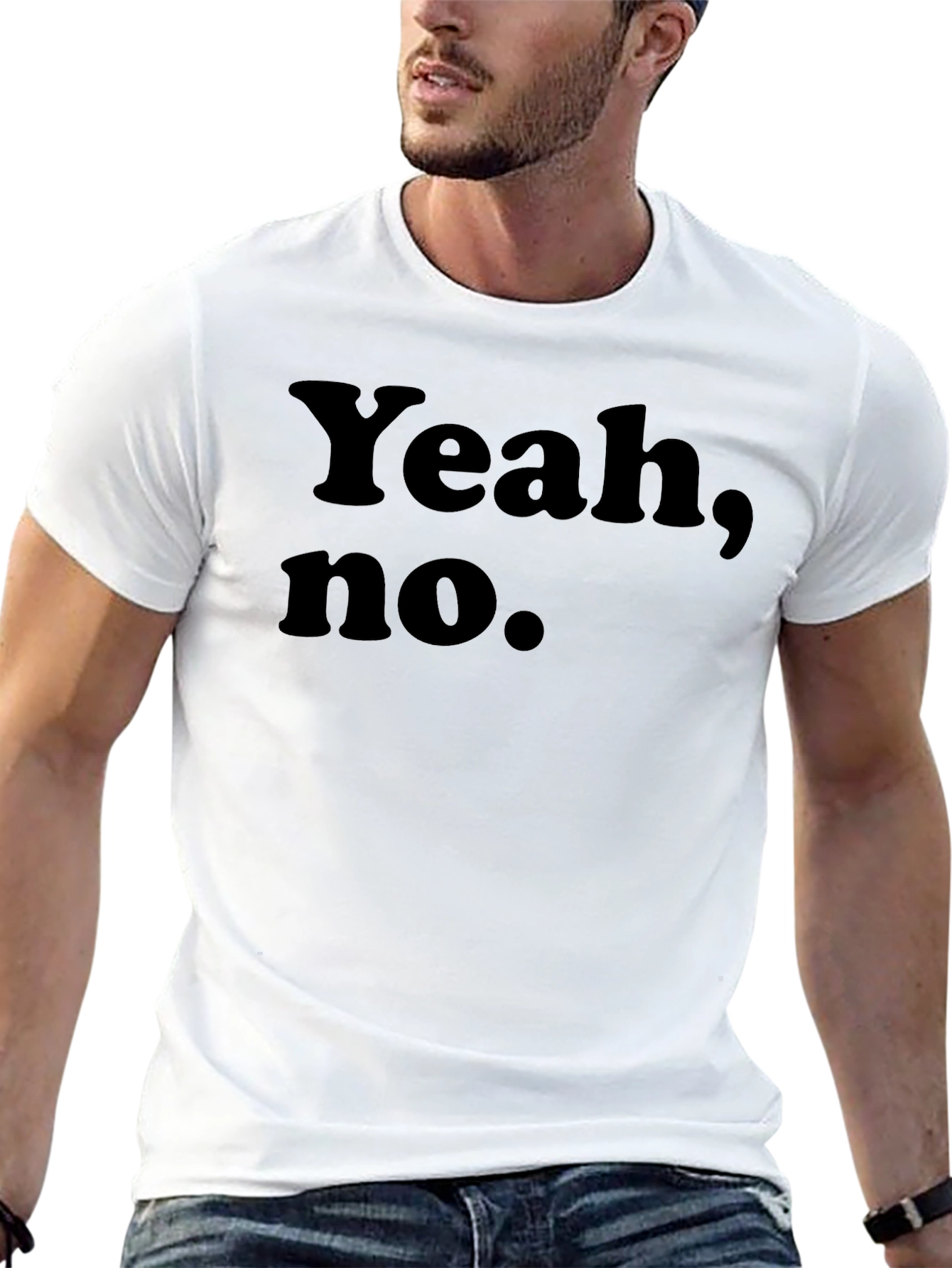 Express your witty side with this bold 'Yeah, no.' graphic tee. Made from a comfortable, soft fabric (material not specified), this classic crewneck T-shirt features a clean, minimalist design with a playful, slightly sarcastic message. The unisex cut makes it a versatile addition to any wardrobe, perfect for casual outings, lounging at home, or making a statement. Pair it with jeans, shorts, or a skirt for an effortless, cool look. The dark color enhances the impact of the message, ensuring you'll stand out with subtle humor. Embrace your individuality and let your T-shirt do the talking!